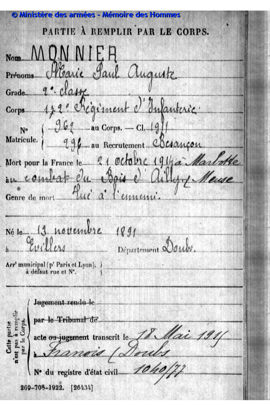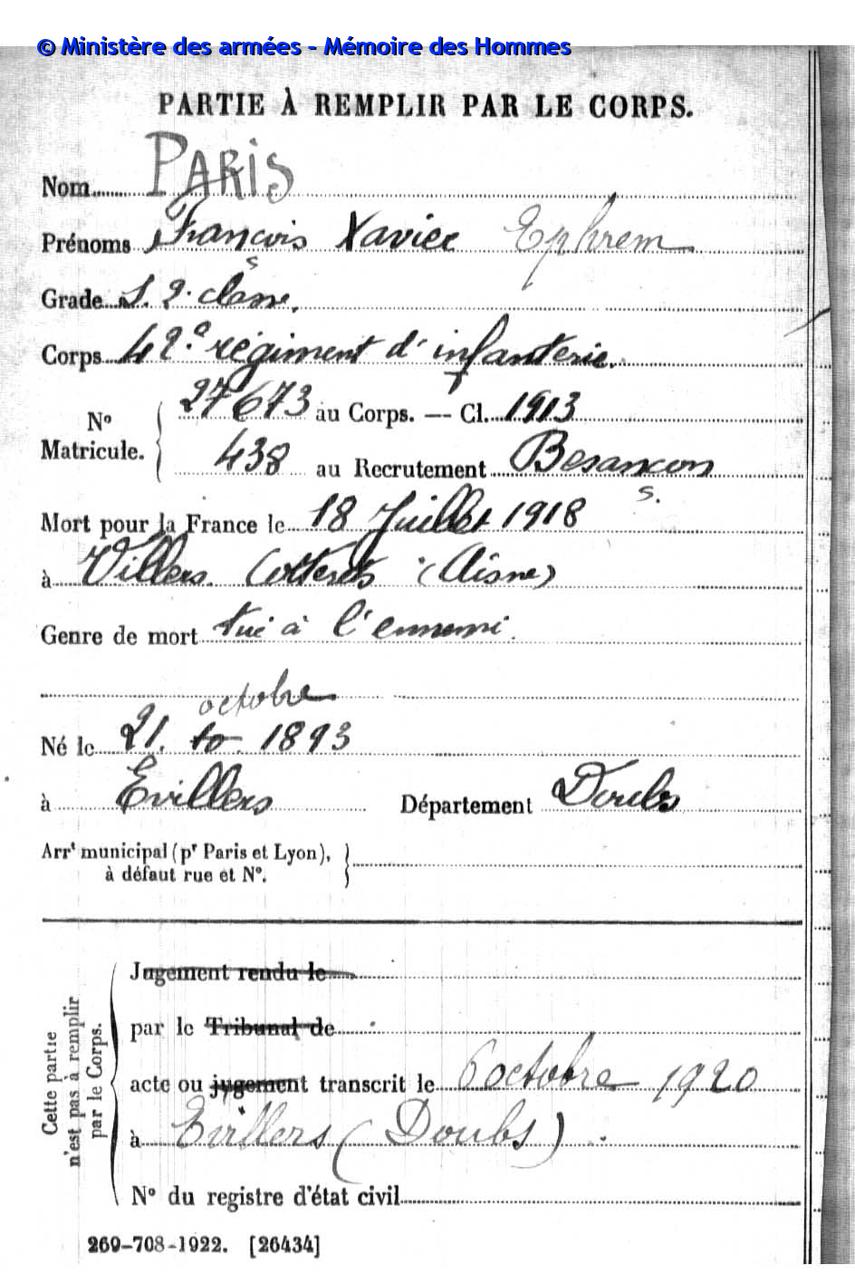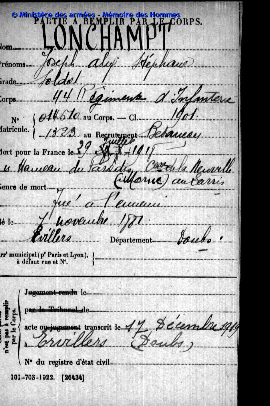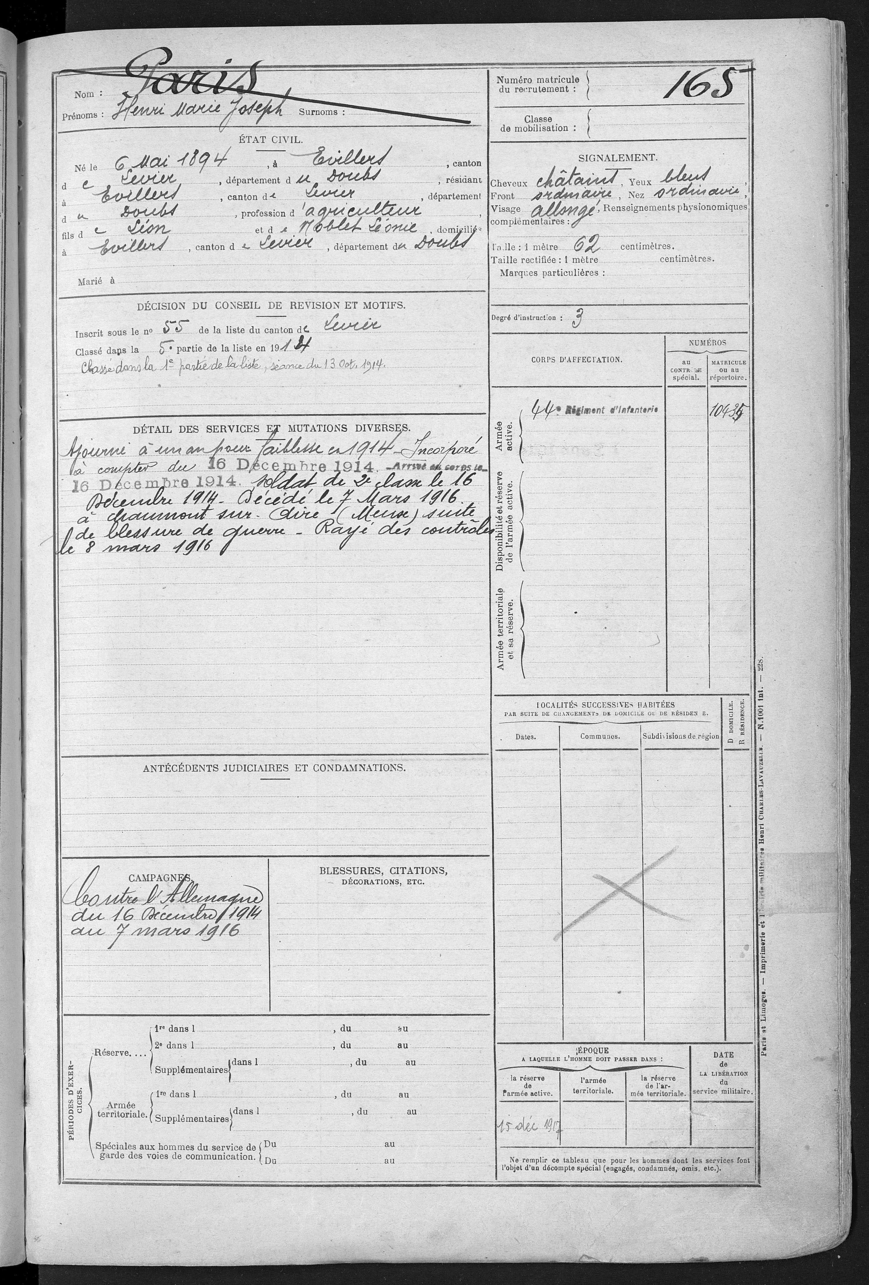 2ème classe PARIS Henri Marie Joseph 06.05.1894 - 07.03.1916 44ème Régiment d'Infanterie Gefallen in Chaumont - Aisne (F) |