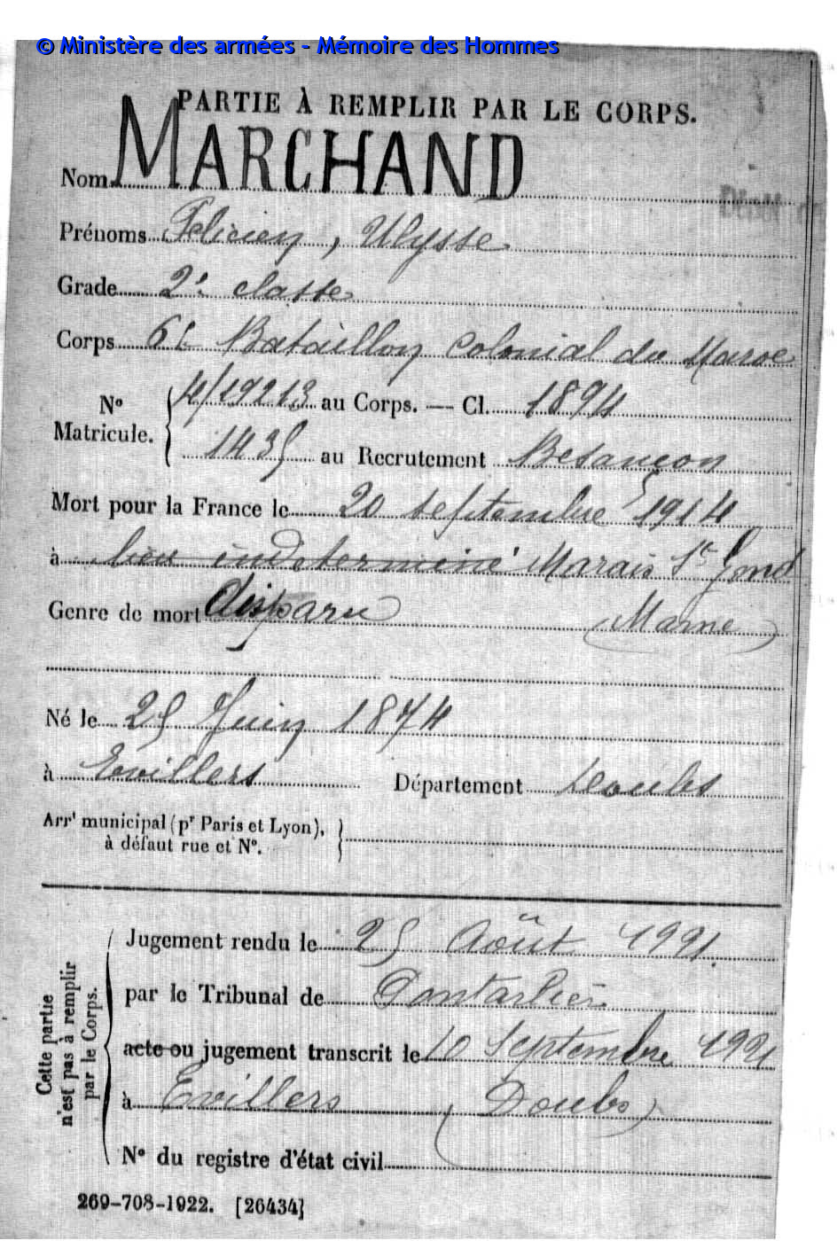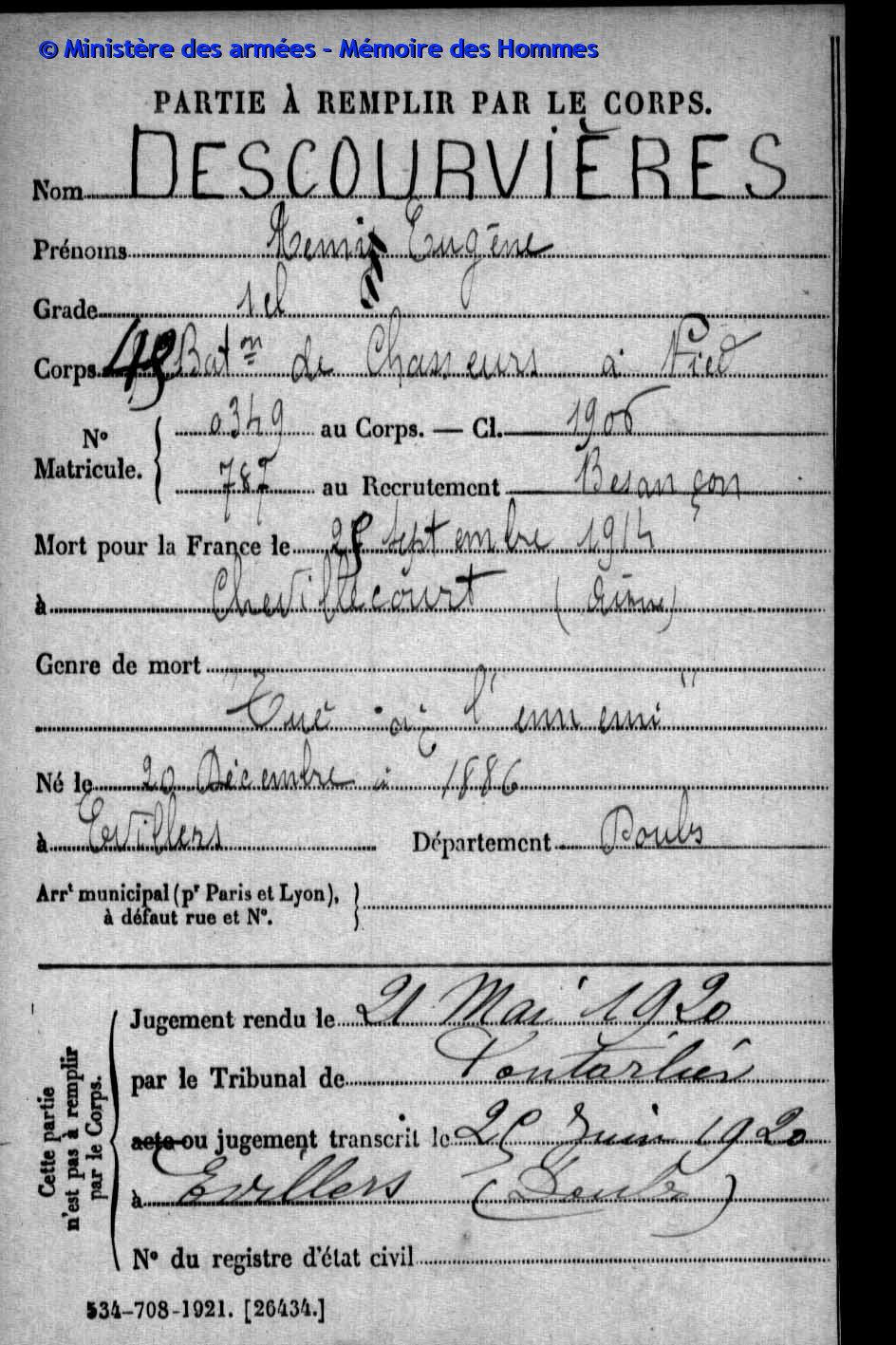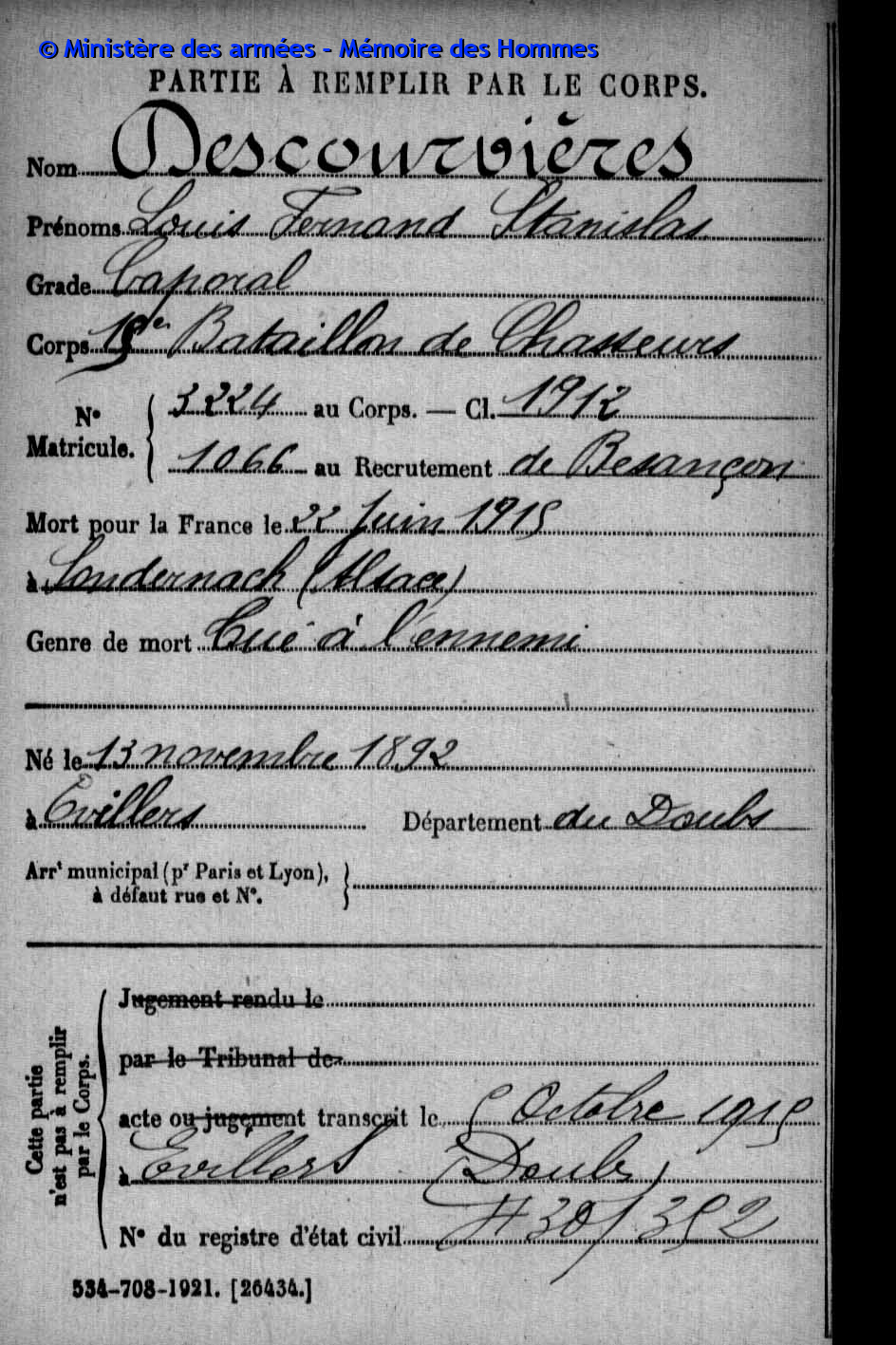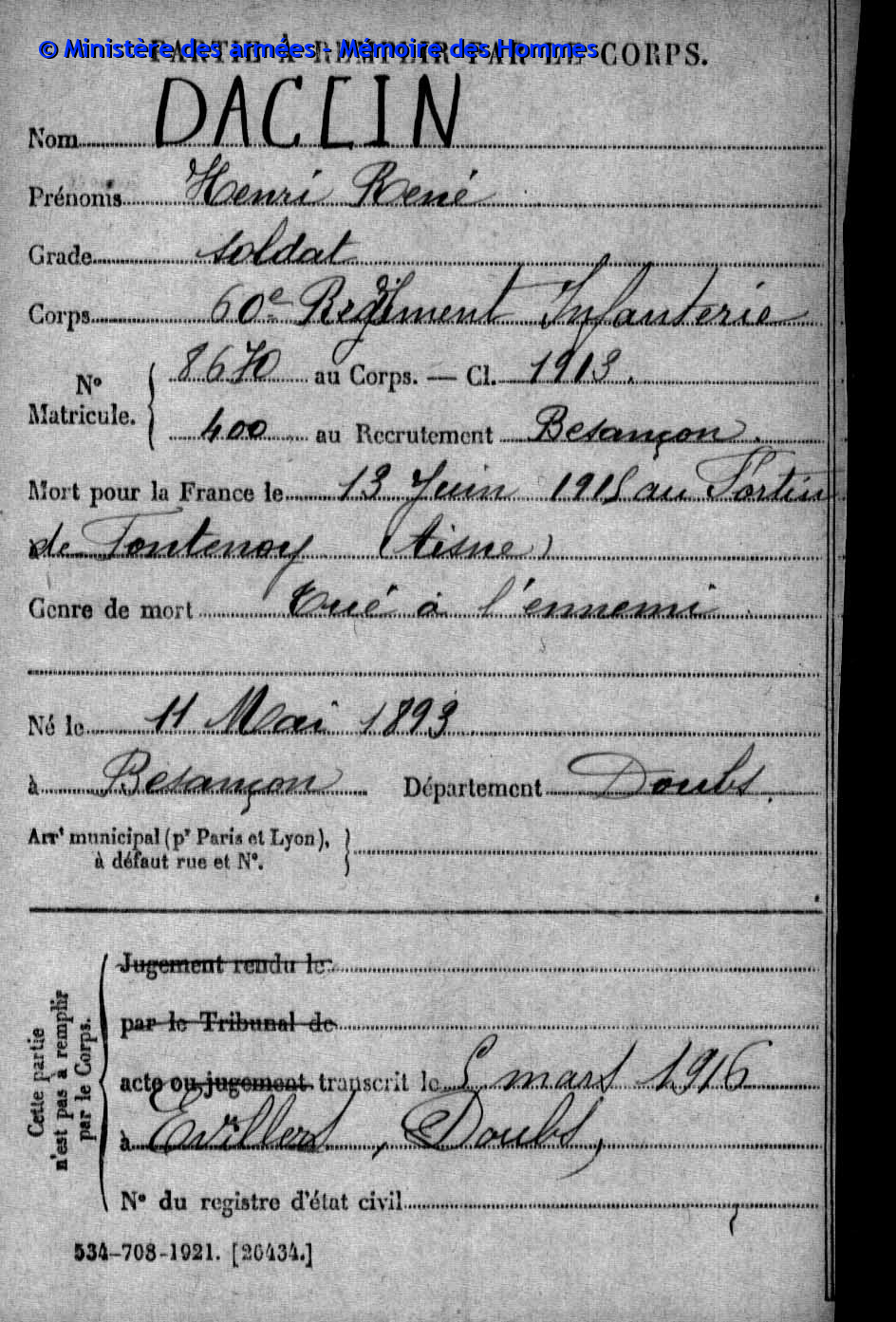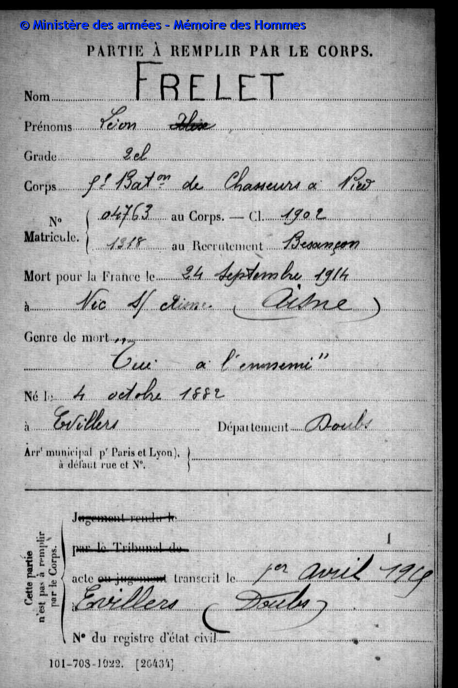 2ème classe PARIS Henri Marie Joseph 06.05.1894 - 07.03.1916 44ème Régiment d'Infanterie Gefallen in Chaumont - Aisne (F) |