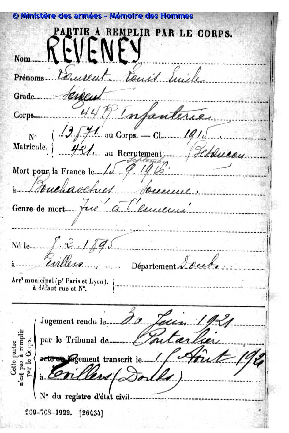 | Sergent REVENEY Laurent Louis Emile 08.02.1895 - 15.09.1916 44ème Régiment d'Infanterie Gefallen in Bouchavesnes - Somme (F) |