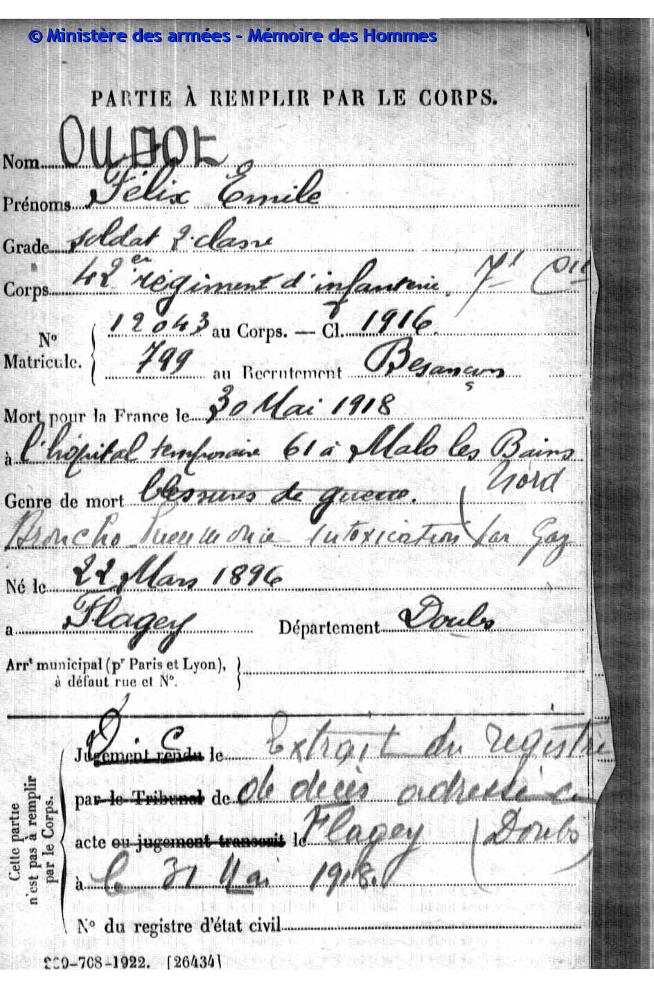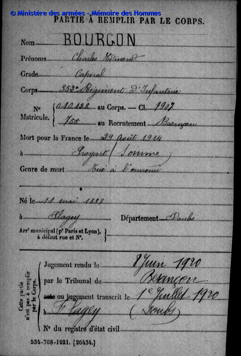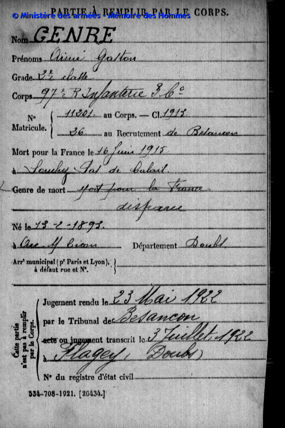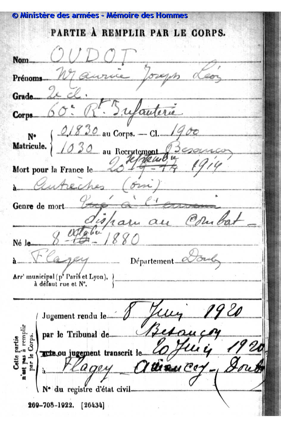 2ème classe OUDOT Maurice Joseph Léon 08.10.1880 - 20.09.1914 60ème Régiment d'Infanterie Gilt als vermisst in Autreches - Oise (F) |