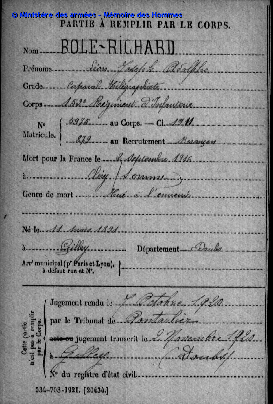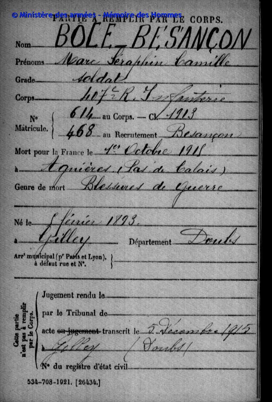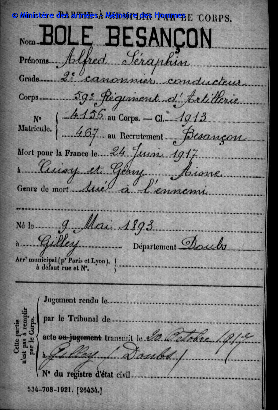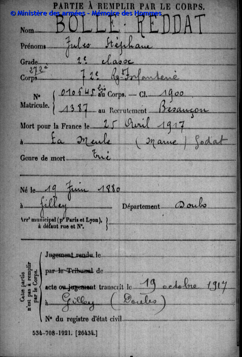 | Soldat BOILLOT Henri Louis Fernand 05.05.1916 - 01.06.1940 4ème Groupe de Reconnaissance d'Infanterie Gefallen an Bord der HMS SCOTIA in Dünkrichen (BE) |