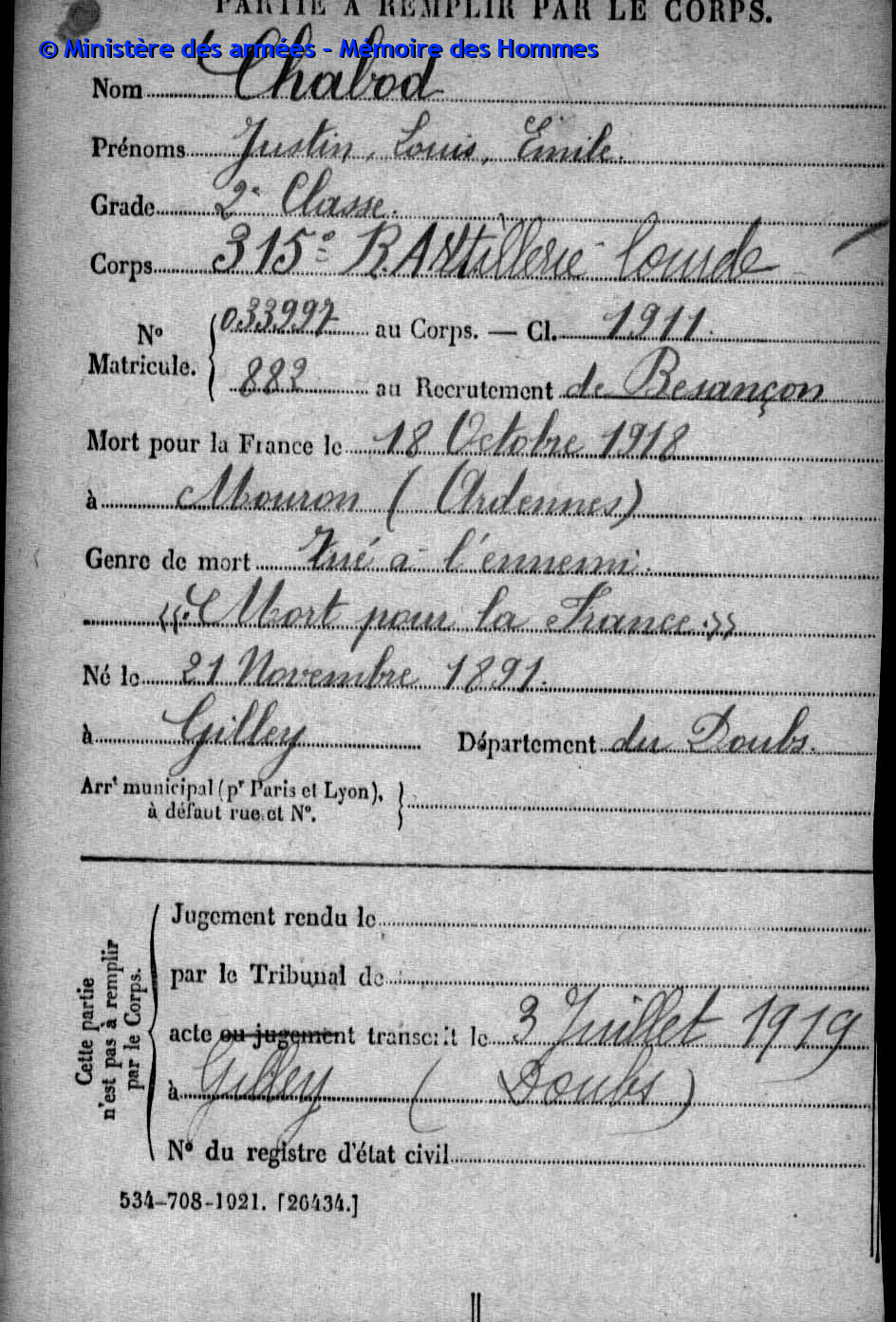 Canonnier TOURIS André Vital 19.08.1912 - 17.06.1940 170ème Régiment d'Artillerie de Position (R.A.P.) Gefallen in Granges-Narboz - Doubs (F) |
