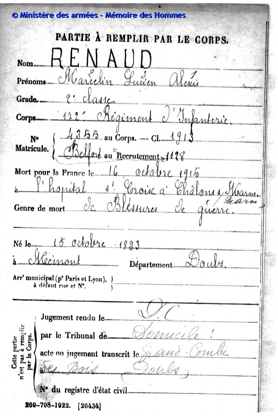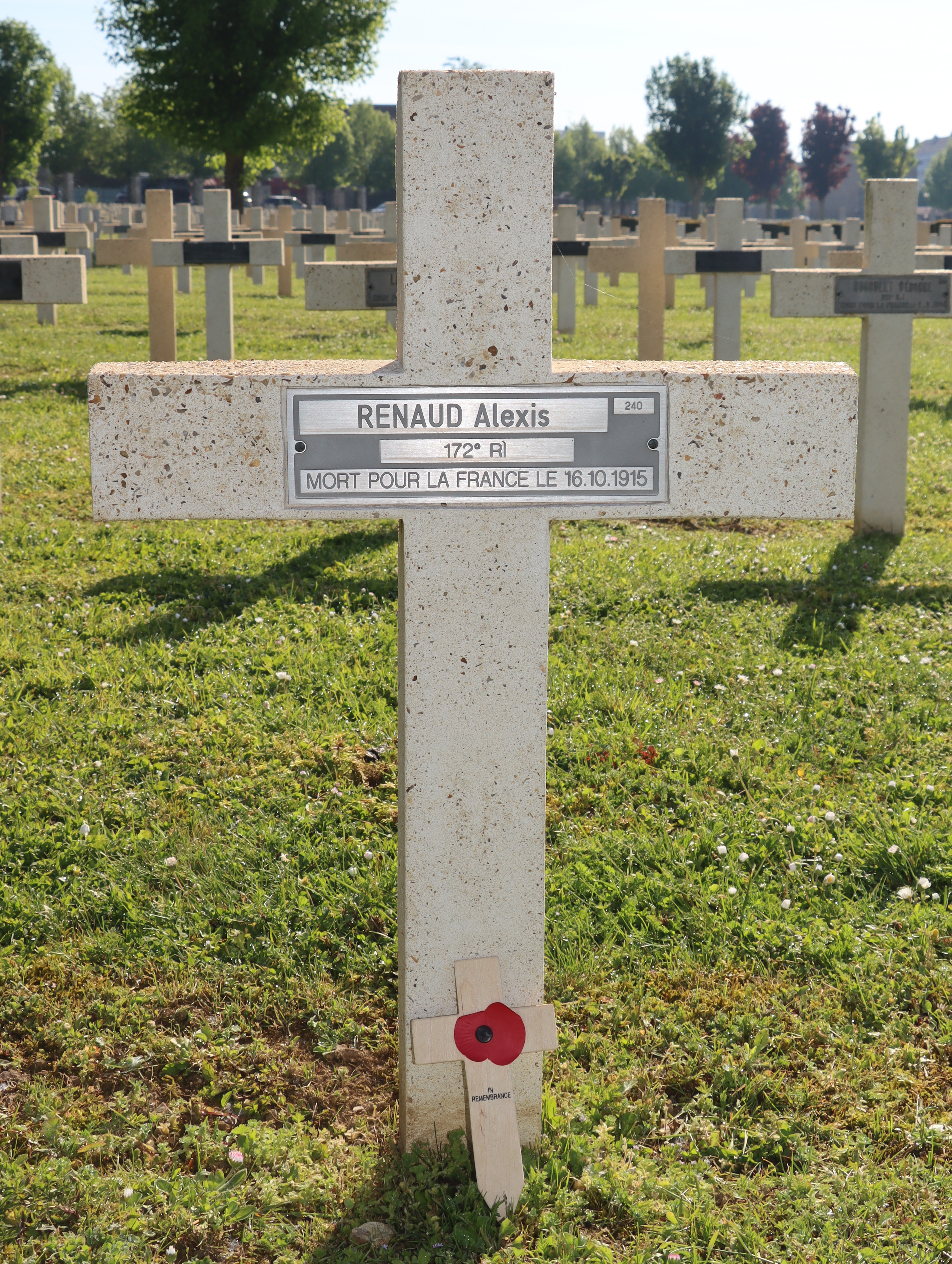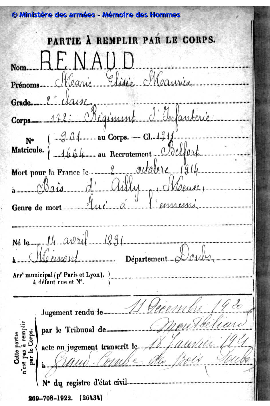 2ème classe RENAUD Marie Elisée Maurice 14.04.1891 - 02.10.1915 172ème Régiment d'Infanterie Gefallen in Han-sur-Mause (F) |