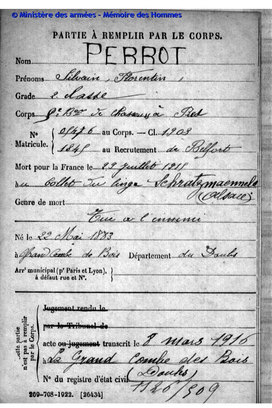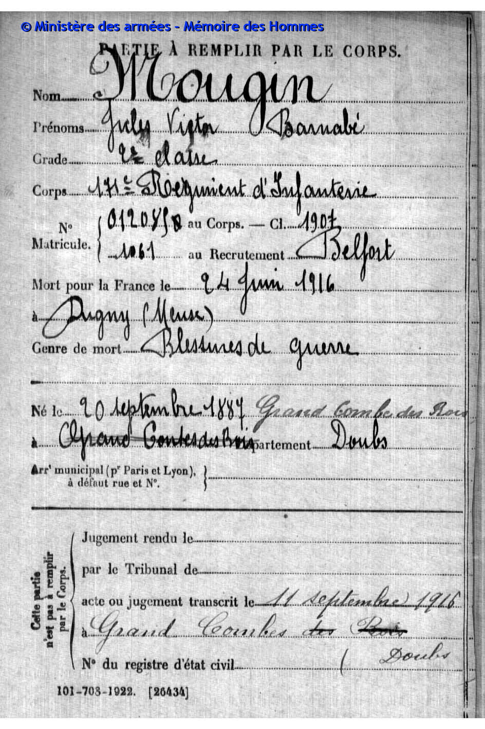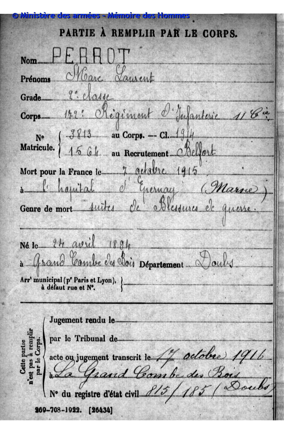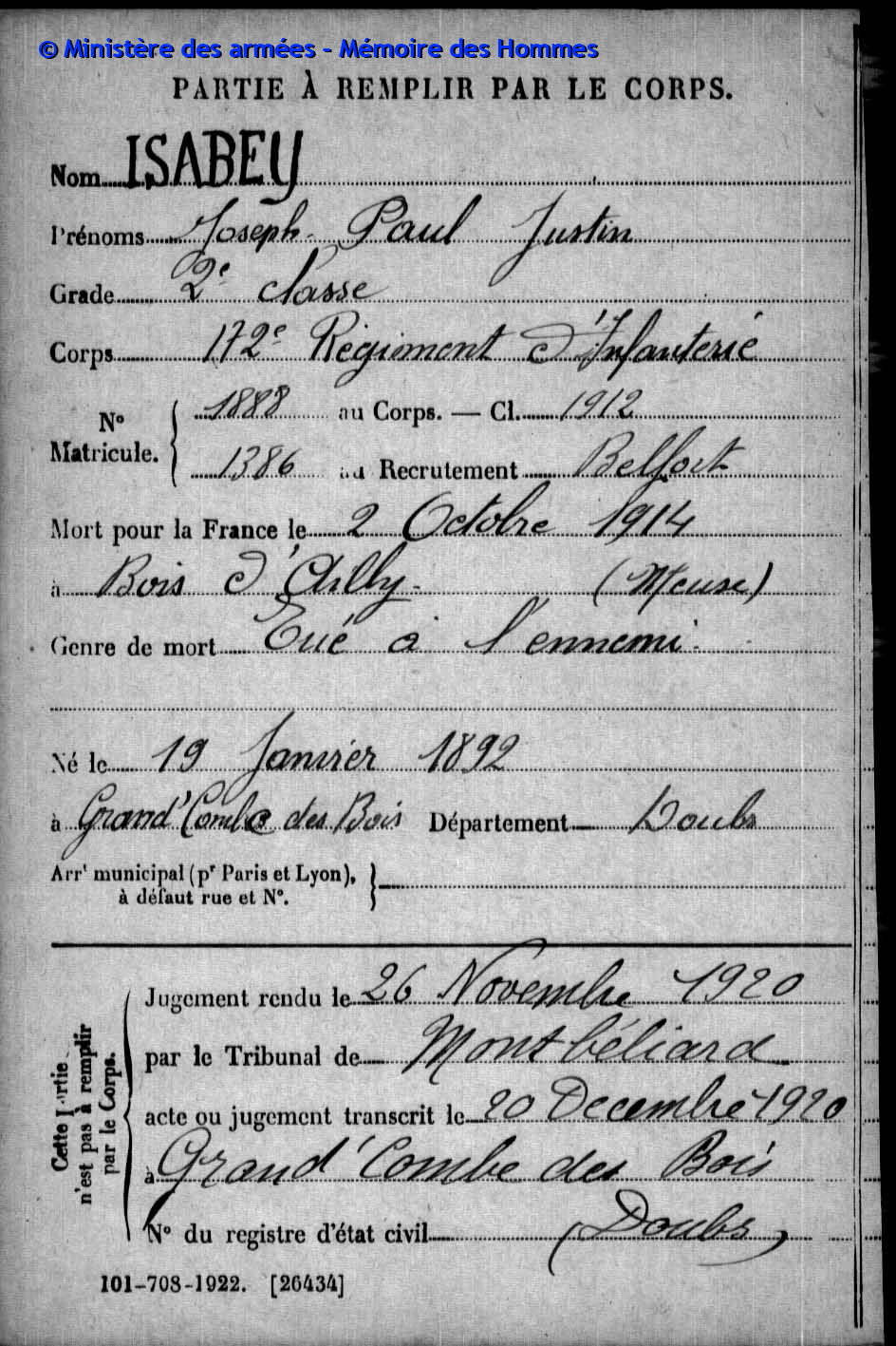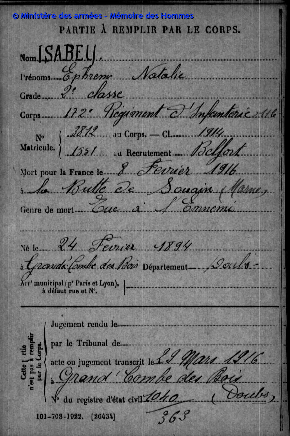 2ème classe ISABEY Joseph Paul Justin 19.01.1892 - 02.10.1914 172ème Régiment d'Infanterie Gefallen in Ailly - Meuse (F) |