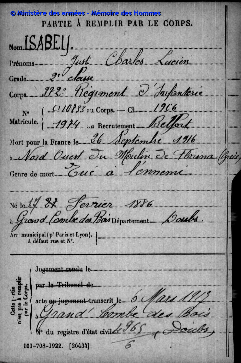 2ème classe ISABEY Just Charles Lucien 27.02.1886 - 26.09.1916 372ème Régiment d'Infanterie 21ème Compagnie Gefallen in Florina (GR) |