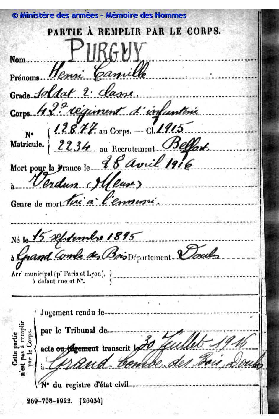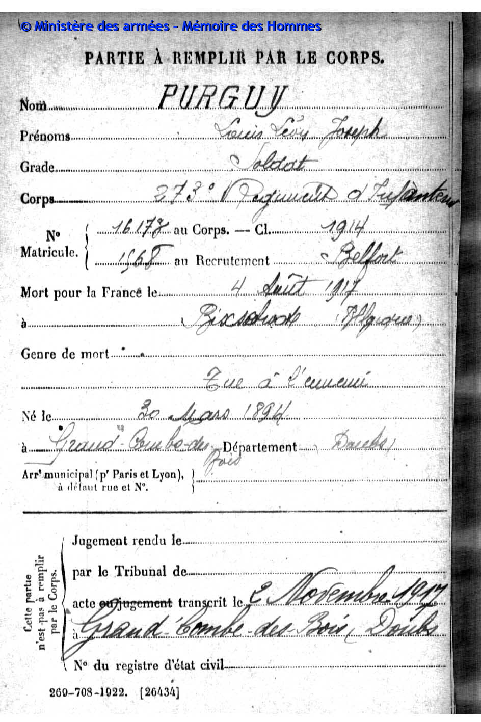 | Soldat PURGUY Louis Léon Joseph 30.03.1894 - 04.08.1917 273ème Régiment d'Infanterie Gefallen in Bixschoote (BE) |