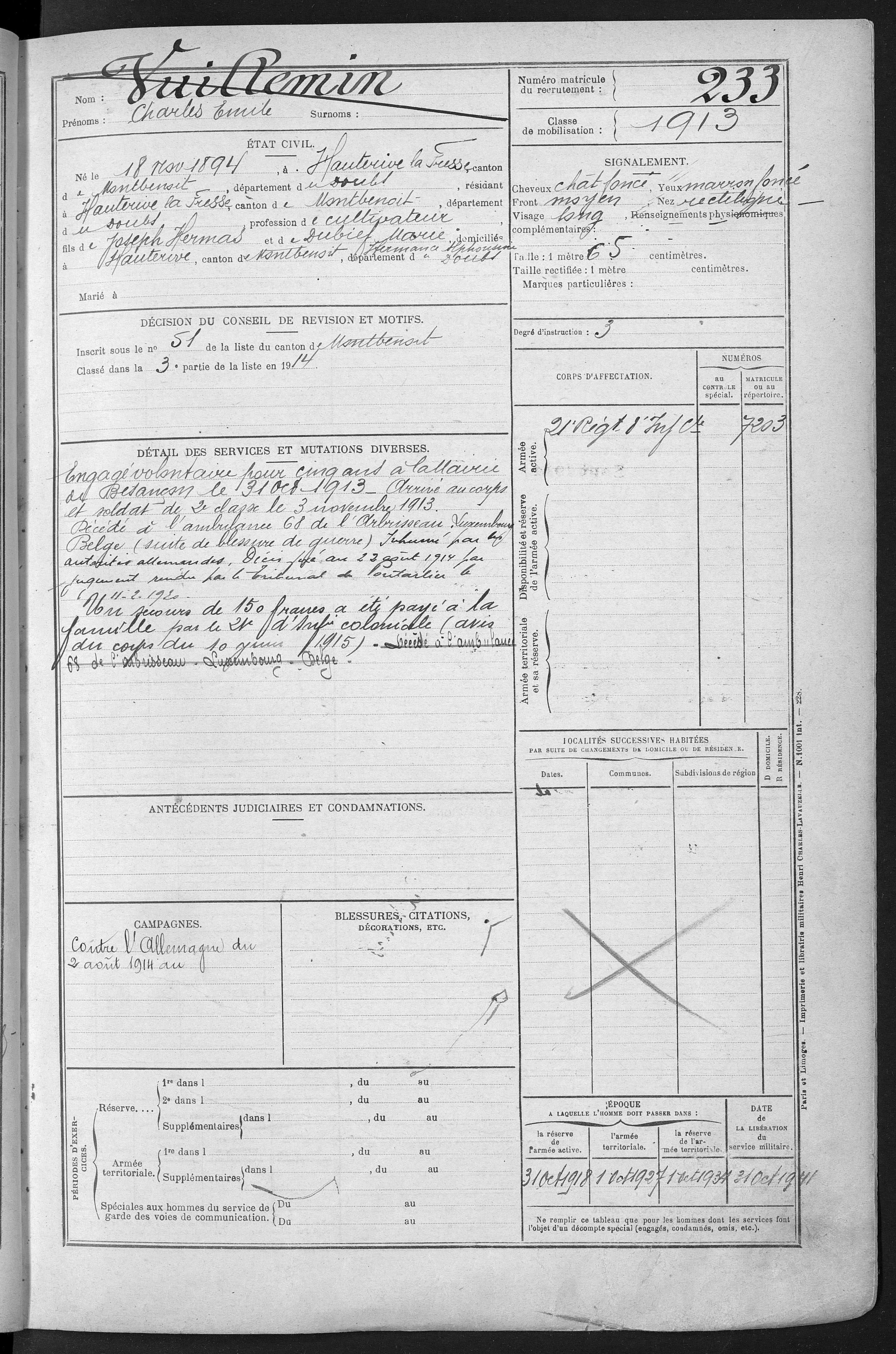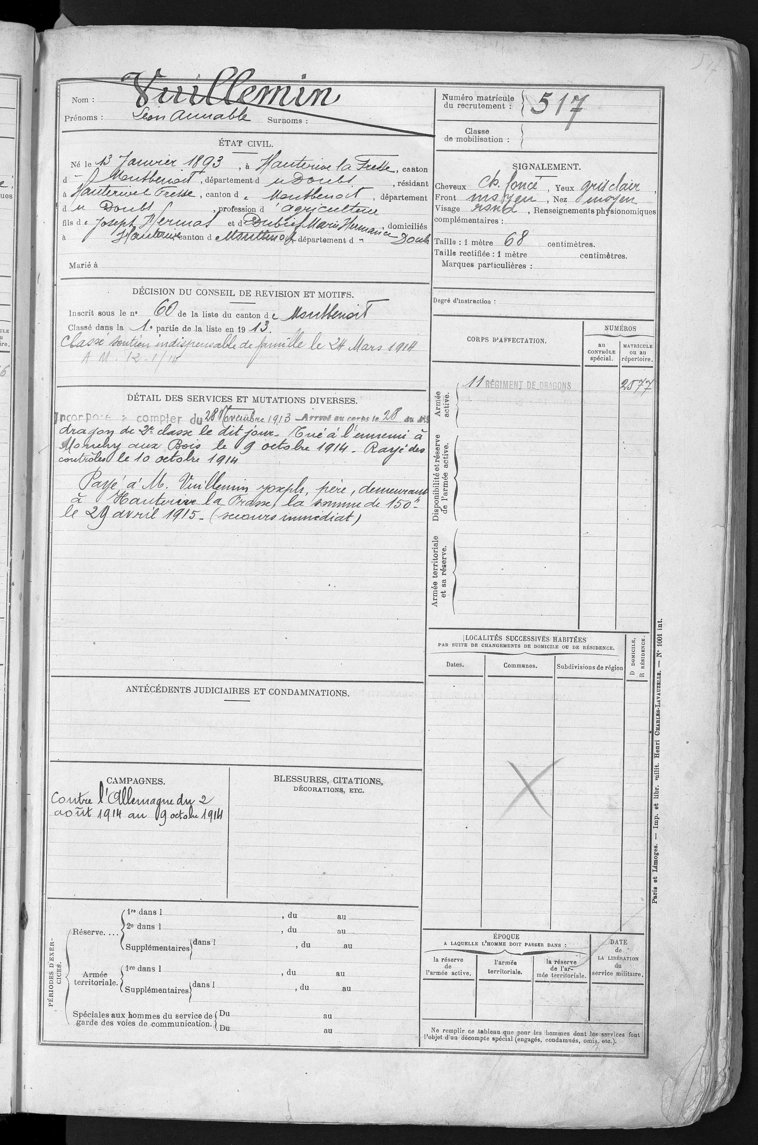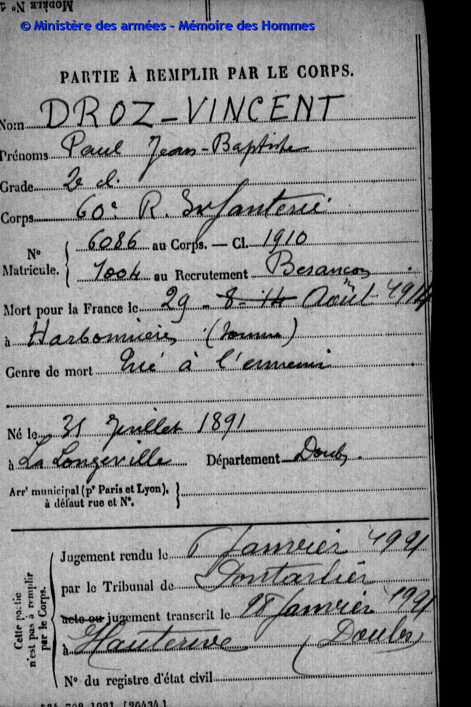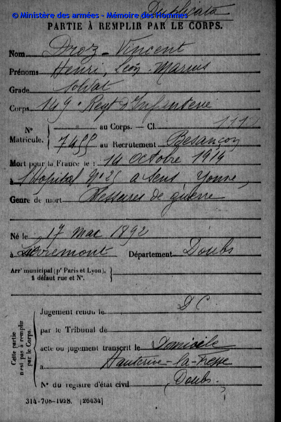 2ème classe DROZ-VINCENT Paul Jean Baptiste 31.07.1891 - 29.08.1914 60ème Régiment d'Infanterie Gefallen in Harbonnières - Somme (F) |