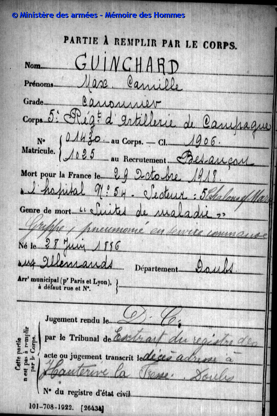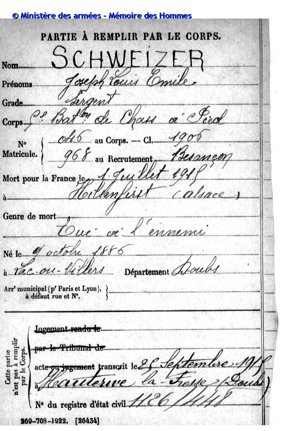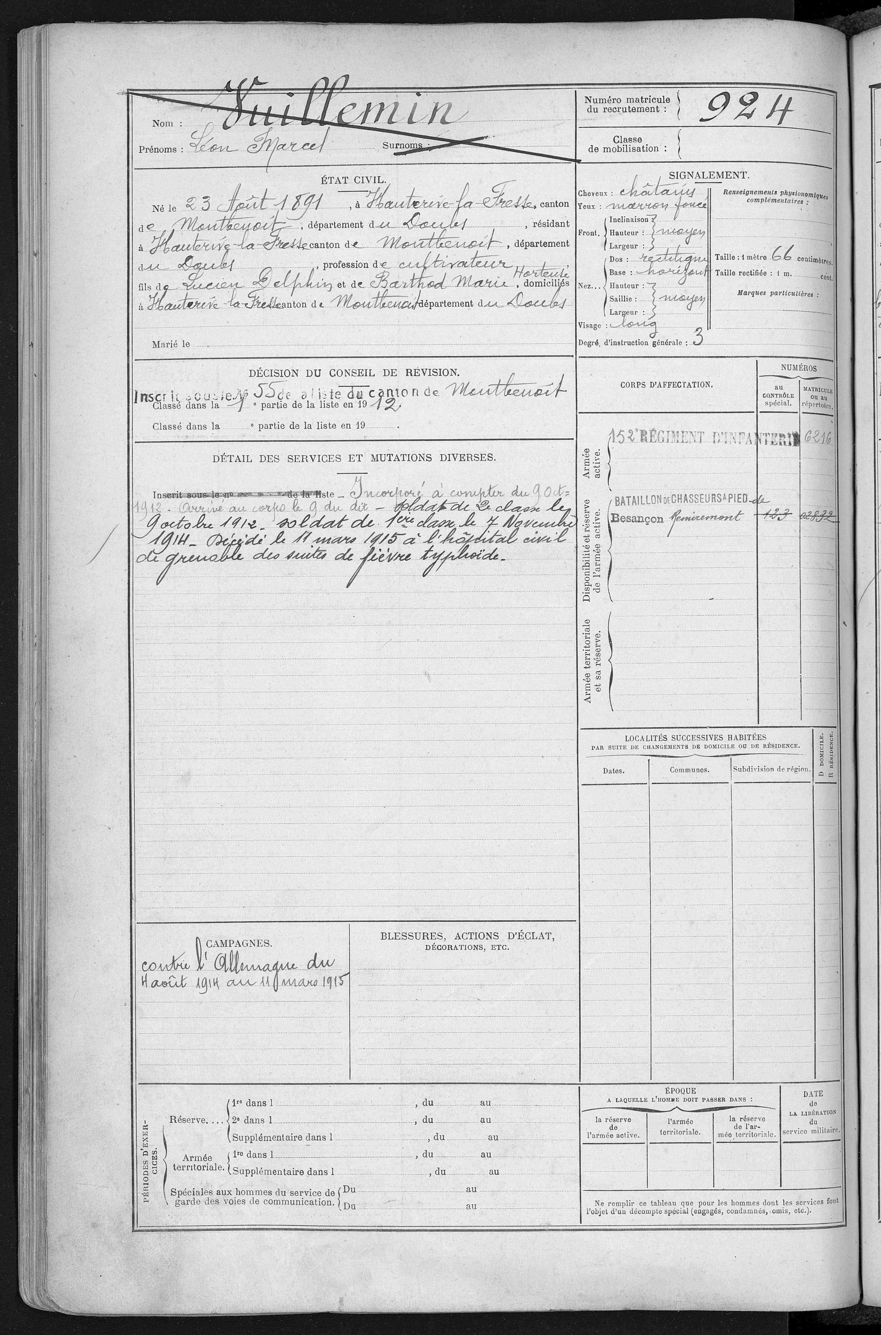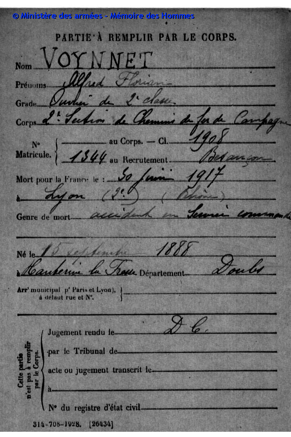 2ème classe DROZ-VINCENT Paul Jean Baptiste 31.07.1891 - 29.08.1914 60ème Régiment d'Infanterie Gefallen in Harbonnières - Somme (F) |