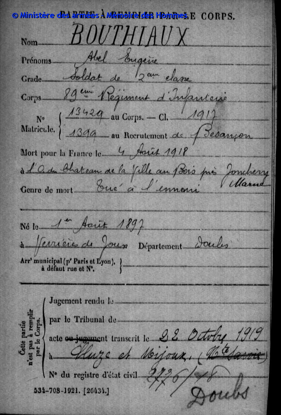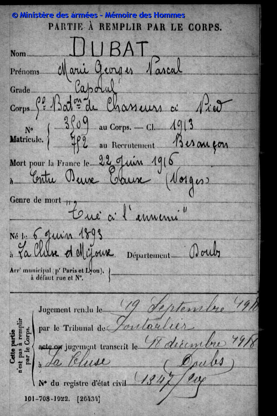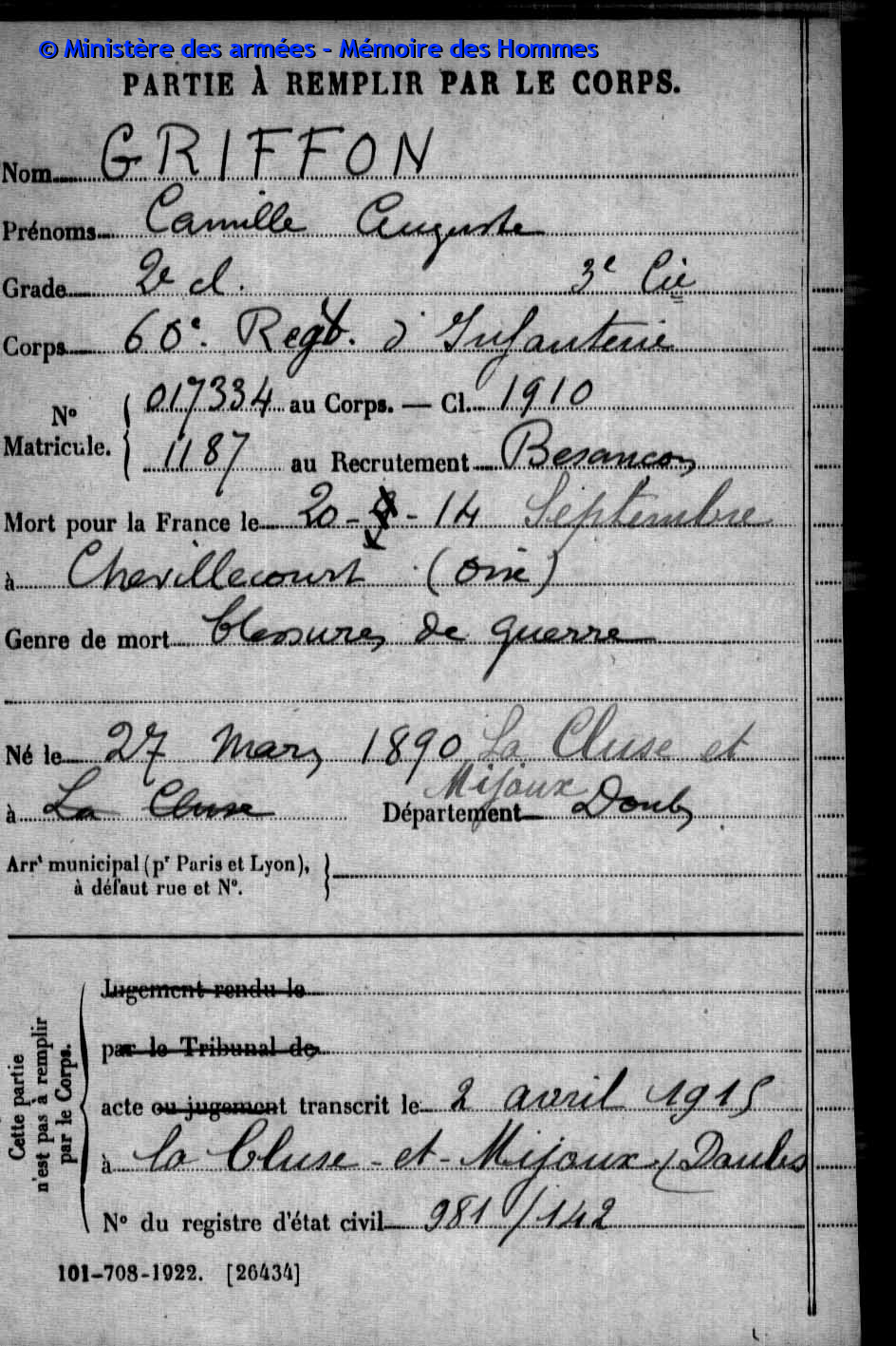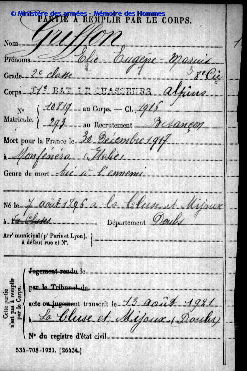 2ème classe GRIFFON Eugène Elie Marius 07.08.1896 - 30.12.1917 51ème Bataillon de Chasseurs Alpins 8ème Compagnie Gefallen in Monfenera (I) |