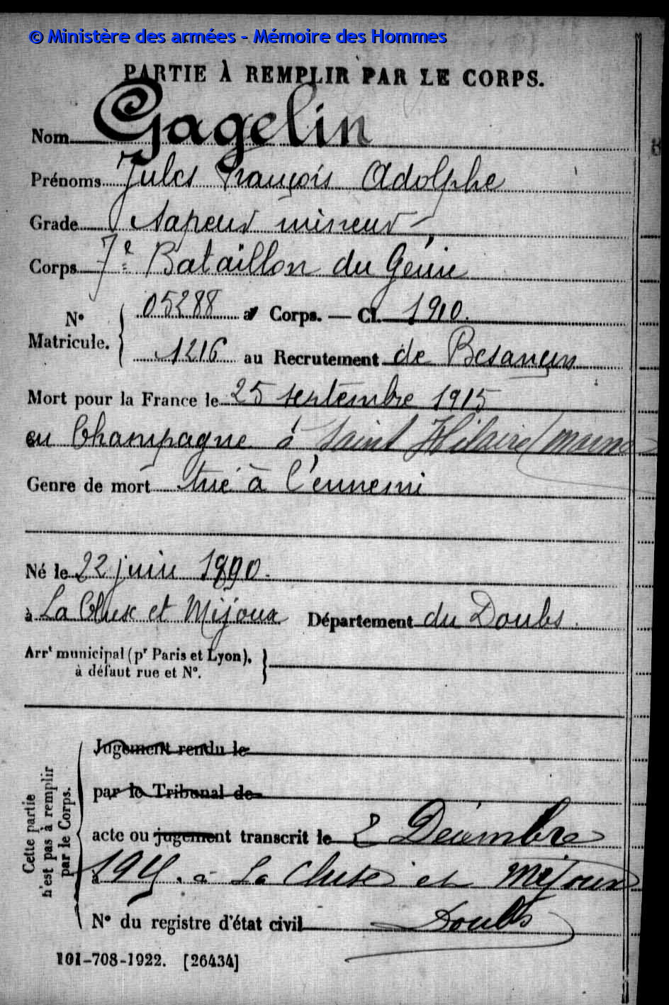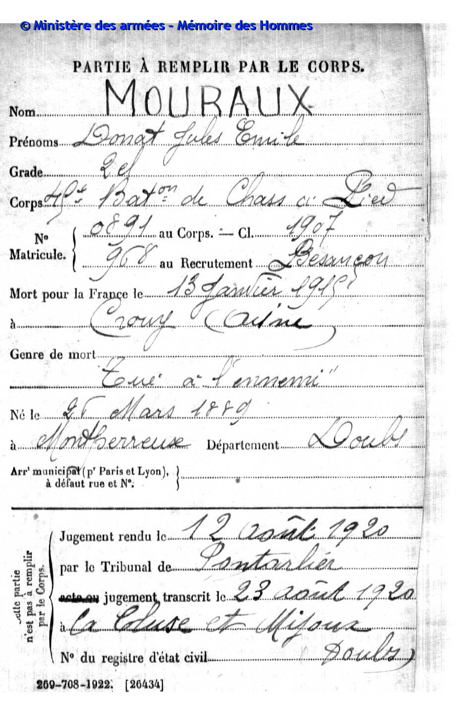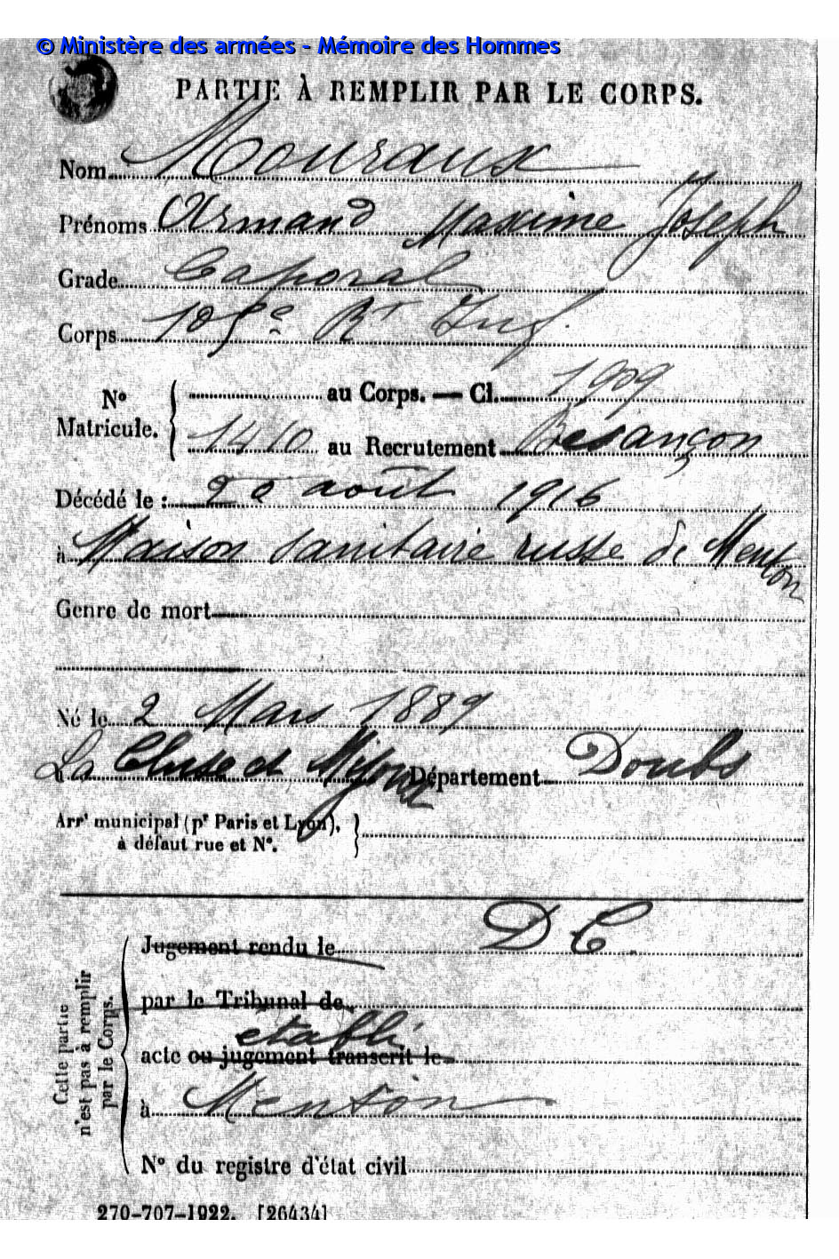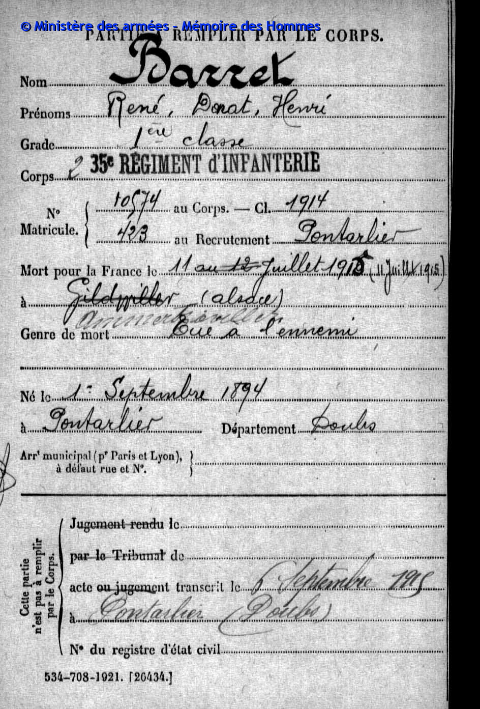 2ème classe GRIFFON Eugène Elie Marius 07.08.1896 - 30.12.1917 51ème Bataillon de Chasseurs Alpins 8ème Compagnie Gefallen in Monfenera (I) |