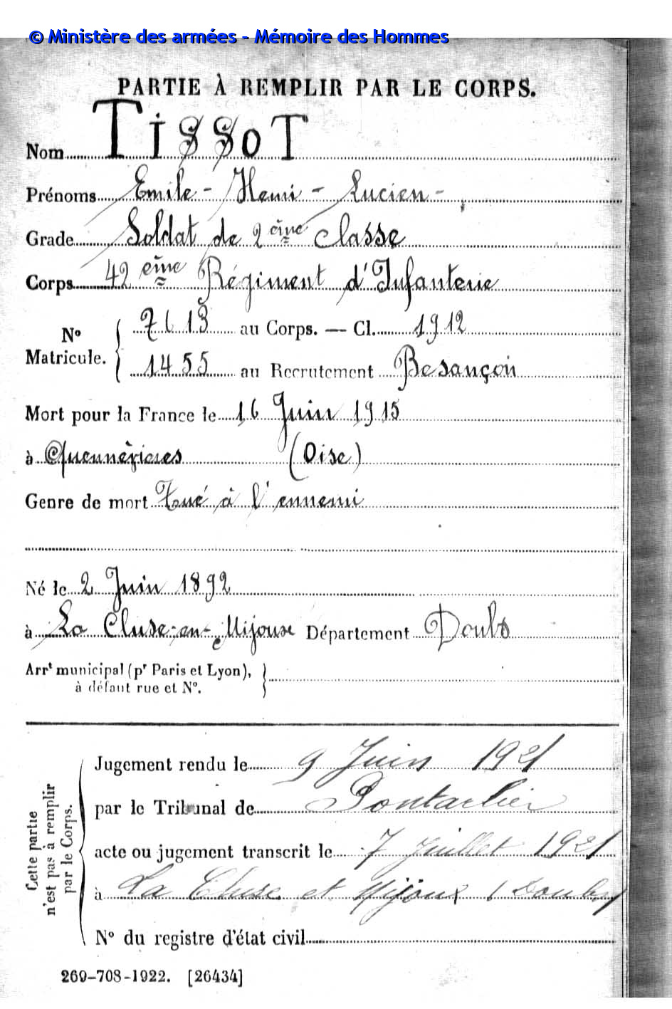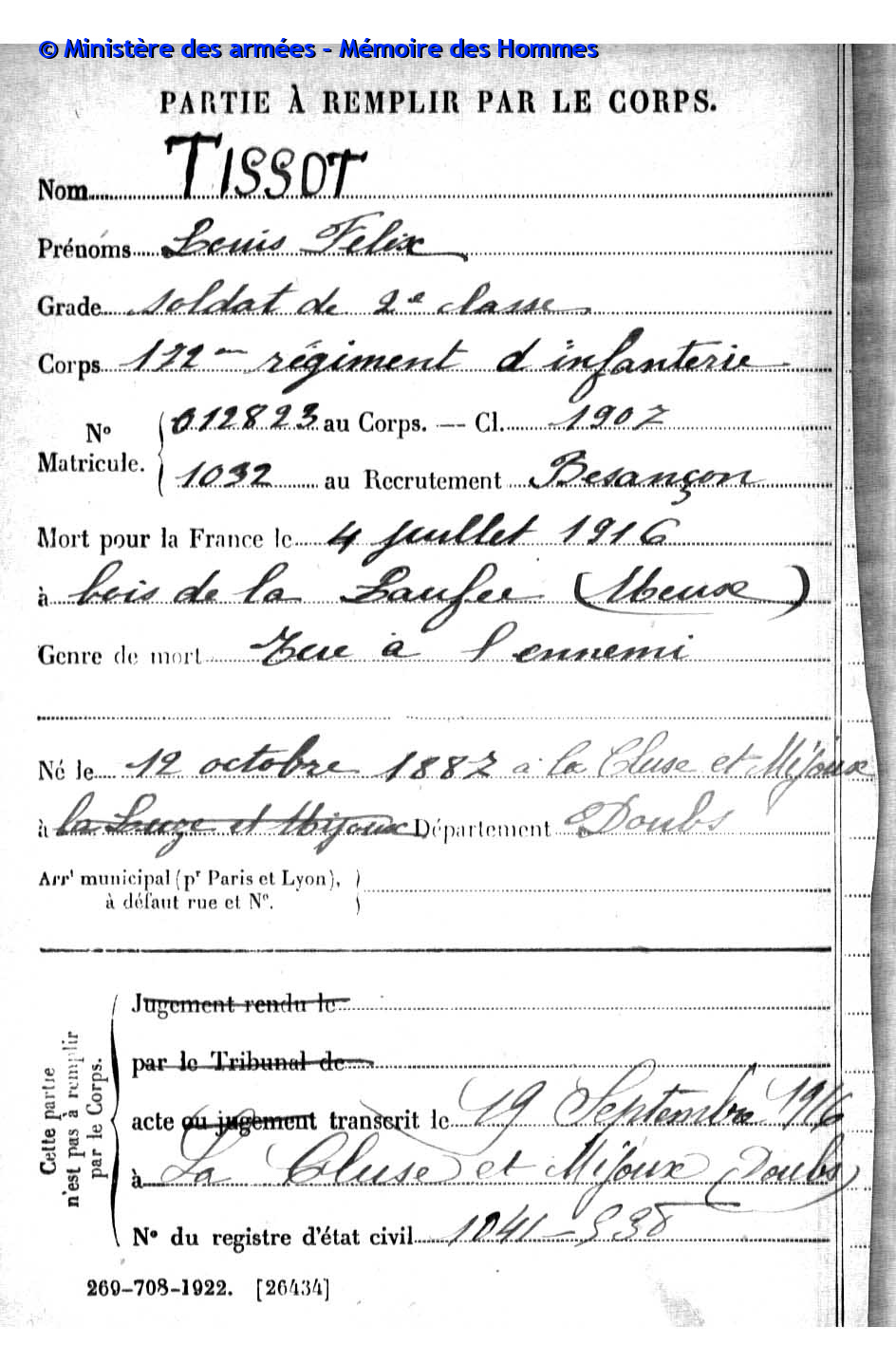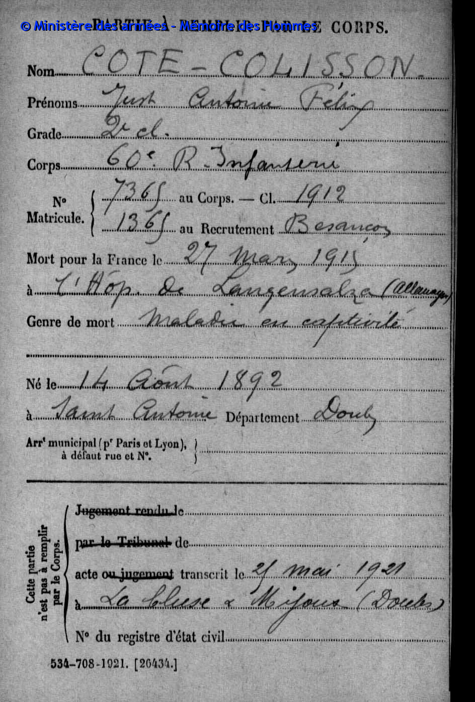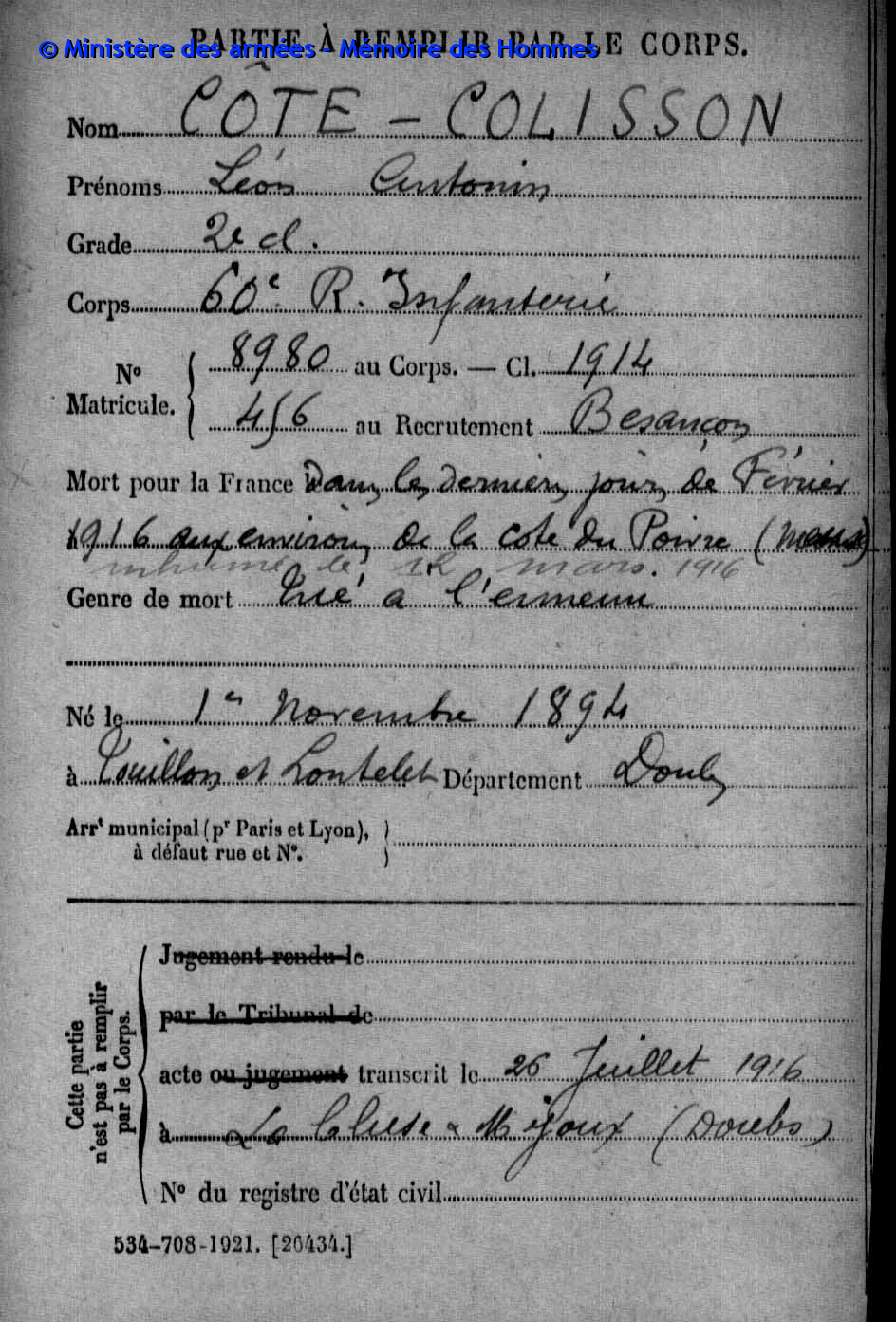 2ème classe COTE-COLISSON Léon Antonin 01.11.1894 - 12.03.1916 60ème Régiment d'Infanterie Gefallen in Verdun (F) |