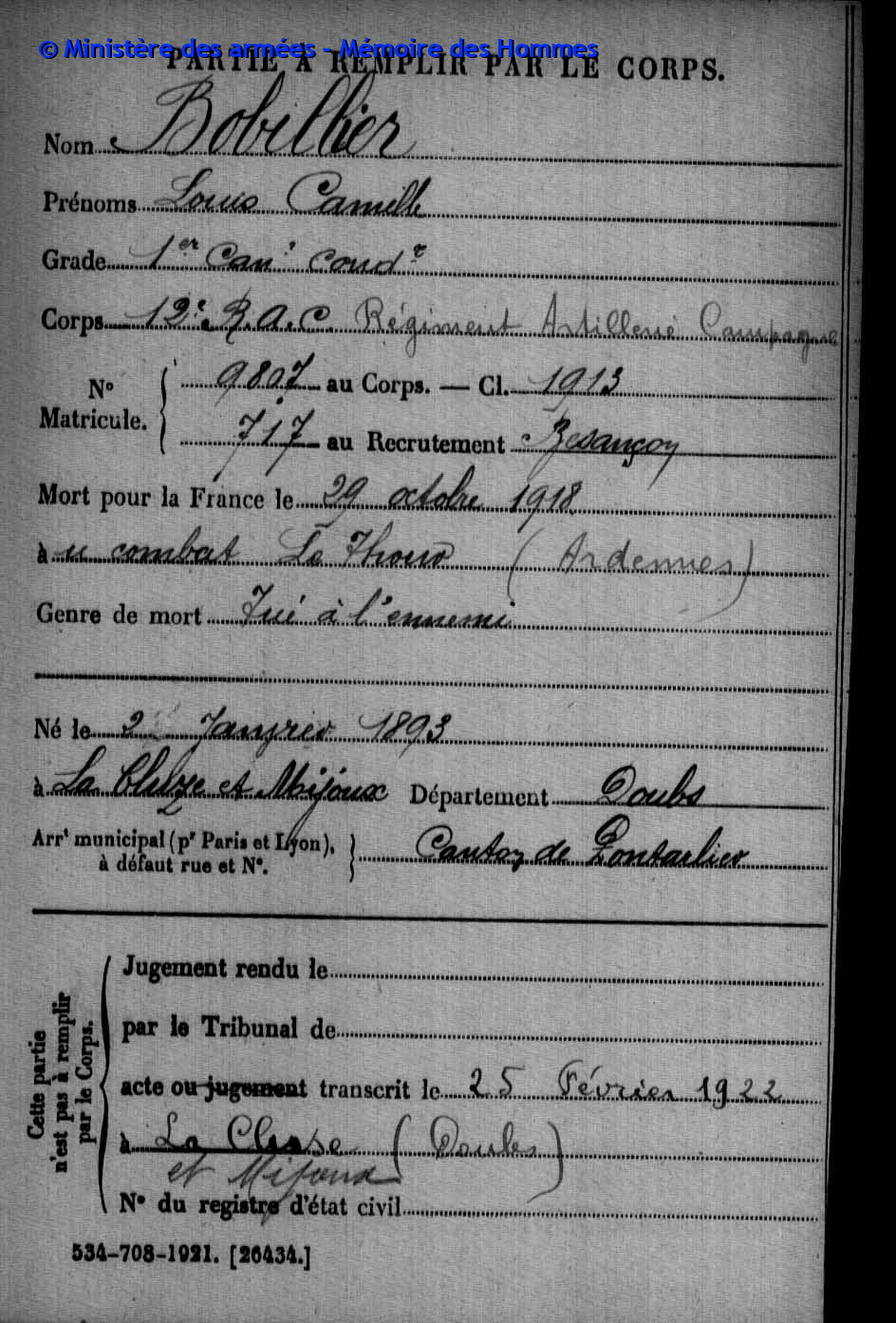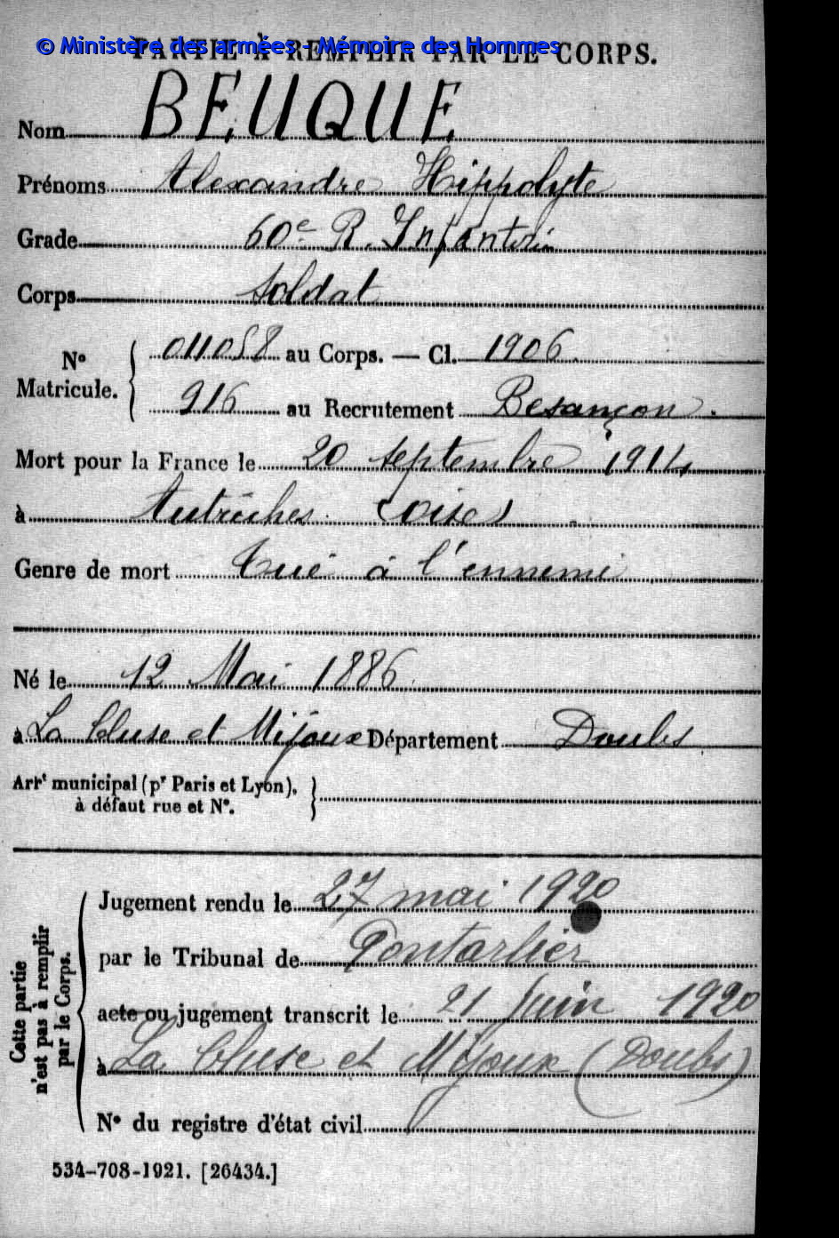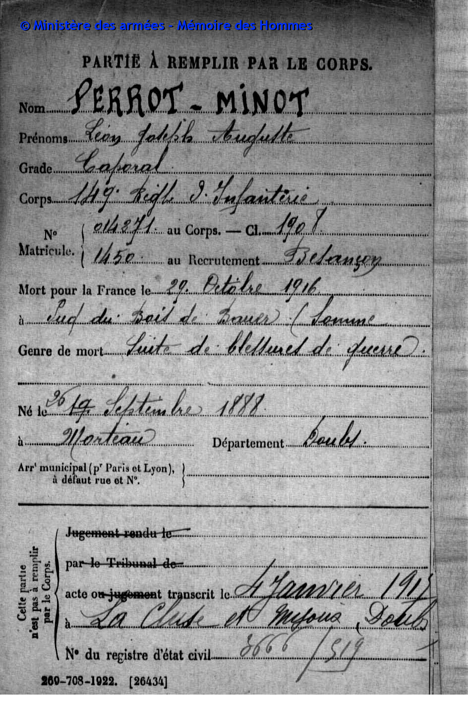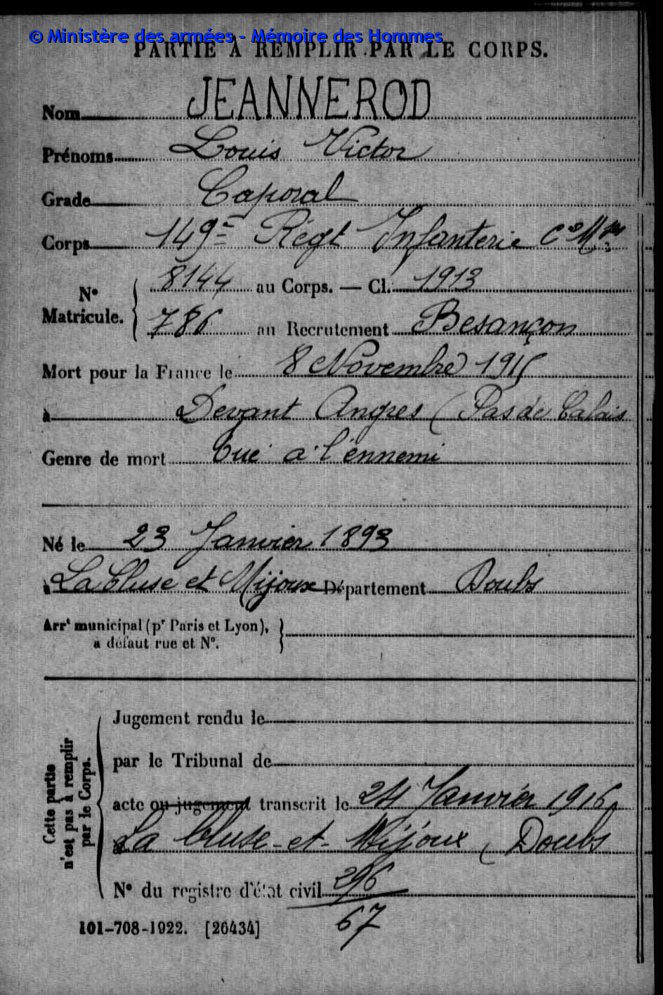 2ème classe COTE-COLISSON Léon Antonin 01.11.1894 - 12.03.1916 60ème Régiment d'Infanterie Gefallen in Verdun (F) |