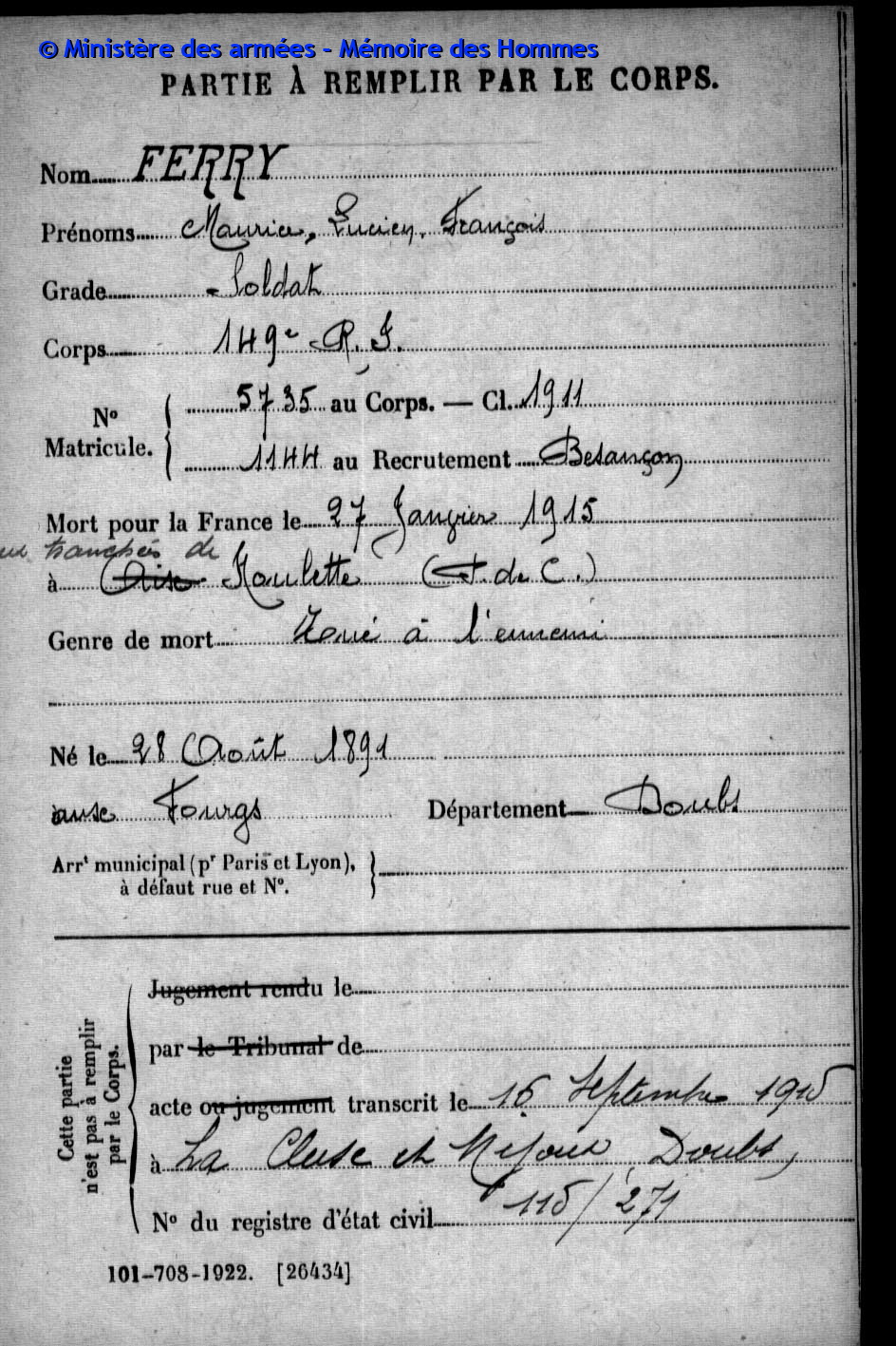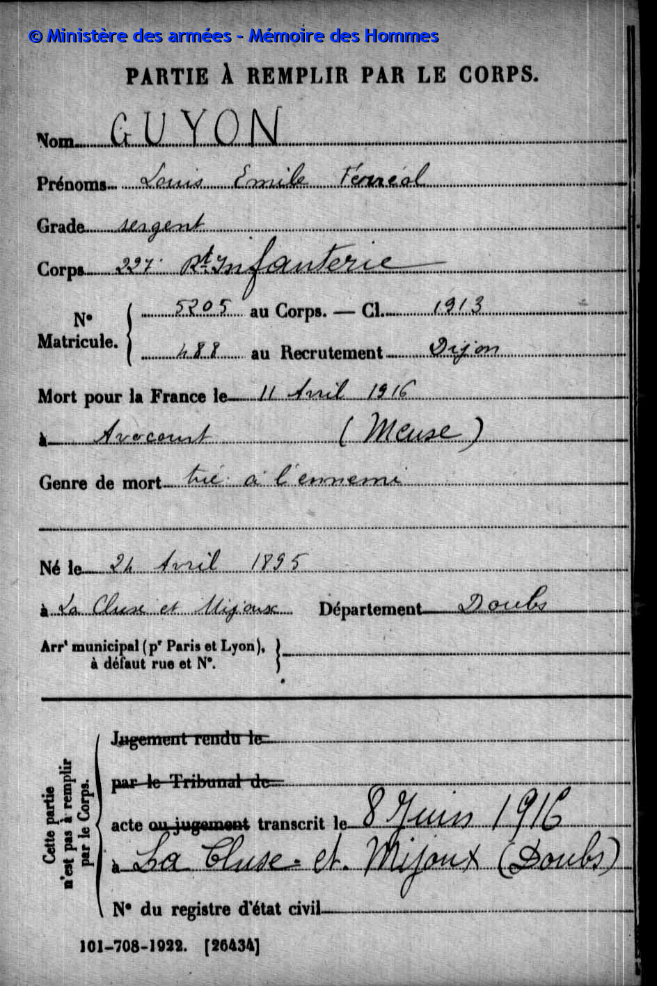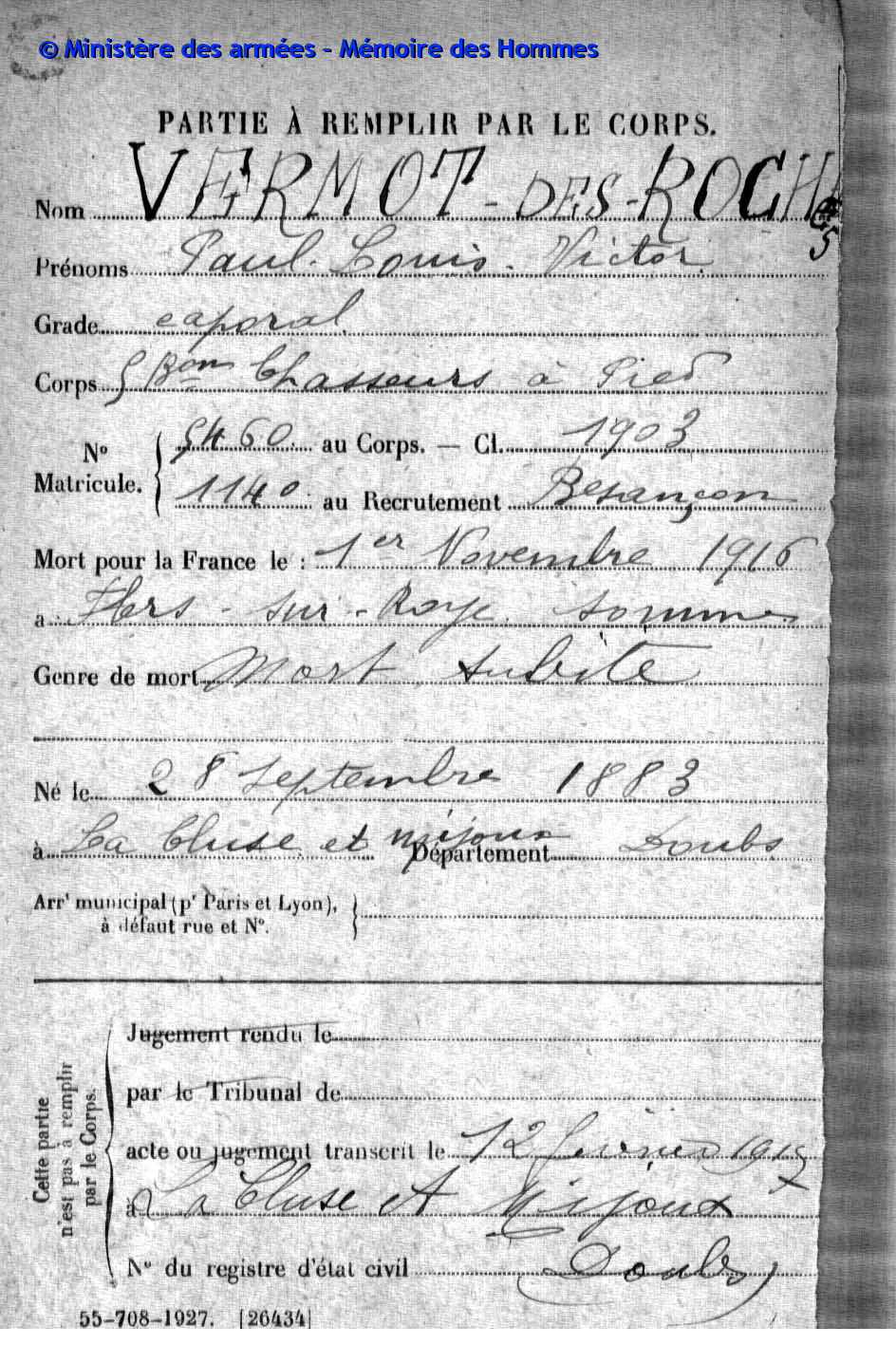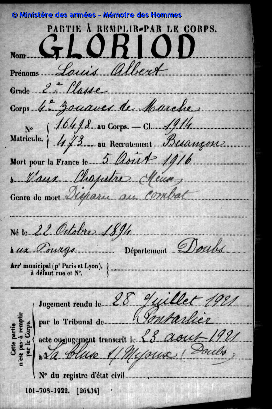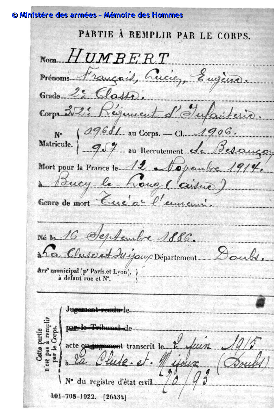 2ème classe COTE-COLISSON Léon Antonin 01.11.1894 - 12.03.1916 60ème Régiment d'Infanterie Gefallen in Verdun (F) |