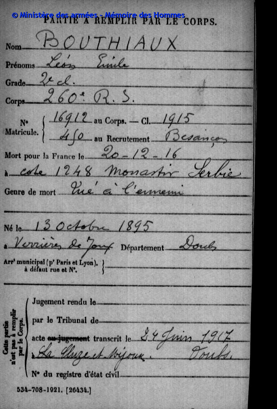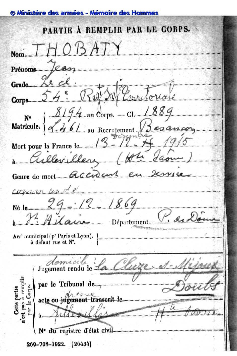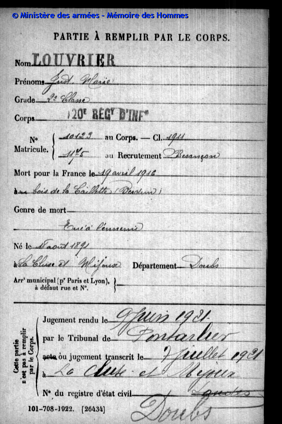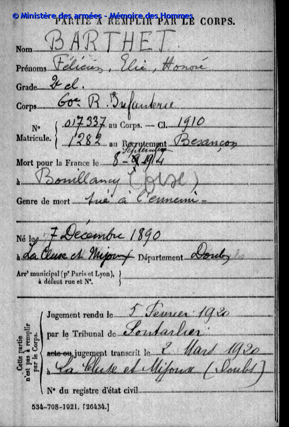 2ème classe COTE-COLISSON Léon Antonin 01.11.1894 - 12.03.1916 60ème Régiment d'Infanterie Gefallen in Verdun (F) |