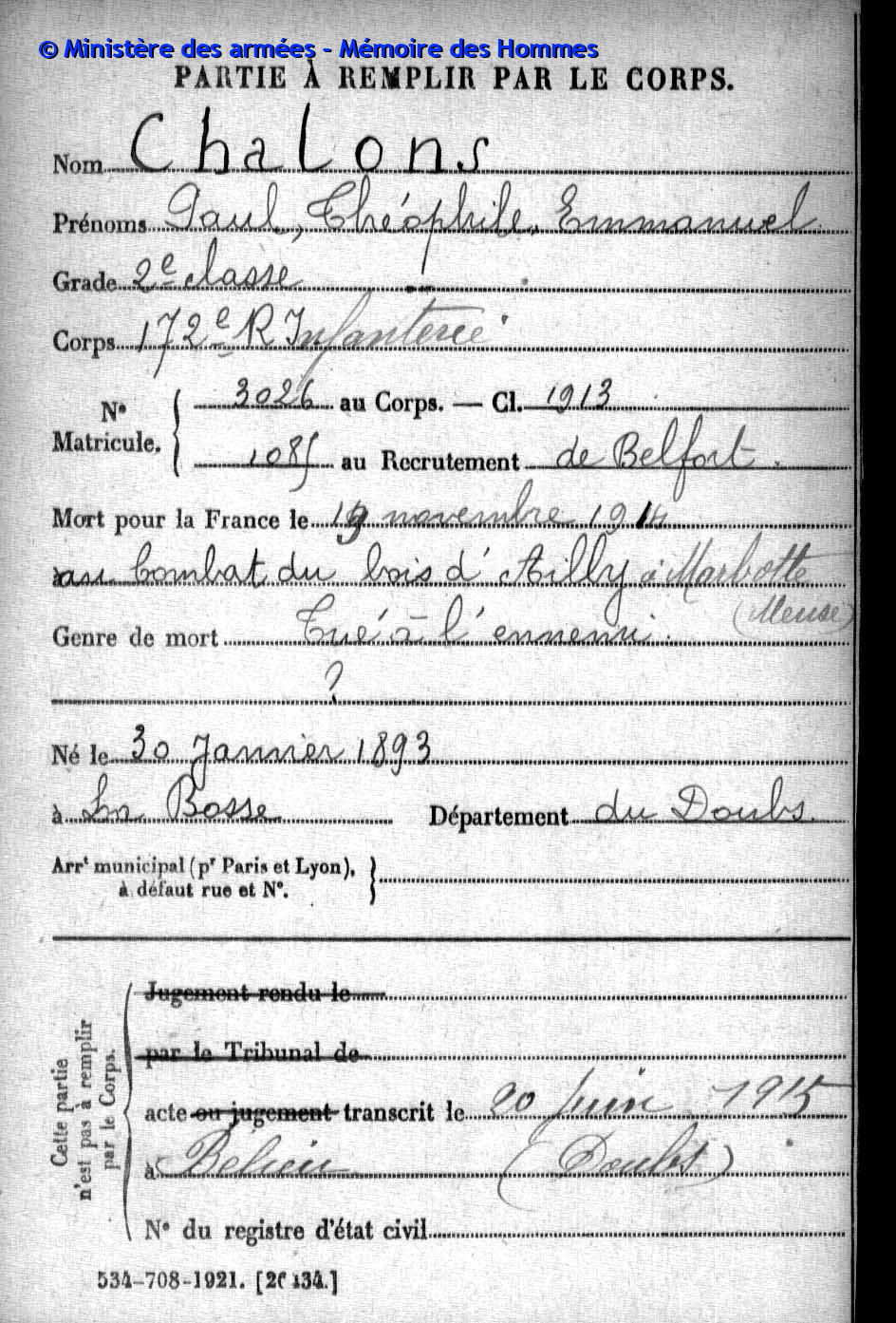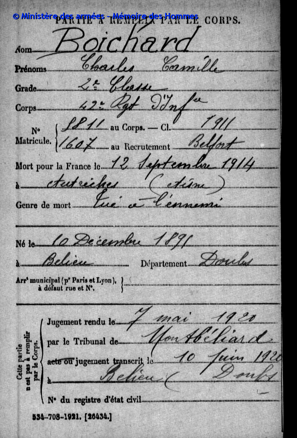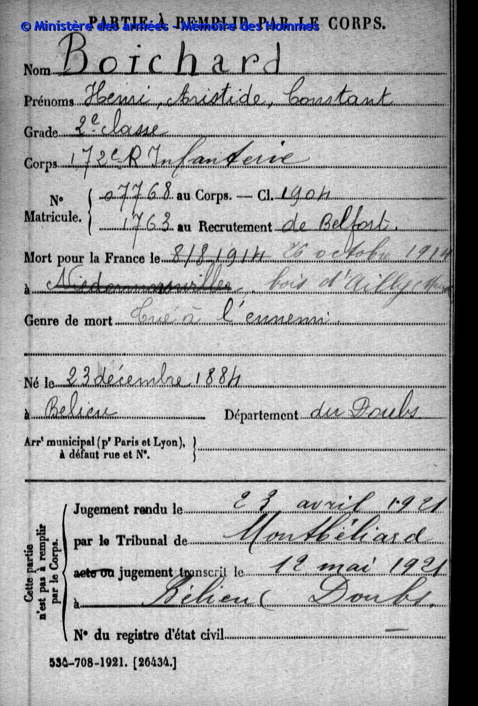 | Soldat BOICHARD Henri Aristide Constant 23.12.1884 - 26.10.1914 172ème Régiment d'Infanterie Gefallen in Bois d'Ailly (F) |