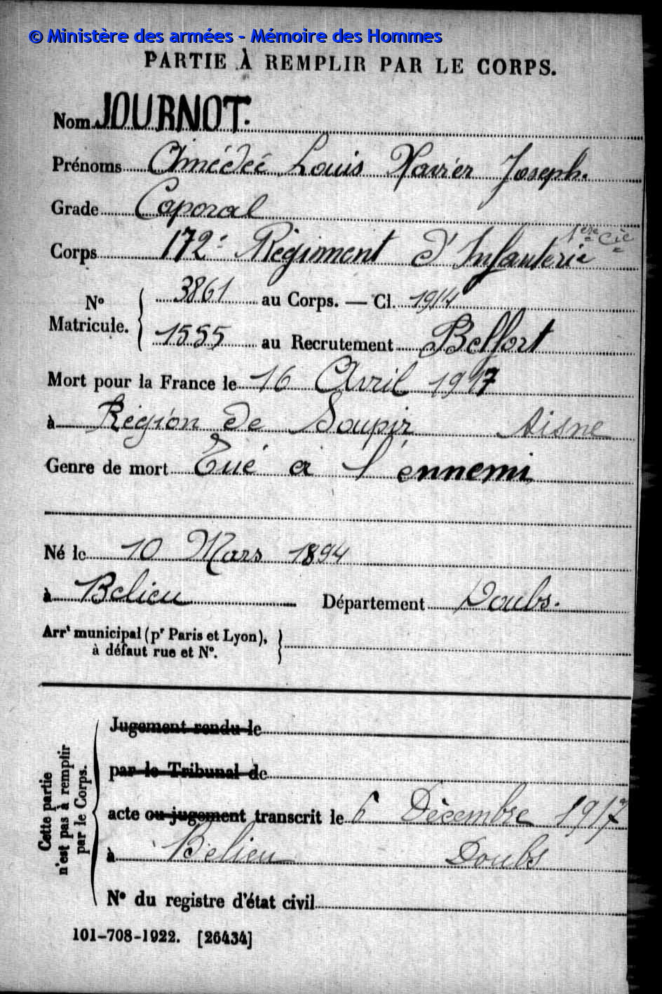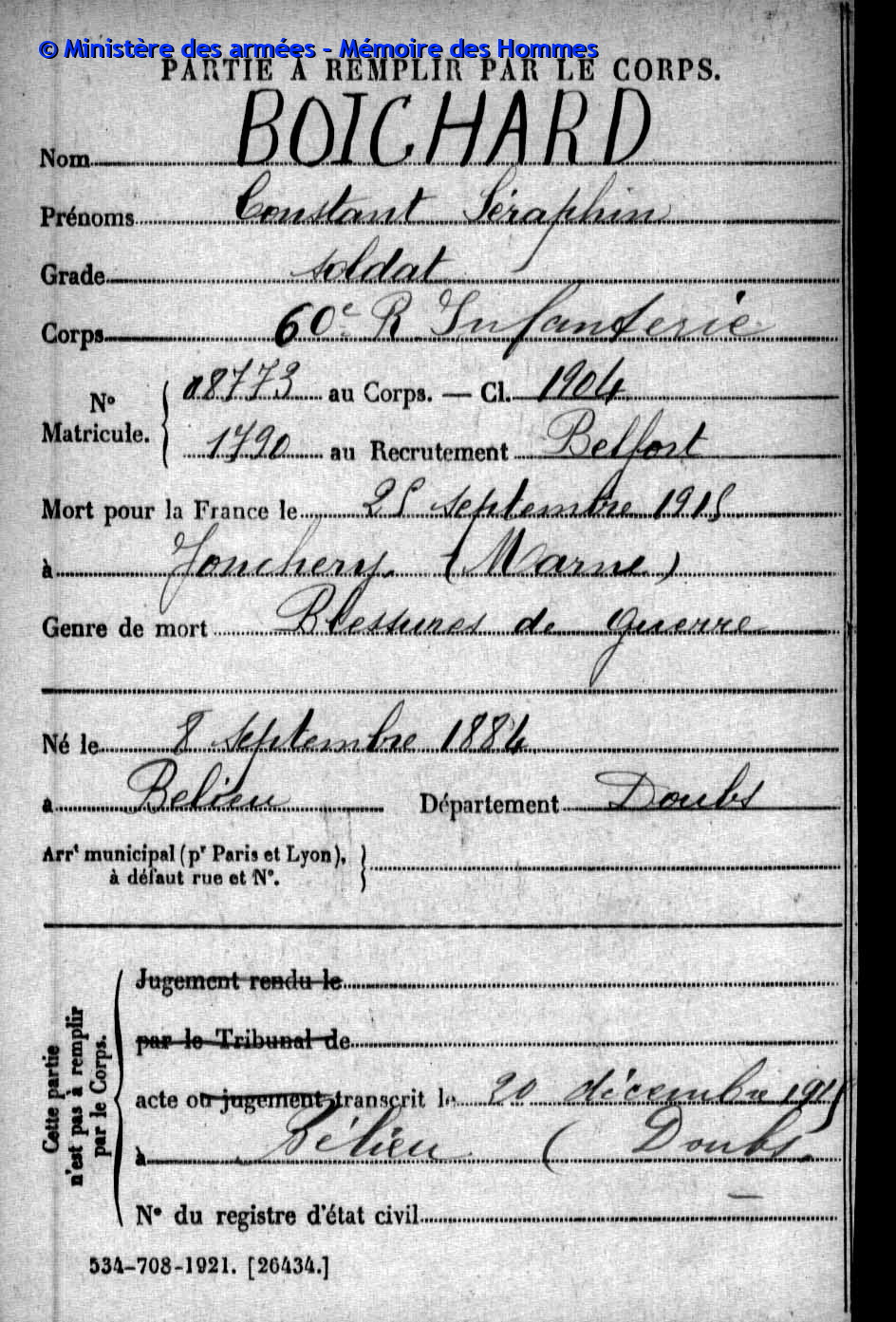 | Soldat BOICHARD Constant Séraphin 08.09.1884 - 25.09.1915 60ème Régiment d'Infanterie Verstarb an seinen Wunden in Jonchery-sur-Suippe (F) |