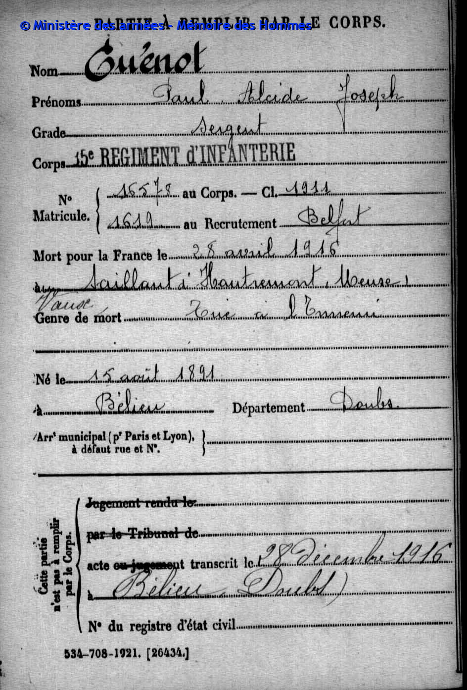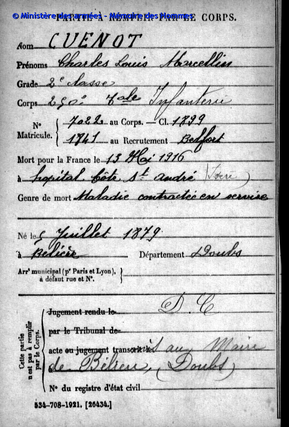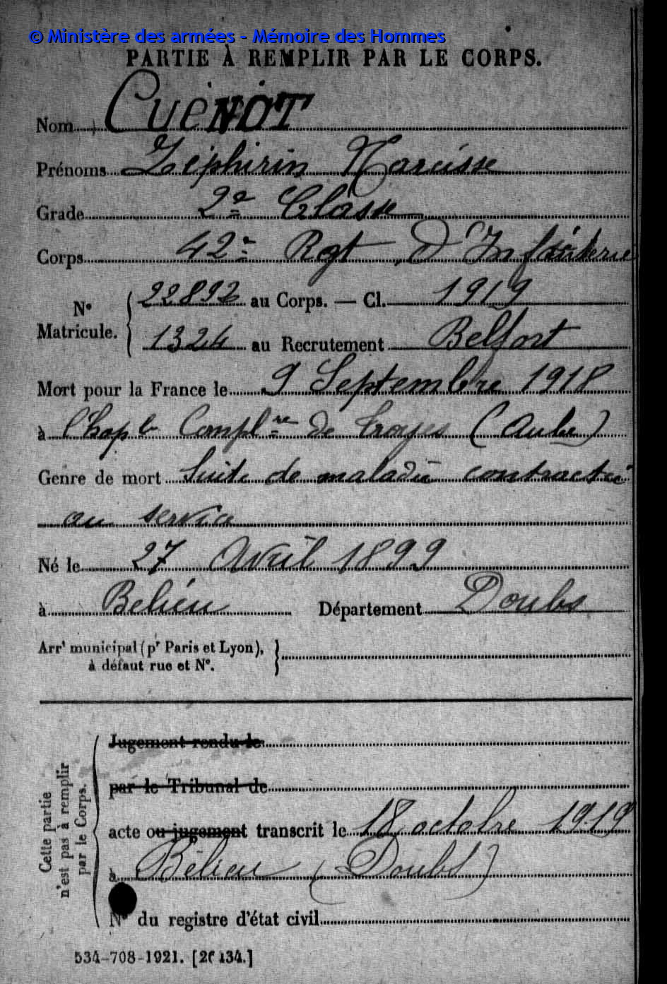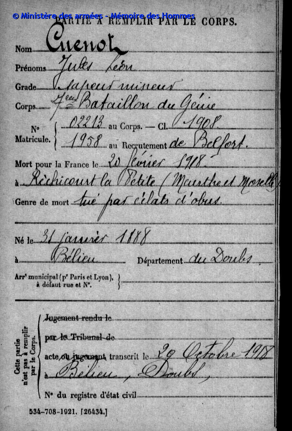 Sapeur-mineur CUENOT Jules Léon 31.01.1888 - 20.02.1918 7ème Régiment du Génie Gefallen in Rechicourt-la-Petite (F) |