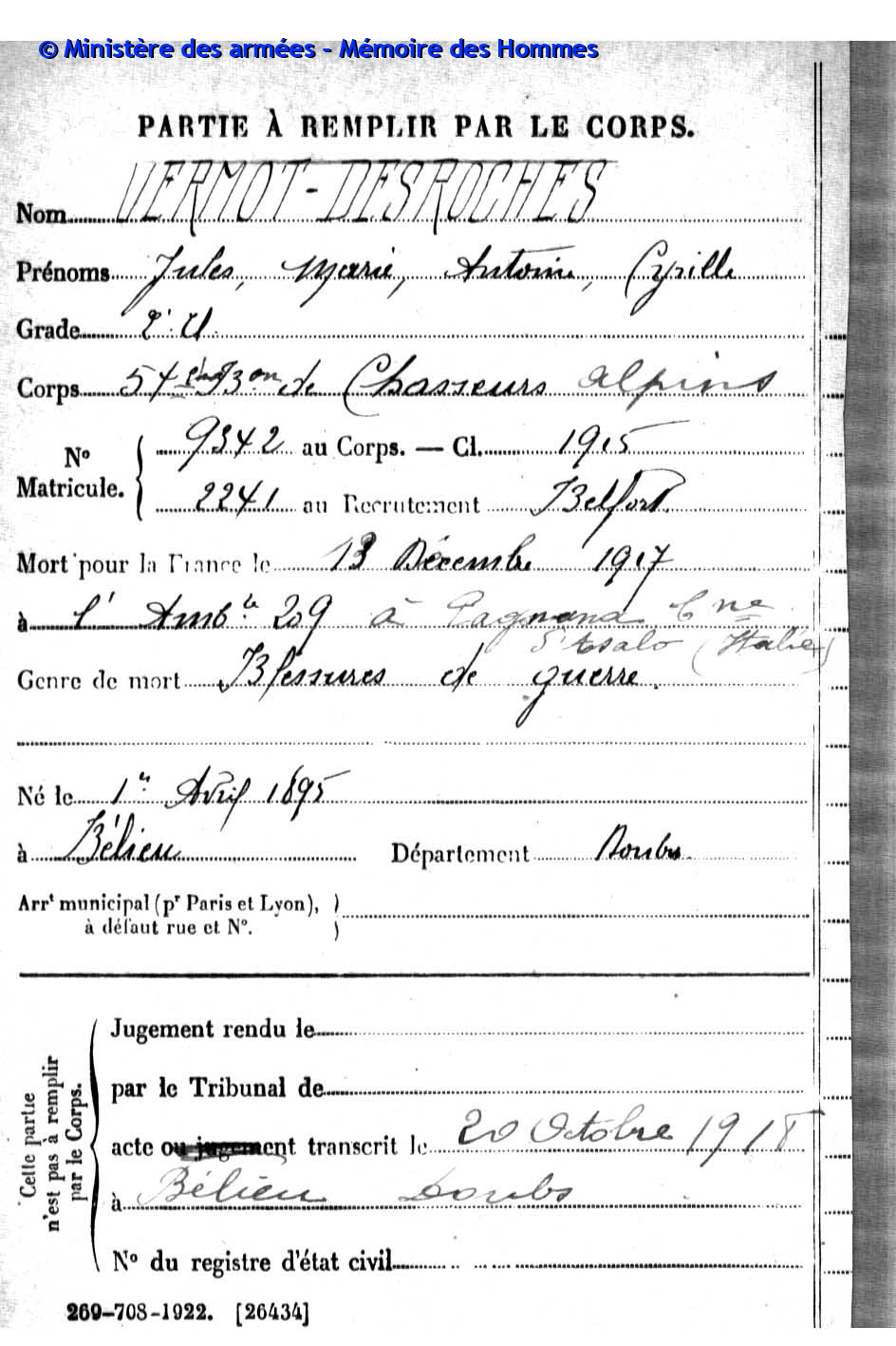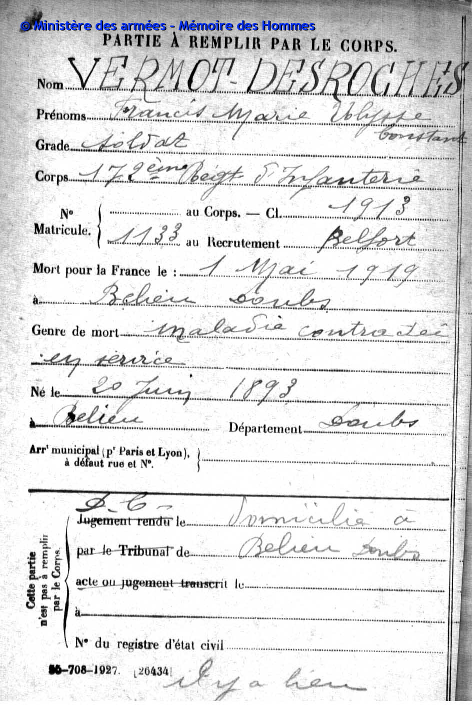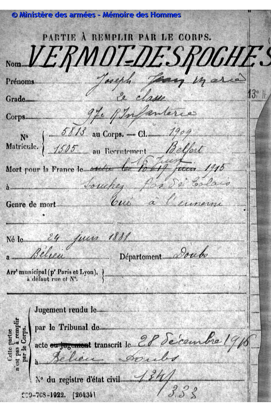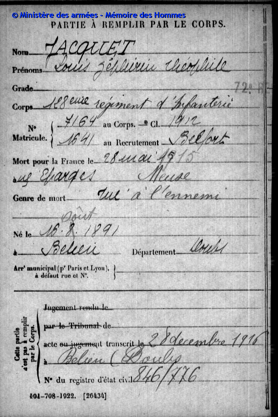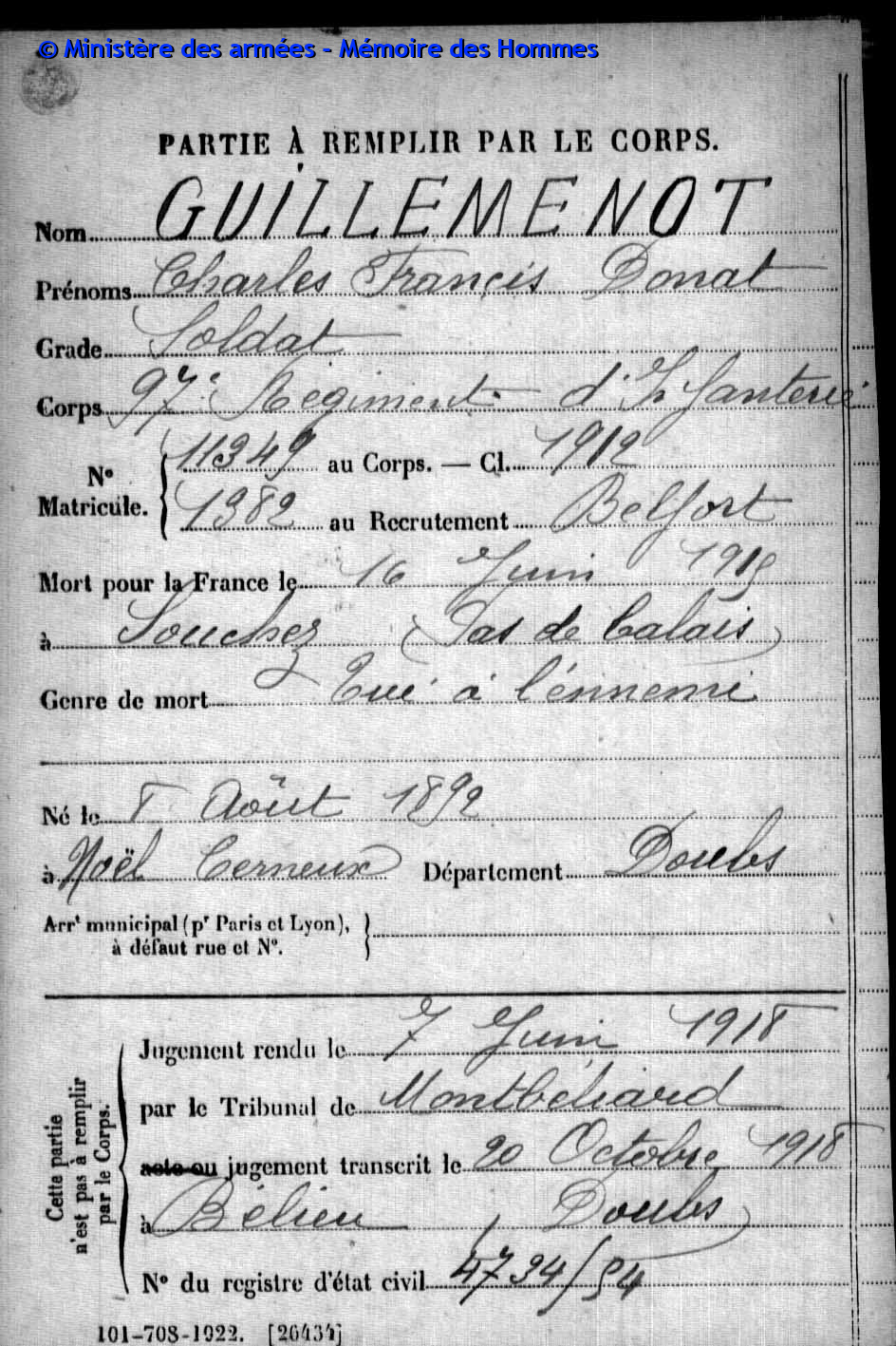 Sapeur-mineur CUENOT Jules Léon 31.01.1888 - 20.02.1918 7ème Régiment du Génie Gefallen in Rechicourt-la-Petite (F) |