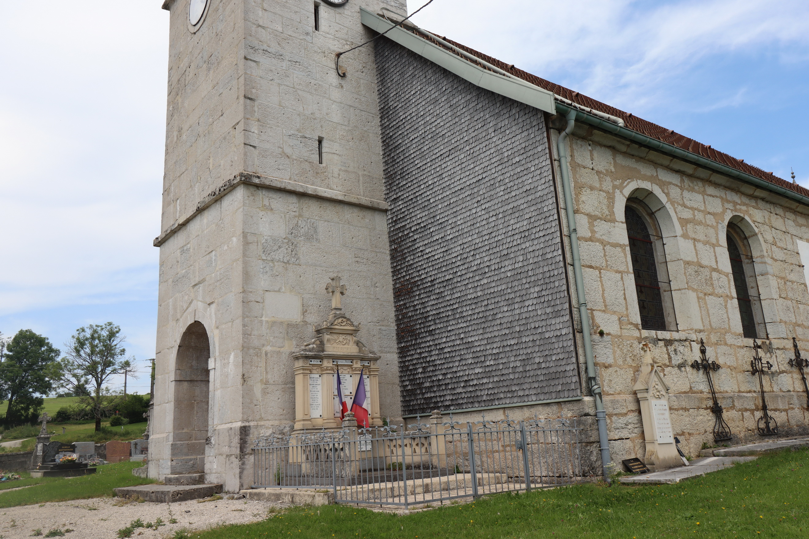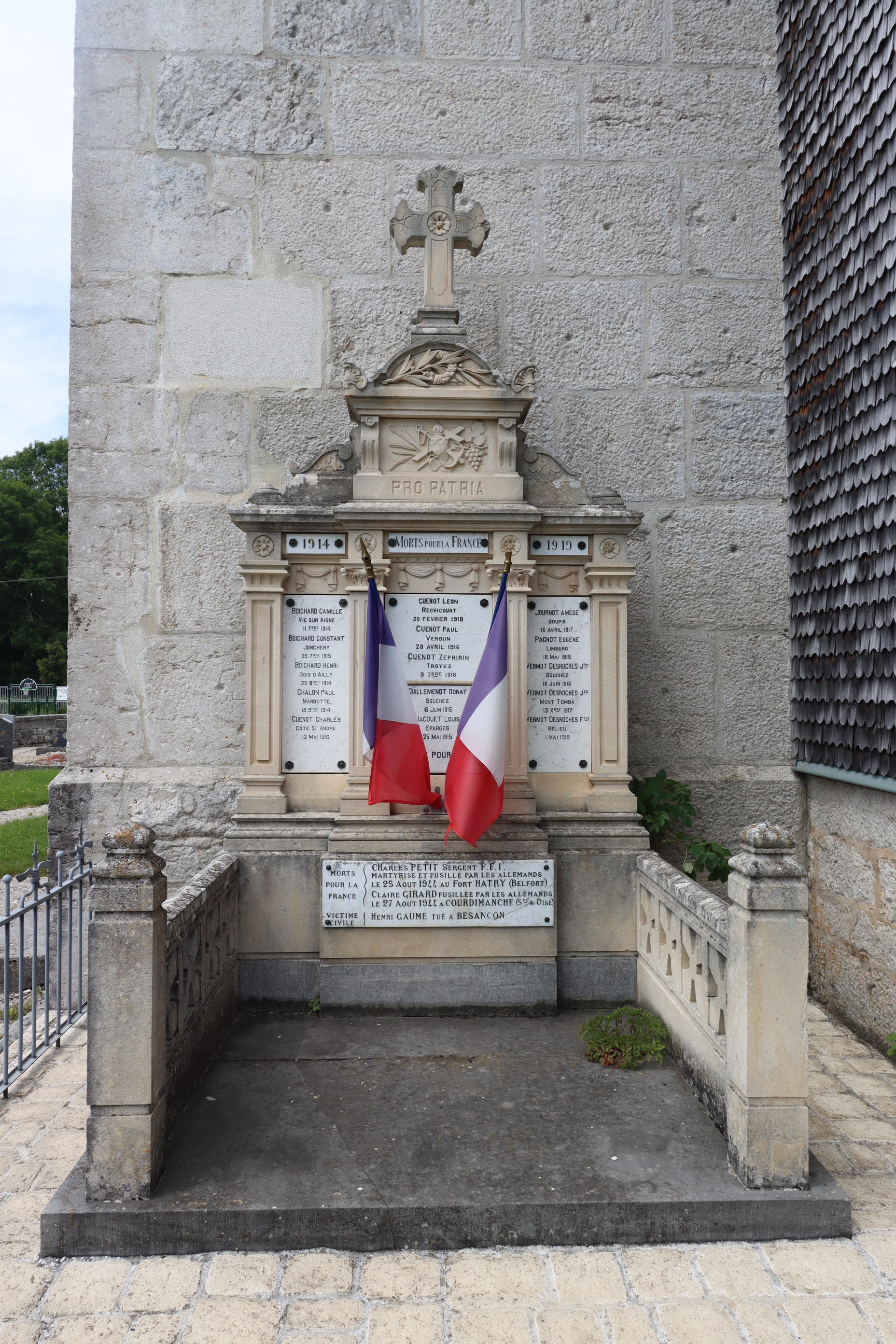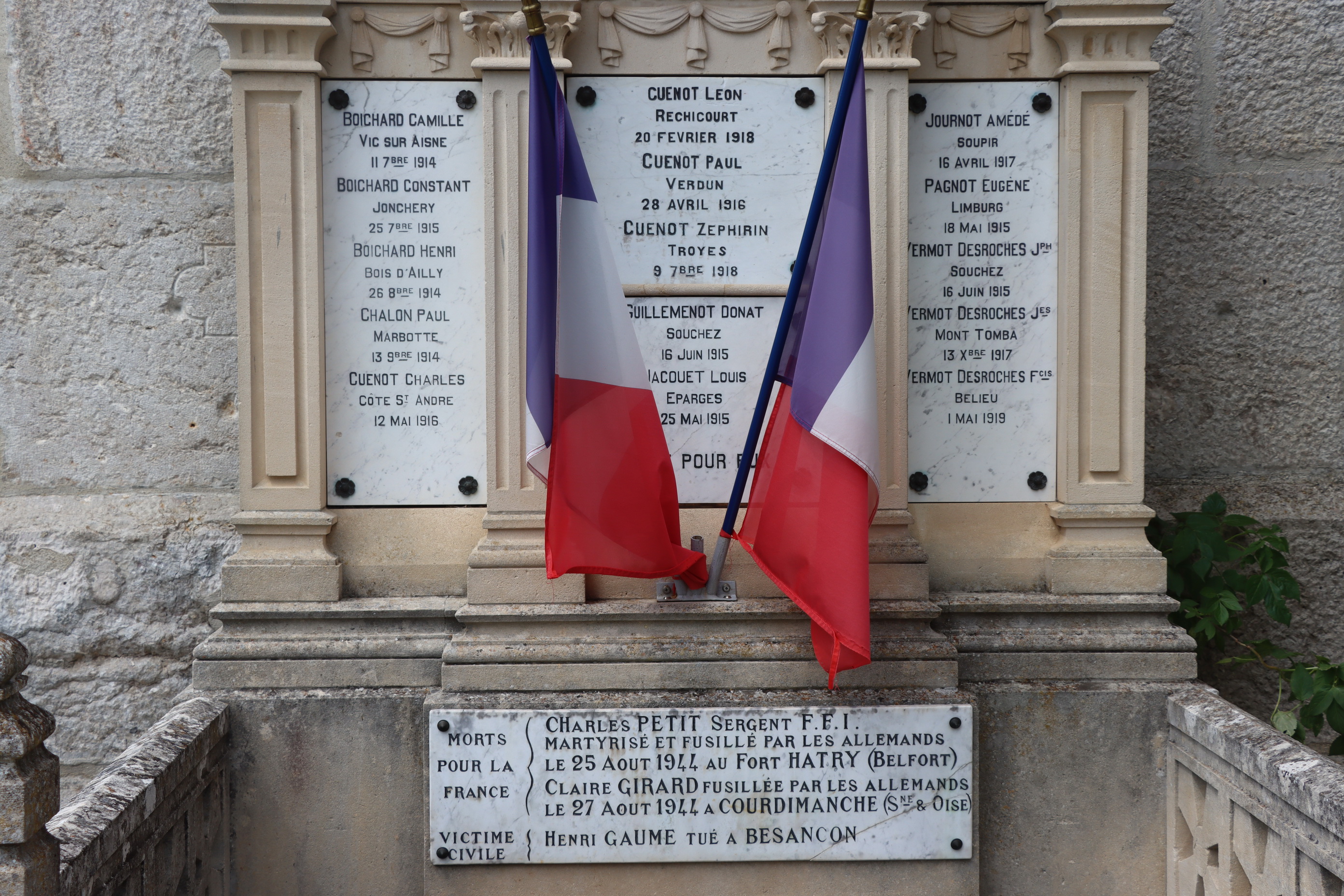 Von den 18 Namen auf dem Kriegerdenkmal bei der Kirche, sind 16 in den Weltkriegen gefallene Soldat mit Fabian Coulot verwandt
