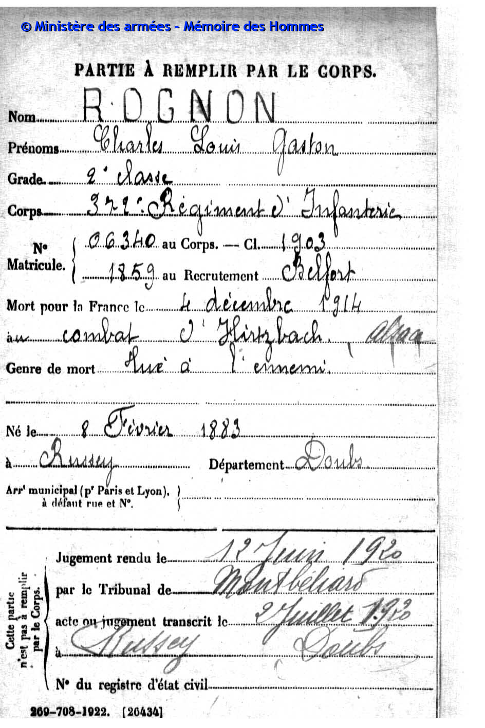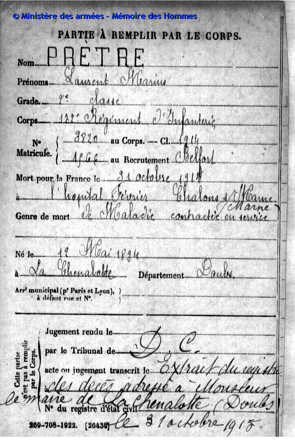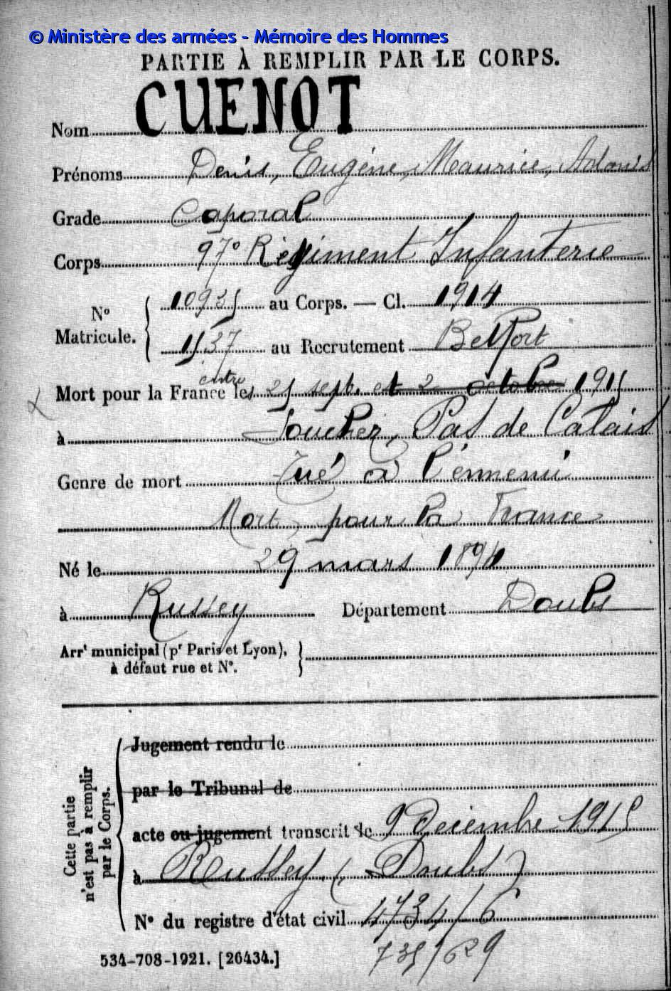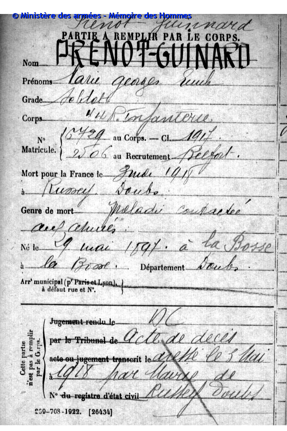 | Soldat PRENOT-GUINNARD Marie Georges Emile 29.05.1897 - 03.05.1918 44ème Régiment d'Infanterie Verstarb durch Krankheit zu Hause in Le Russey (F) |