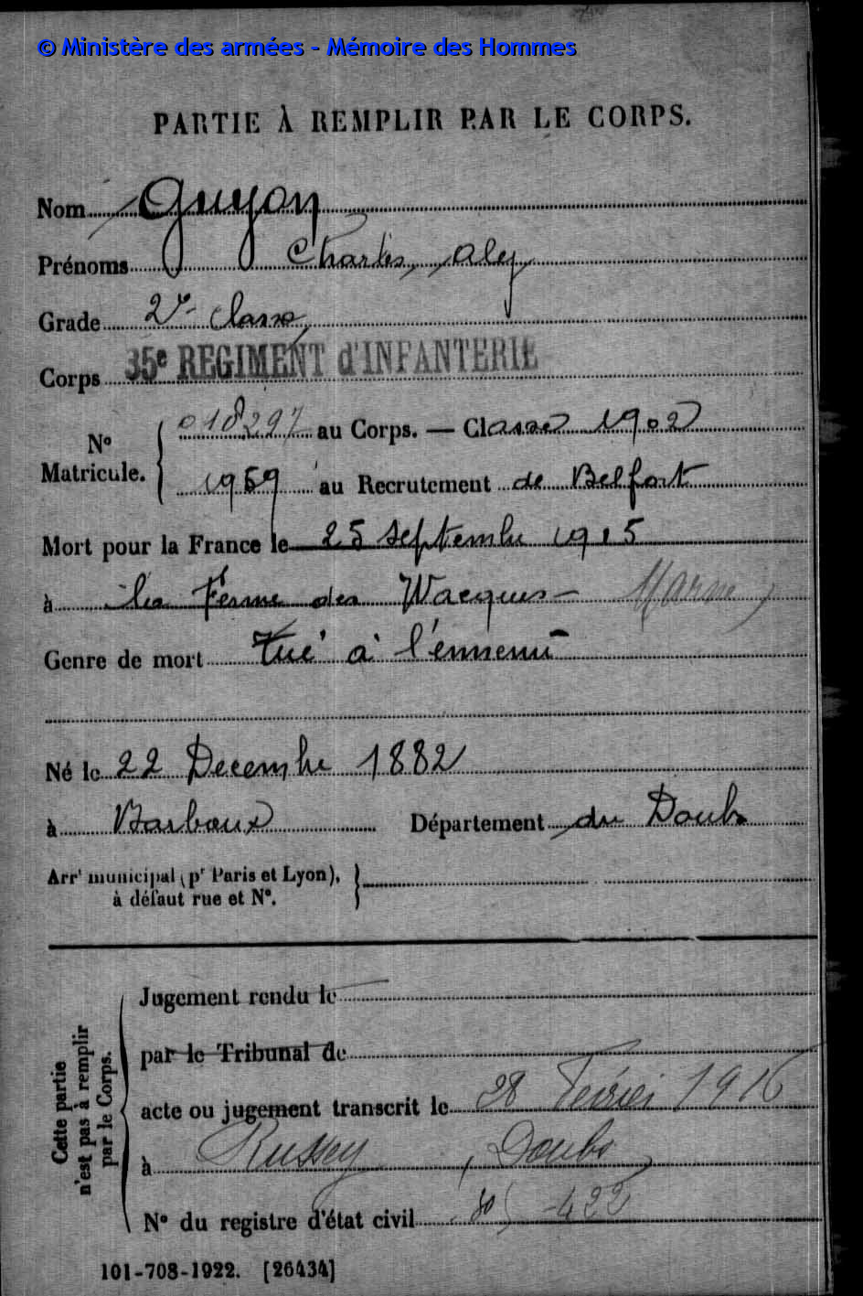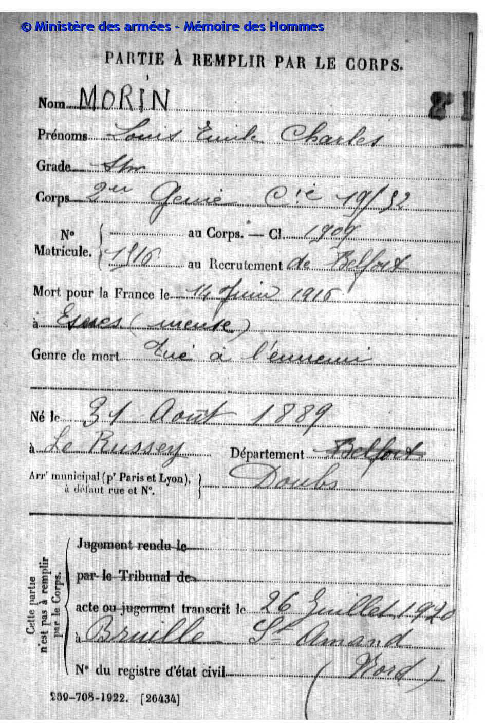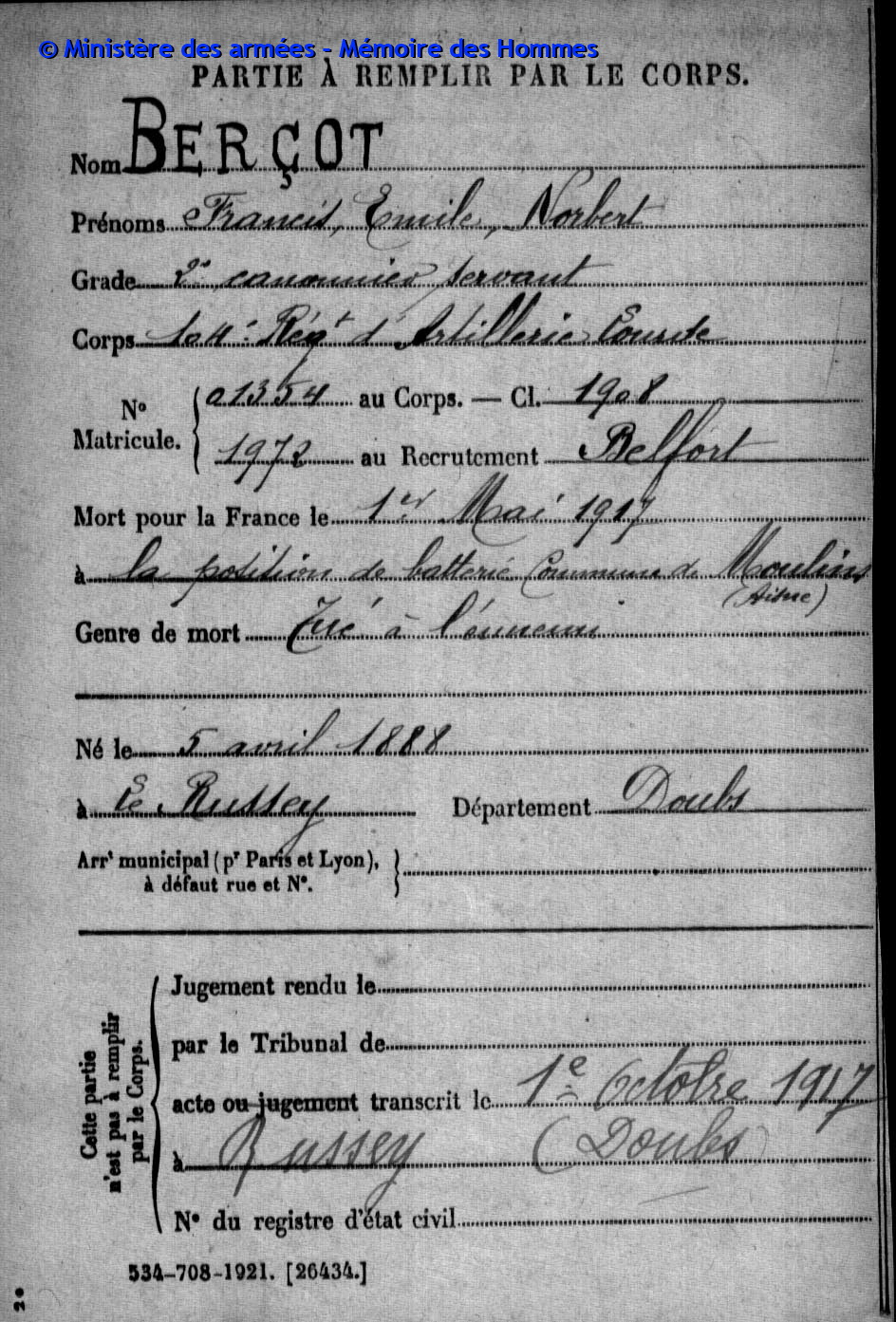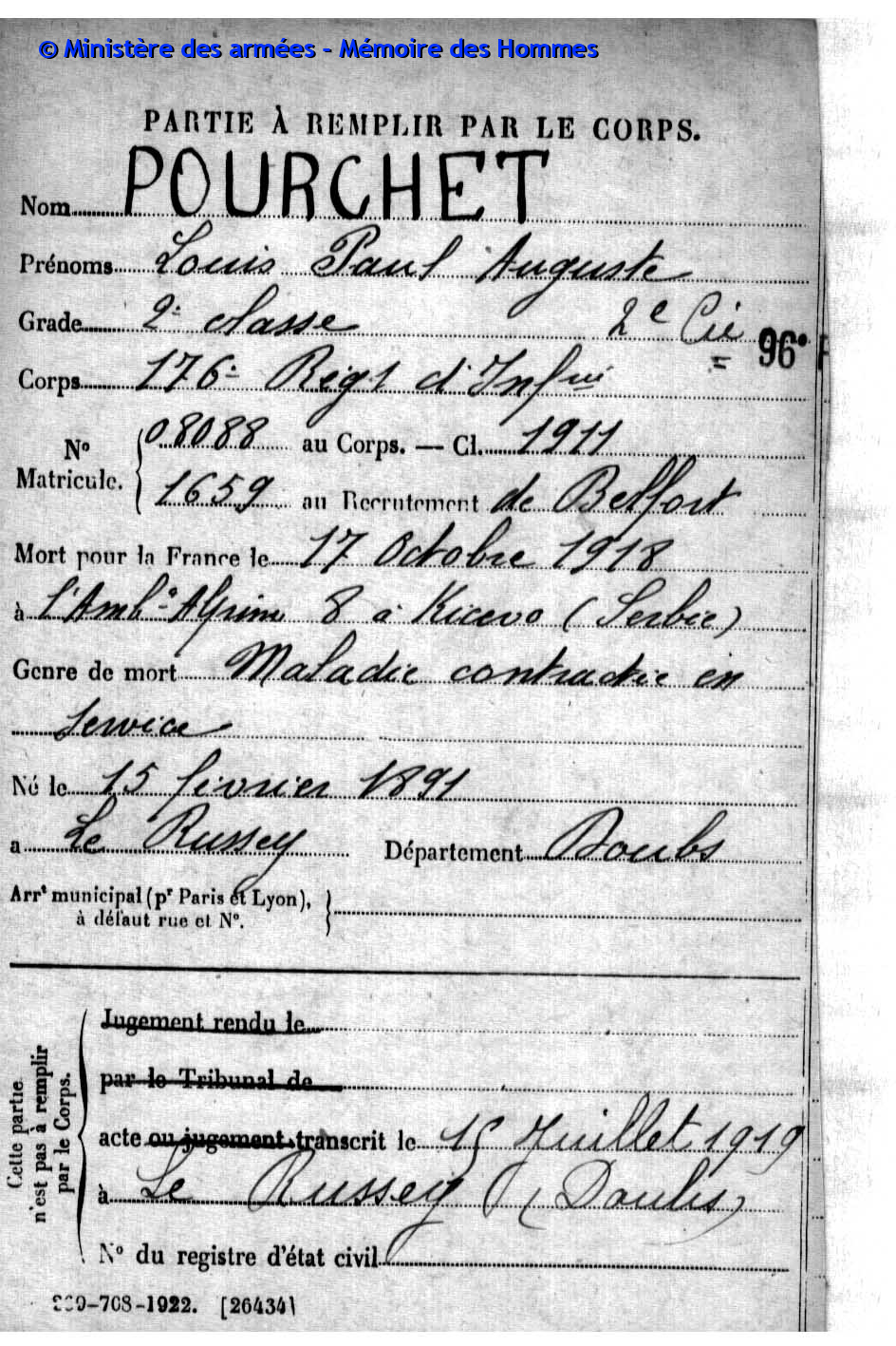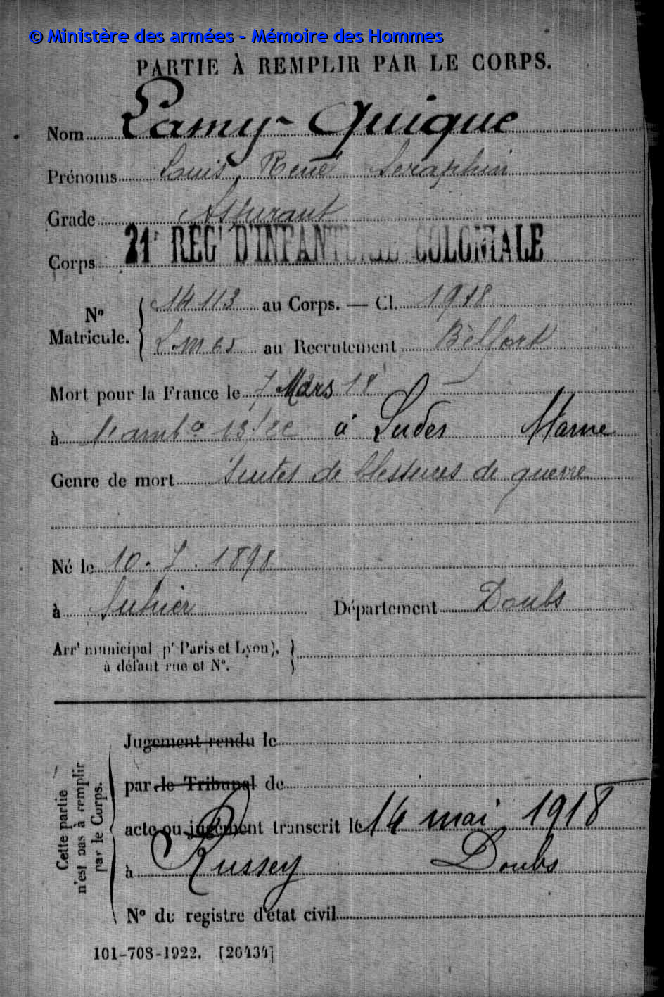 | Soldat PRENOT-GUINNARD Marie Georges Emile 29.05.1897 - 03.05.1918 44ème Régiment d'Infanterie Verstarb durch Krankheit zu Hause in Le Russey (F) |
