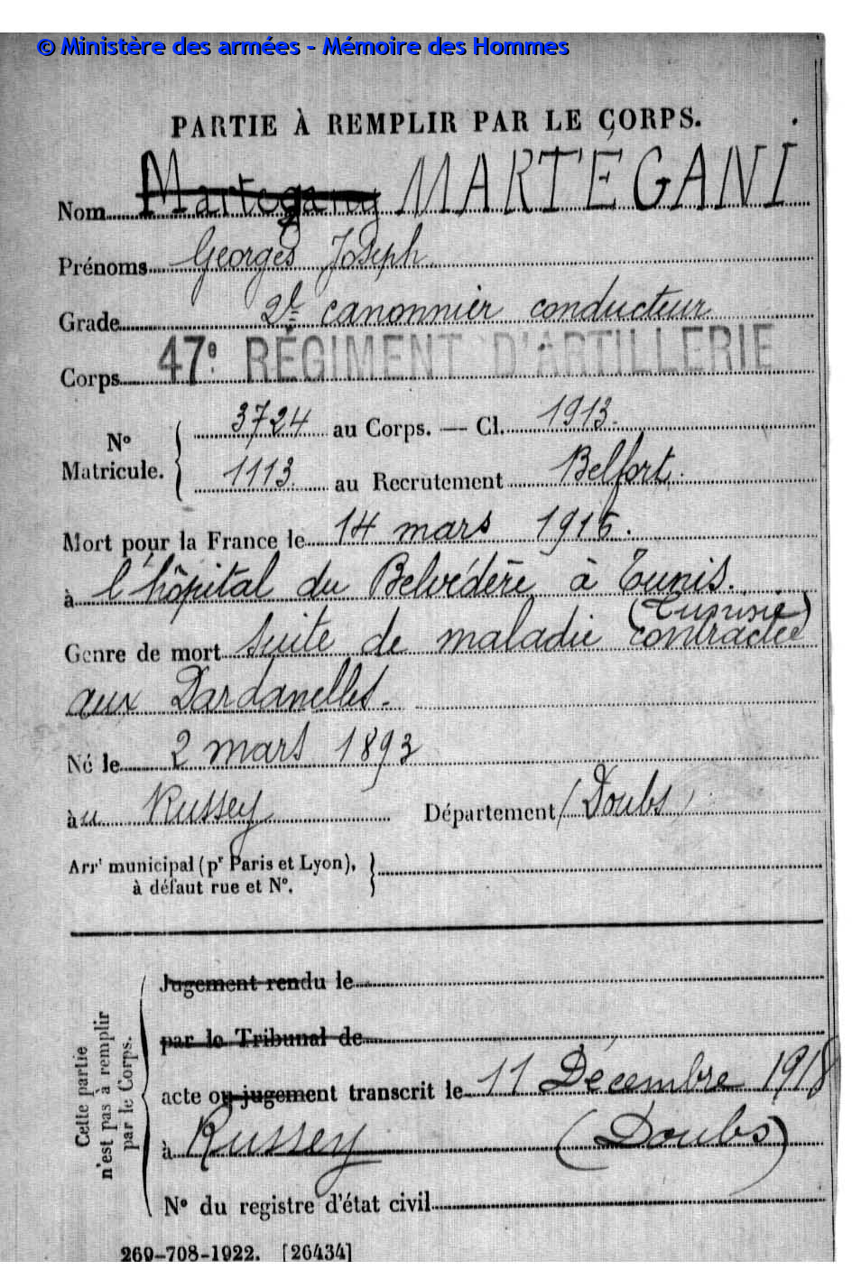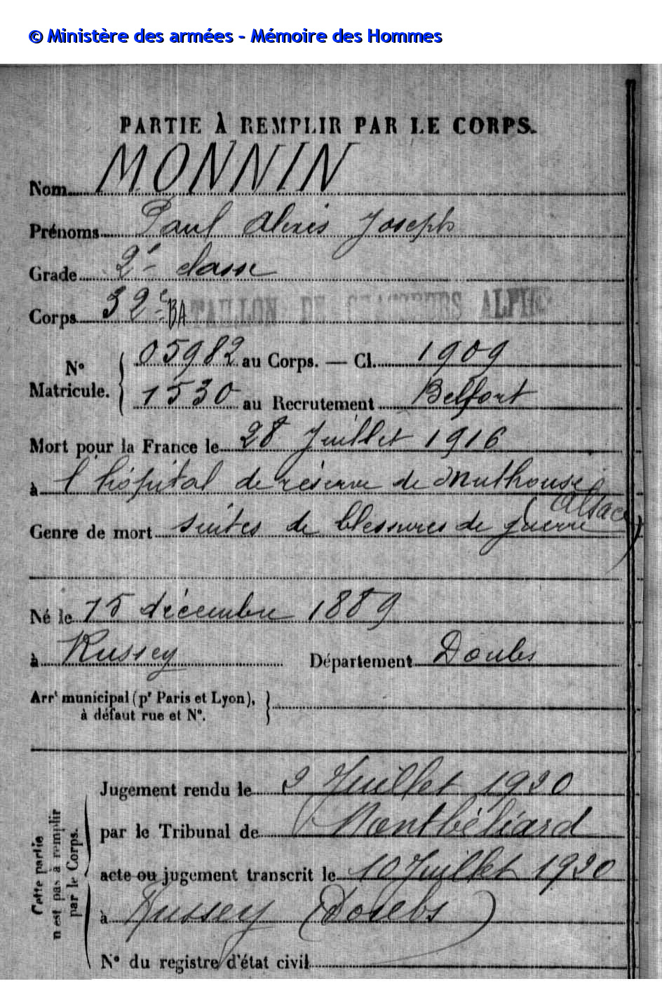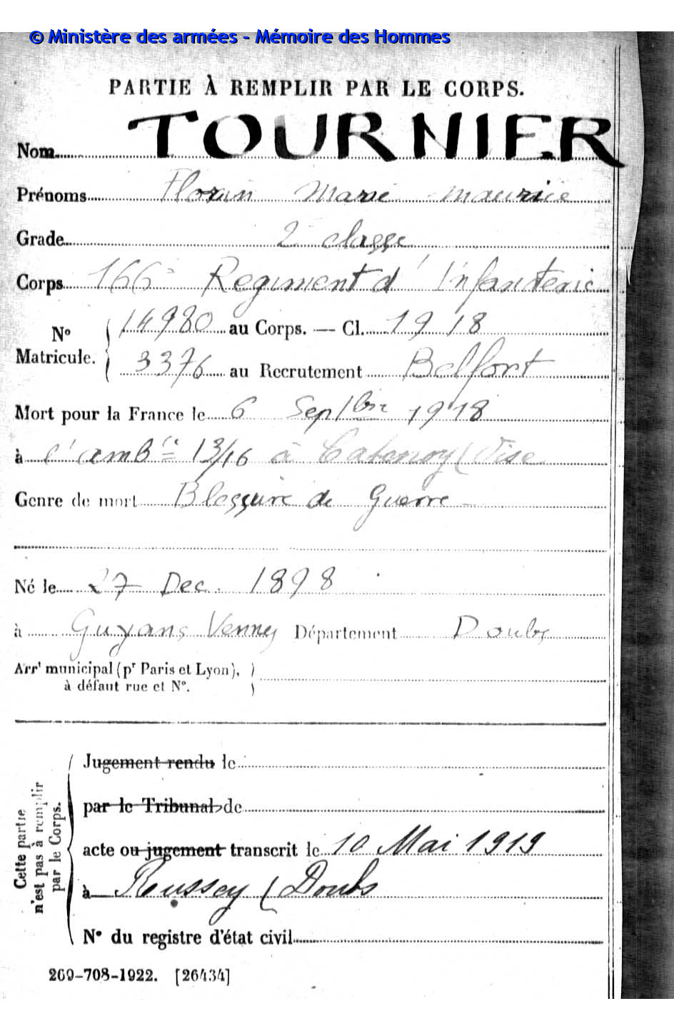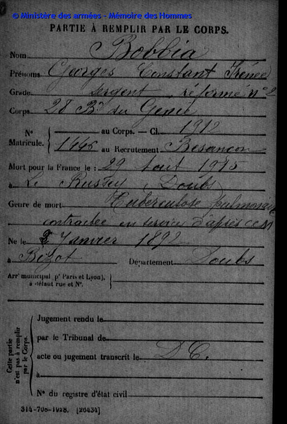 | Soldat PRENOT-GUINNARD Marie Georges Emile 29.05.1897 - 03.05.1918 44ème Régiment d'Infanterie Verstarb durch Krankheit zu Hause in Le Russey (F) |