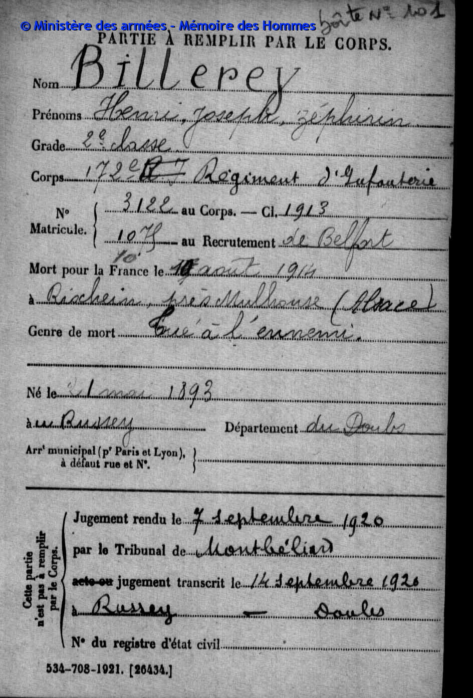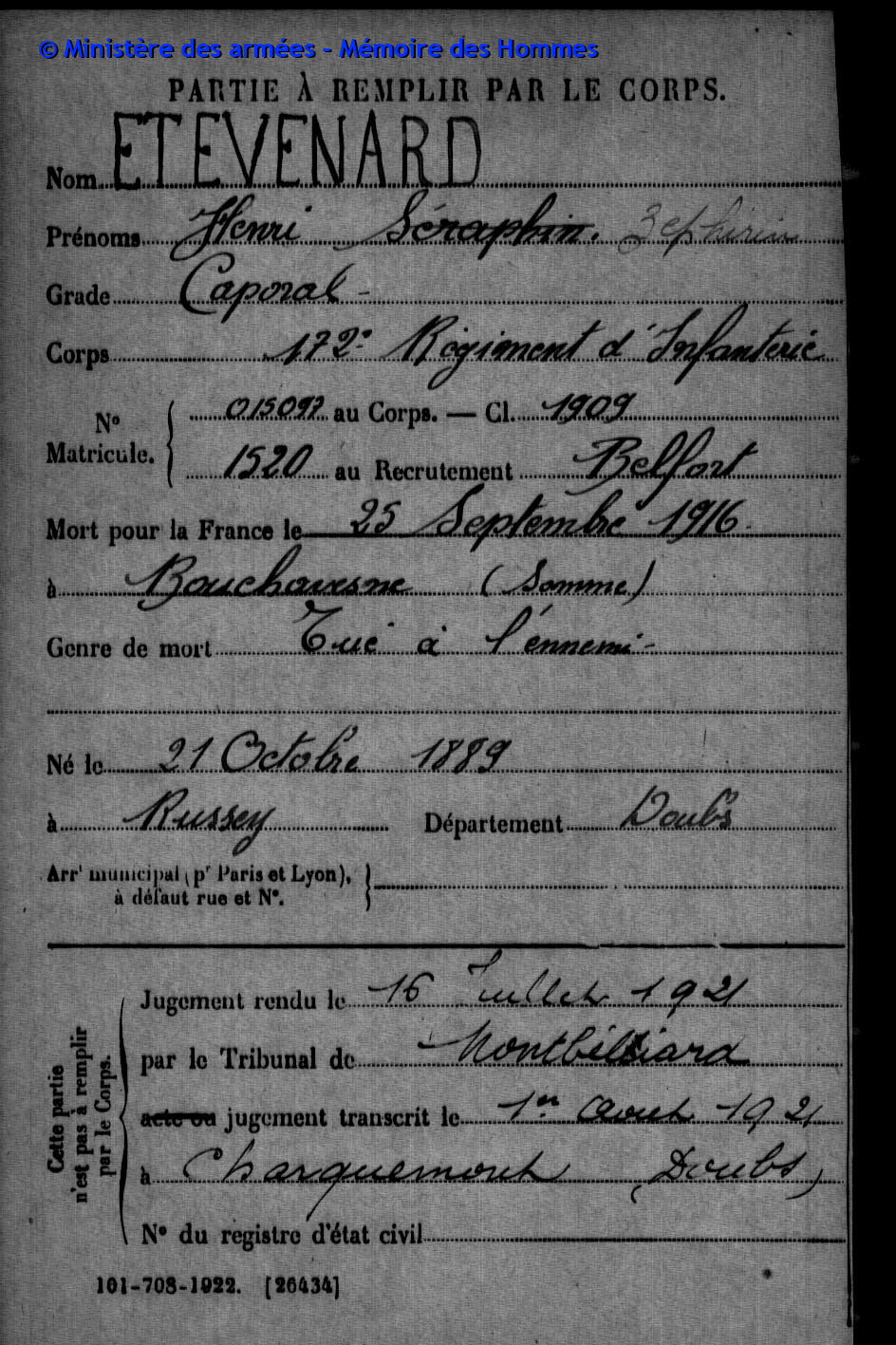 | Caporal ETEVENARD Henri Zephirin 21.10.1889 - 25.09.1916 172ème Régiment d'Infanterie Gefallen in Bouchavesnes - Somme (F) |