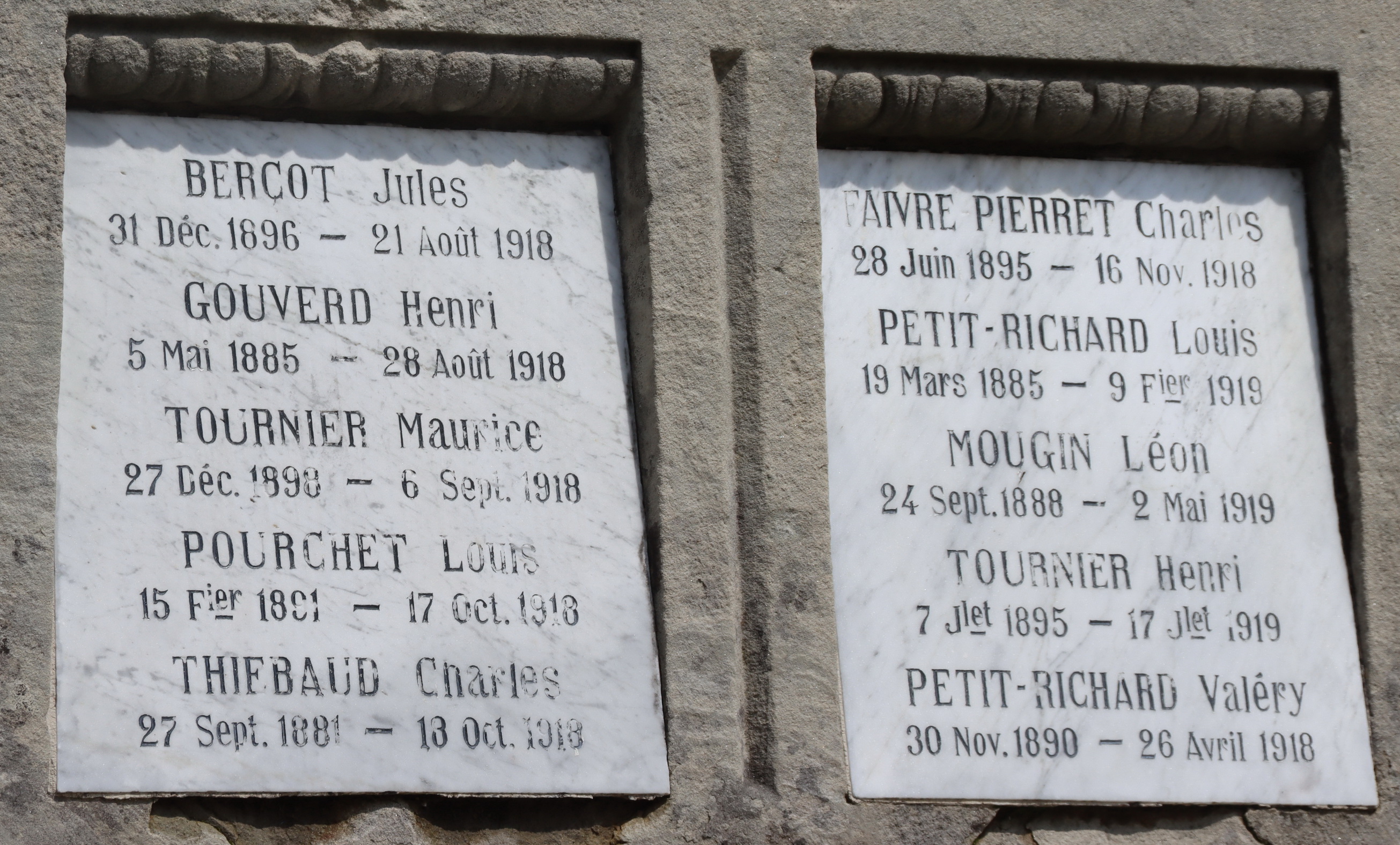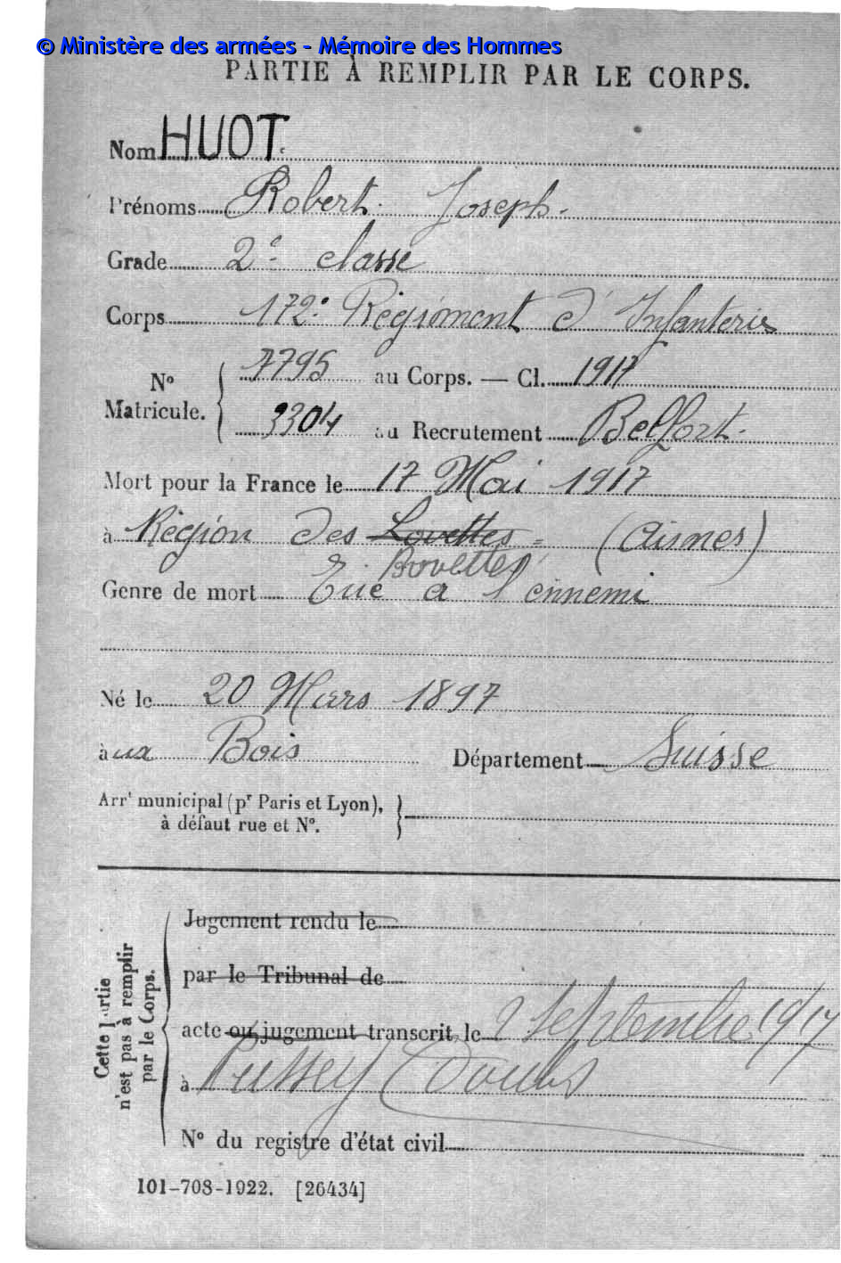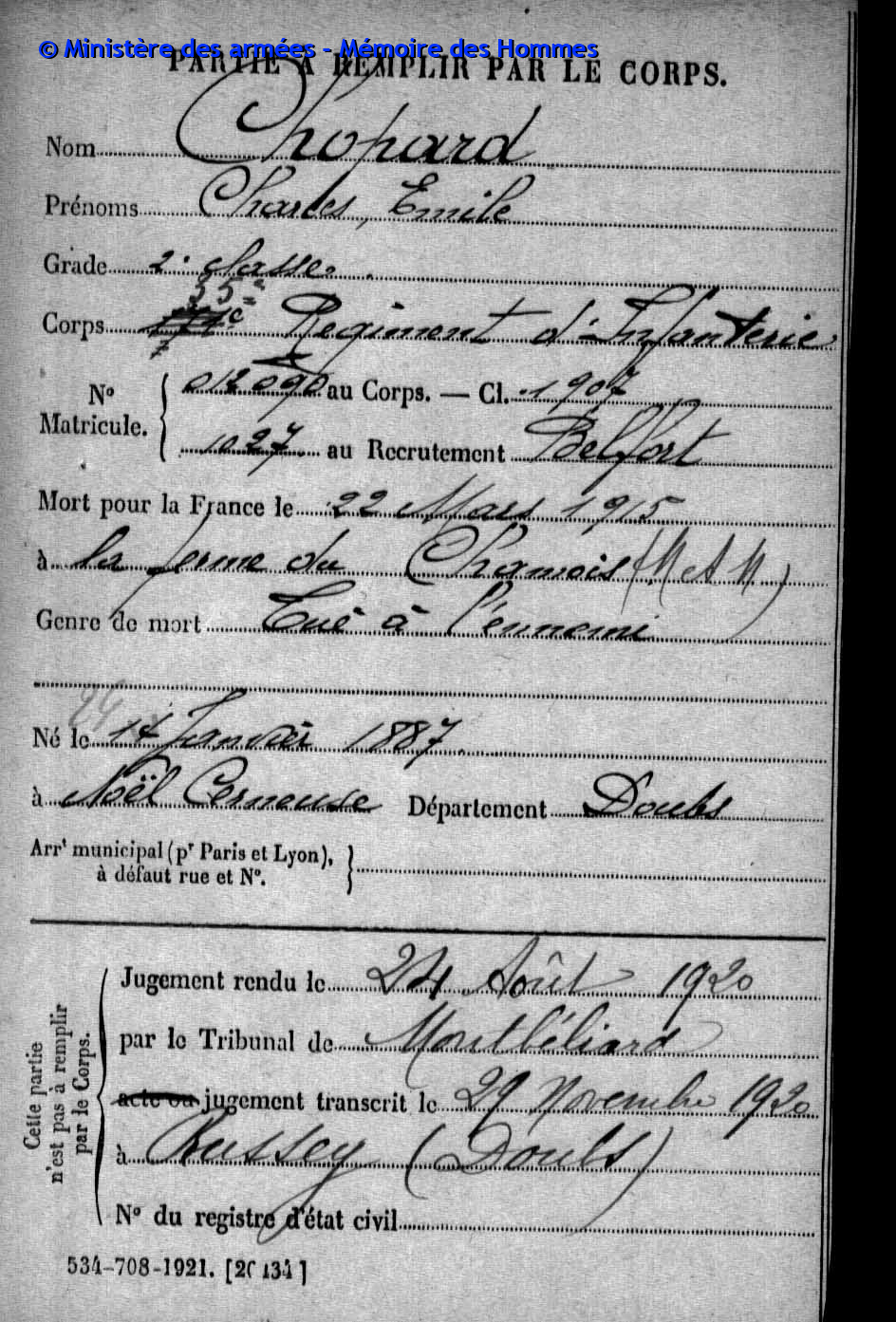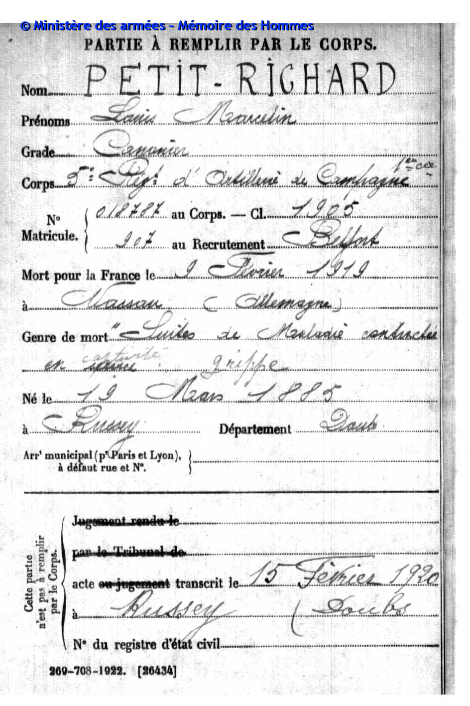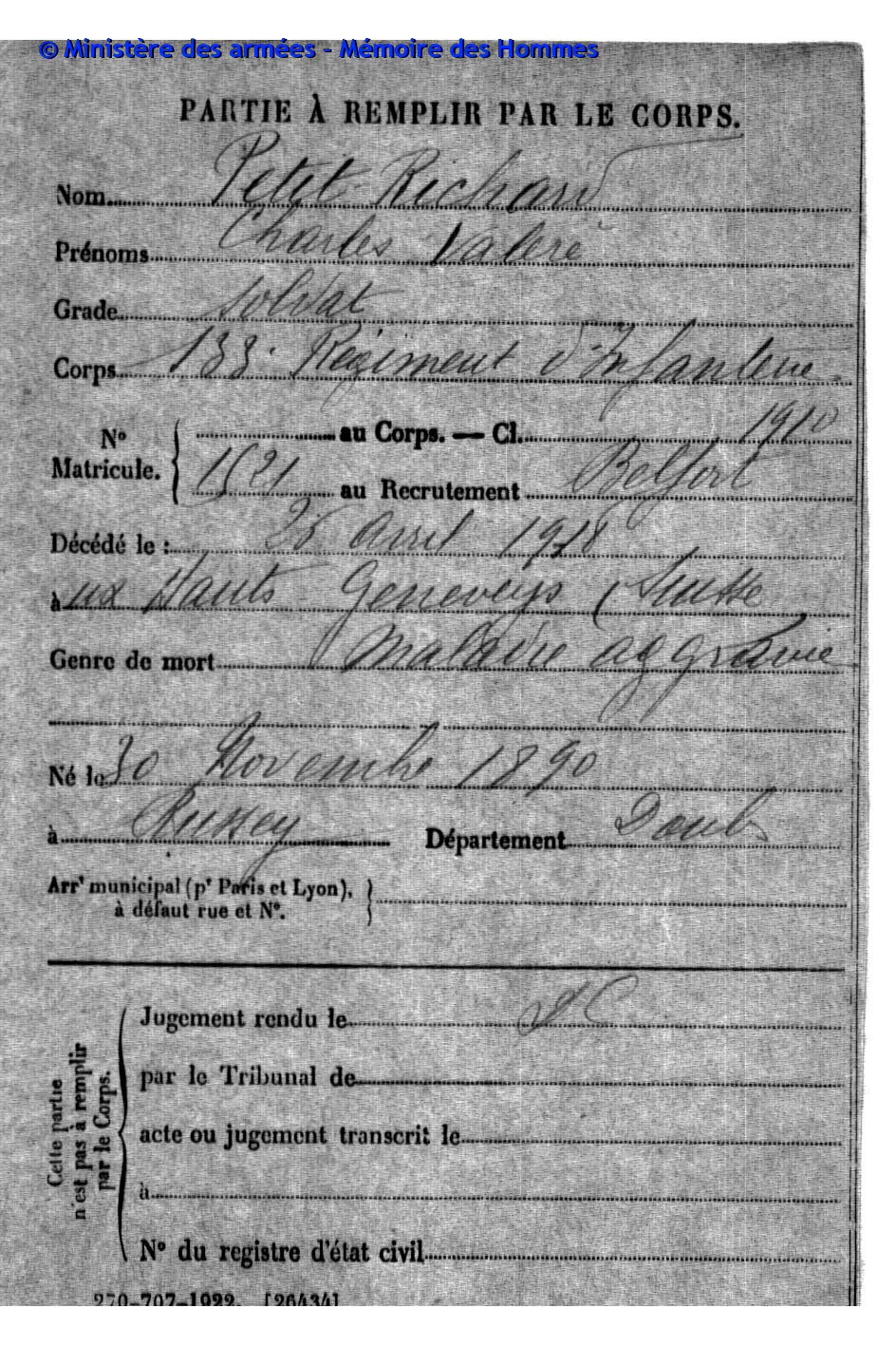 | Soldat PETIT-RICHARD Charles Valère 30.11.1890 - 26.04.1918 133ème Régiment d'Infanterie Verstarb durch Krankheit in Hauts-Geneveys (CH) |