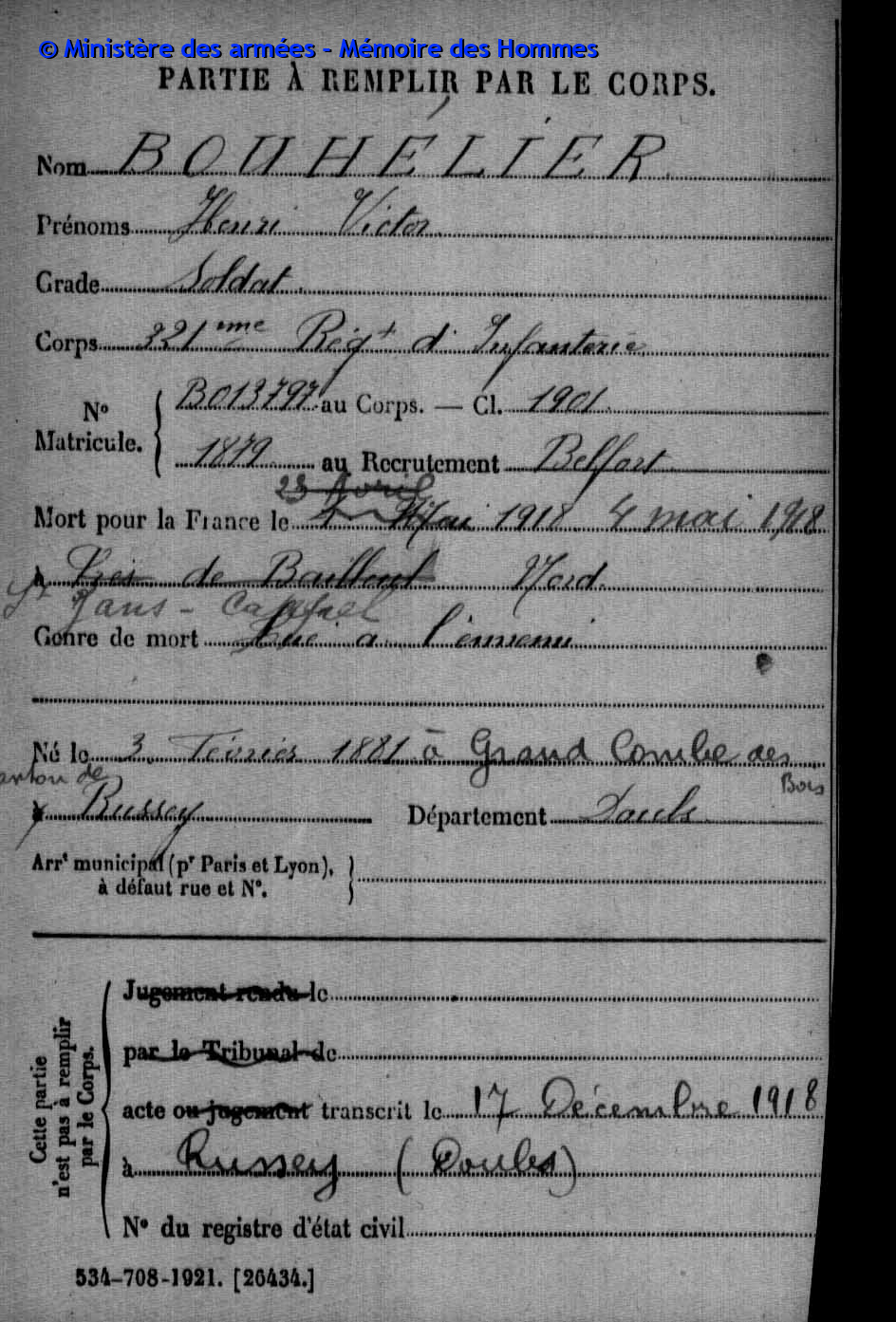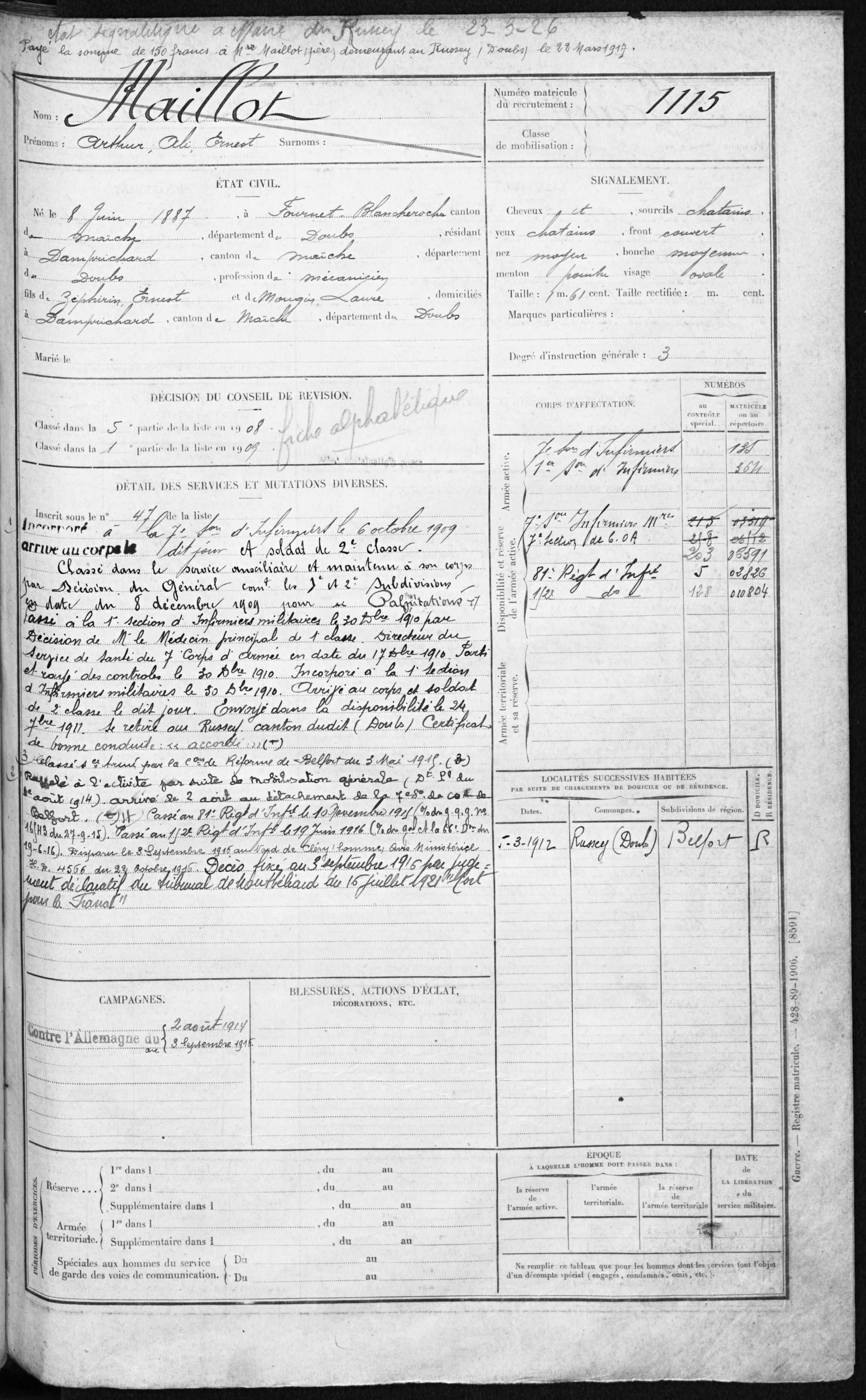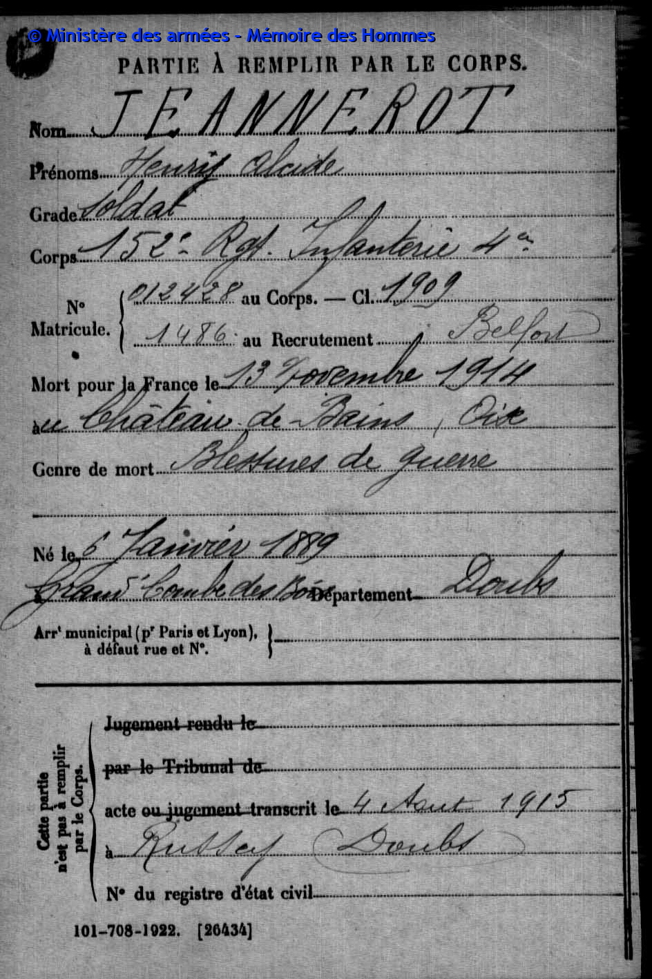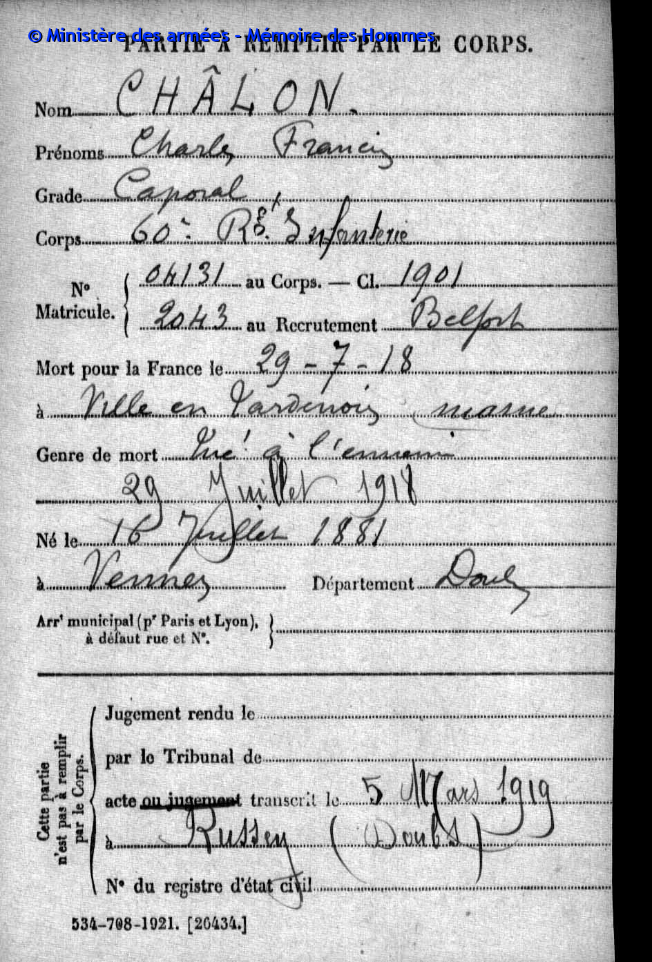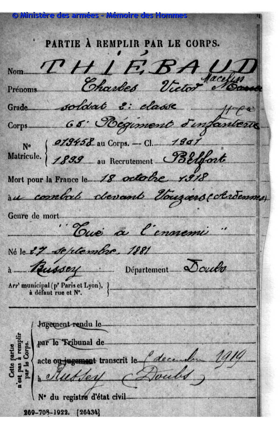 | Soldat PETIT-RICHARD Charles Valère 30.11.1890 - 26.04.1918 133ème Régiment d'Infanterie Verstarb durch Krankheit in Hauts-Geneveys (CH) |
