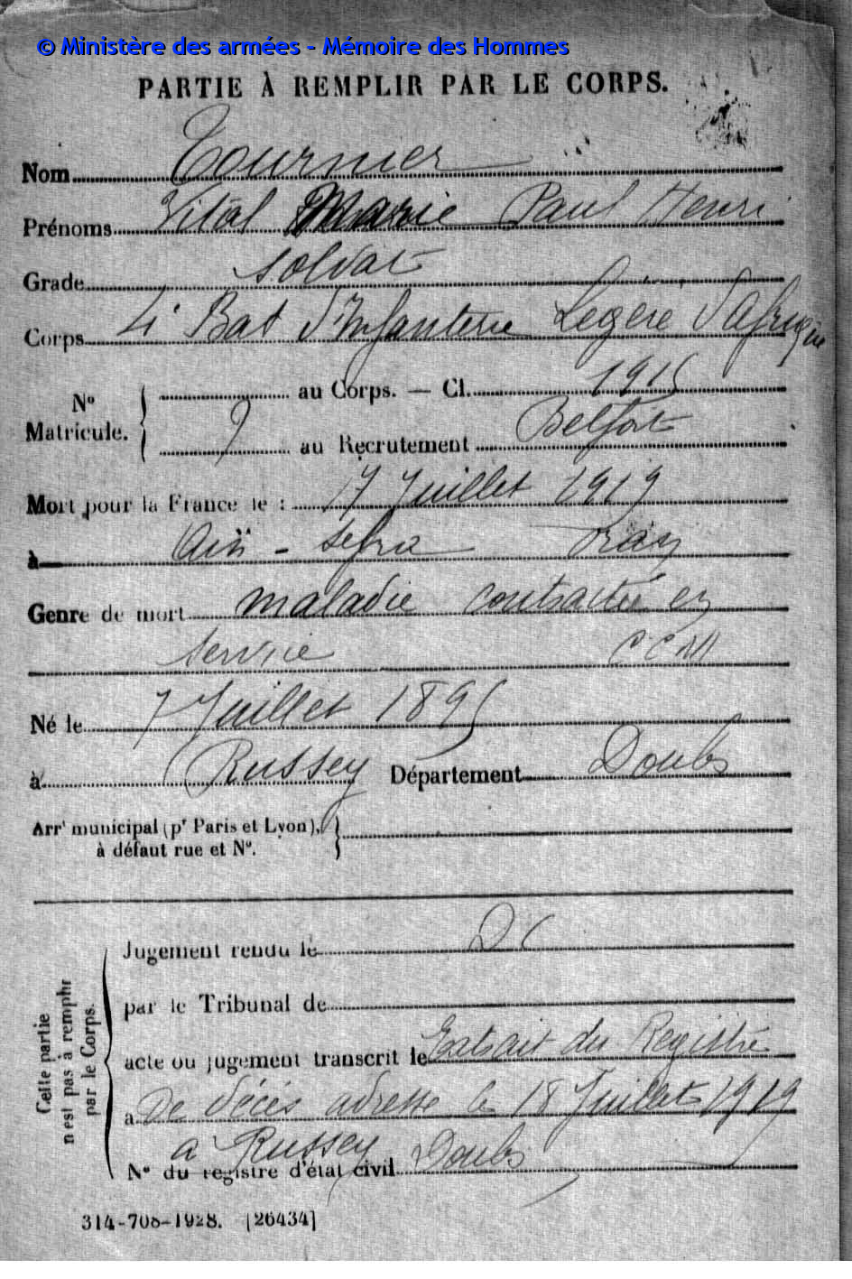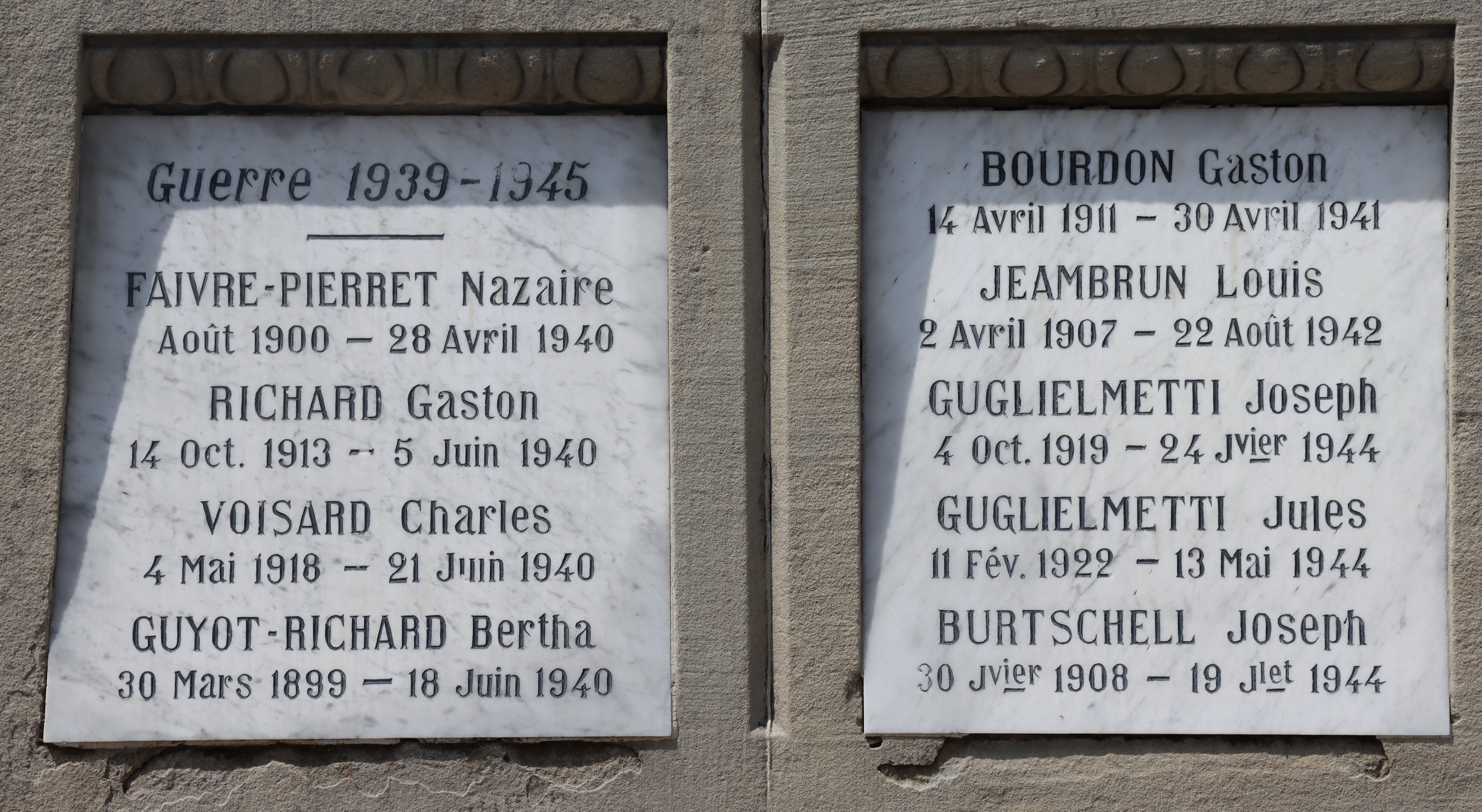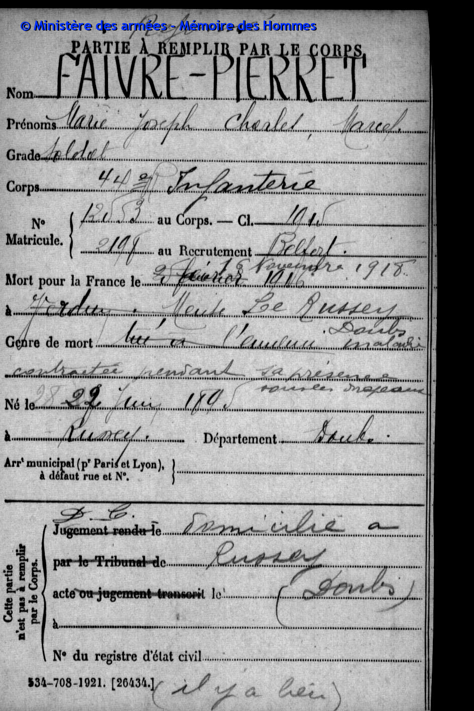 | Soldat FAIVRE-PIERRET Nazaire Marc Arsène 09.08.1900 - 28.04.1940 77ème Régiment Régional Dépôt d'Artillerie No.7 Verstarb durch Krankheit im Hôpital complémentaire de gare No.4 in Vesoul (F) |