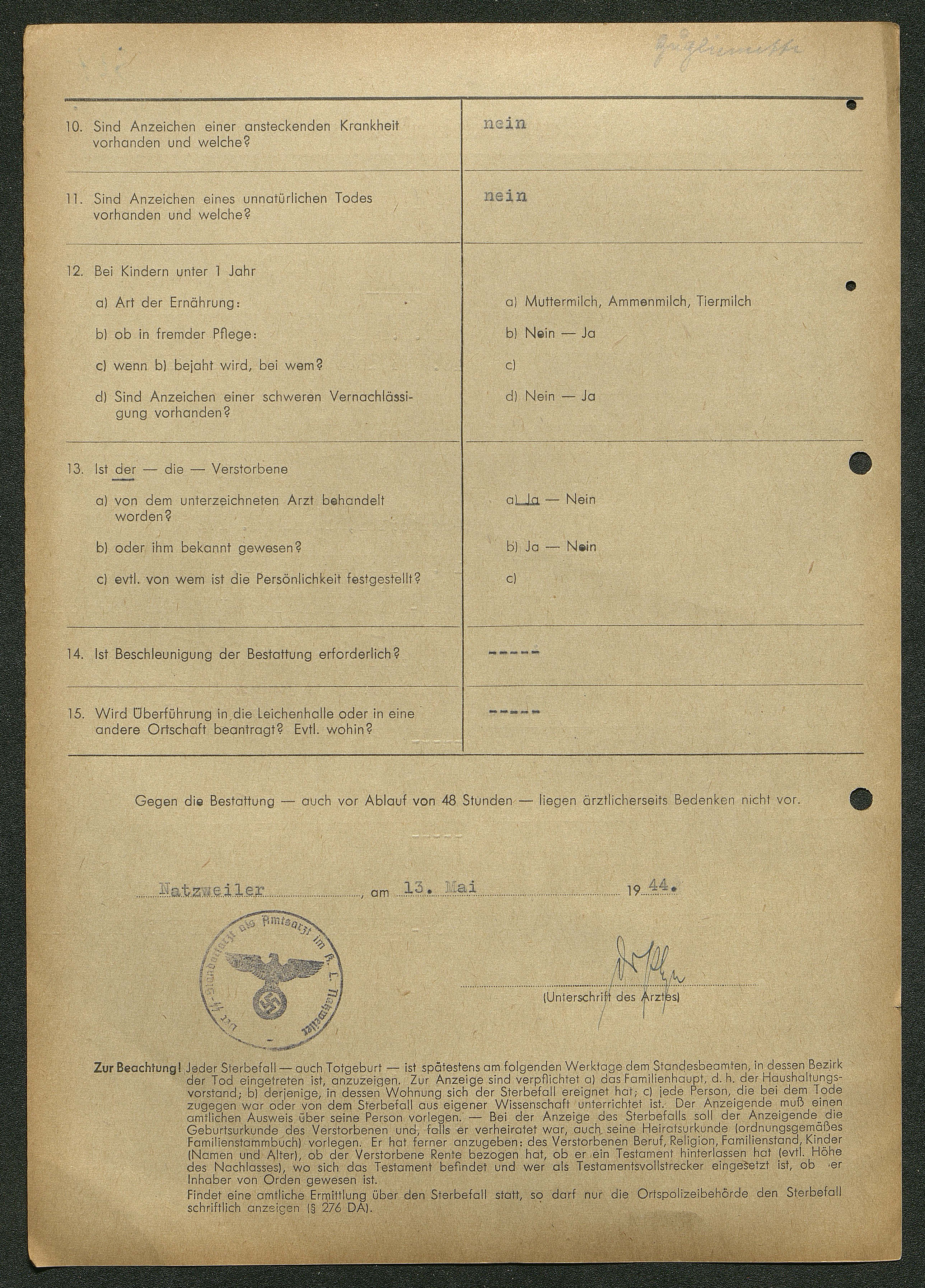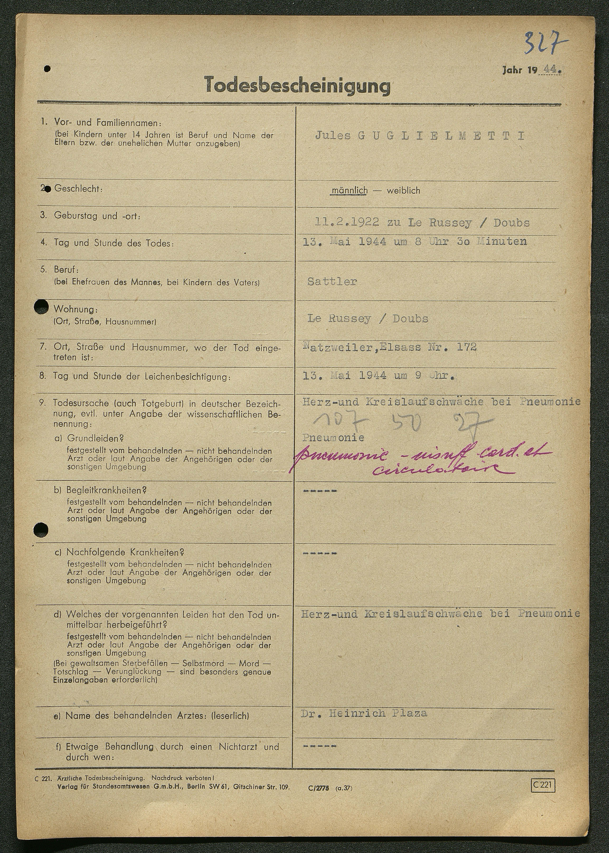| Laut Todesbescheinigung verstarb Jules Léon Jean am 13.05.1944 um 08.30 Uhr an Herz-und Kreislaufschwäche bei Pneumonie. Unterzeichnet von Lagerarzt und SS-Hauptsturmführer Dr. Heinrich Plaza (10.07.1912 - 20.02.1968) Auf Grund einer fortgeschrittenen Multiplen Sklerose wurde das Ermittlungsverfahren gegen den KZ-Arzt 1952 von der Staatsanwaltschaft Traunstein eingestellt. 1954 von einem französischen Militärgericht im Abwesenheit zum Tode verurteilt. |