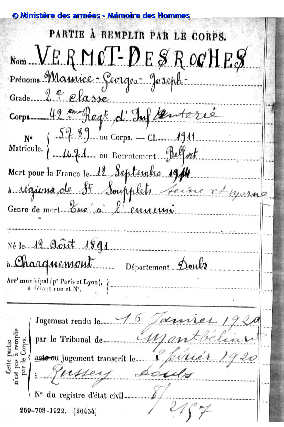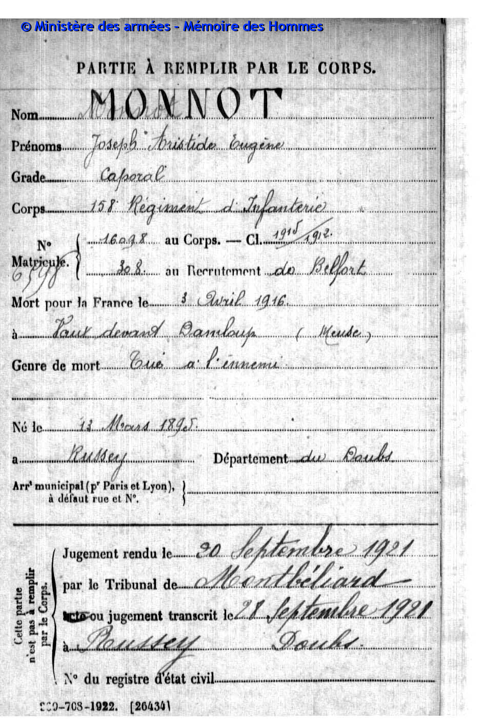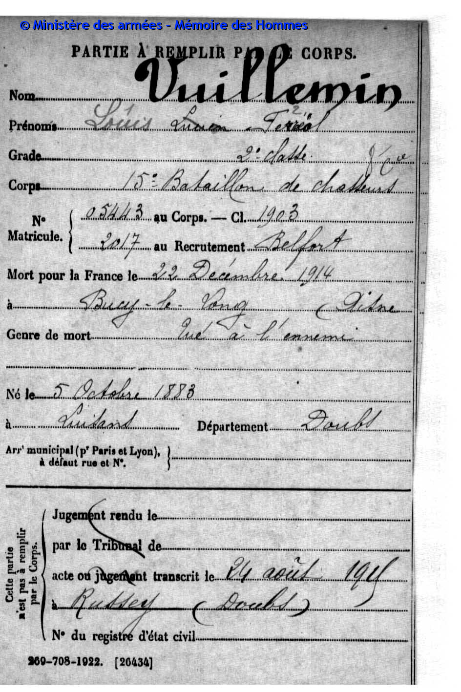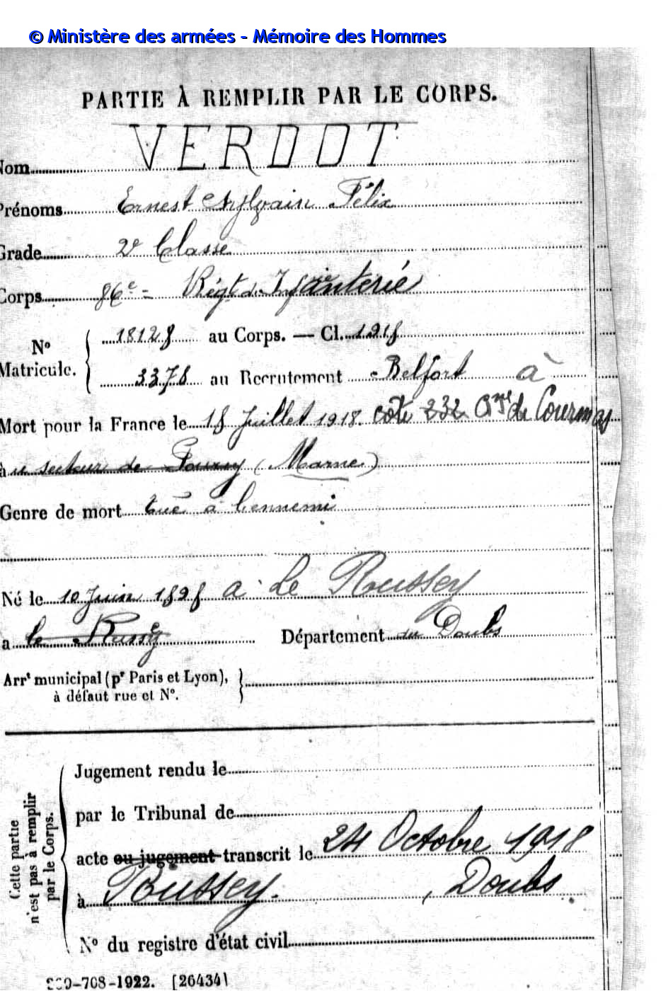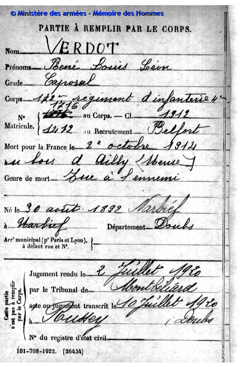 | Caporal VERDOT René Louis Léon 30.08.1892 - 02.10.1914 172ème Régiment d'Infanterie Gefallen in Bois d'Ailly - Meuse (F) |