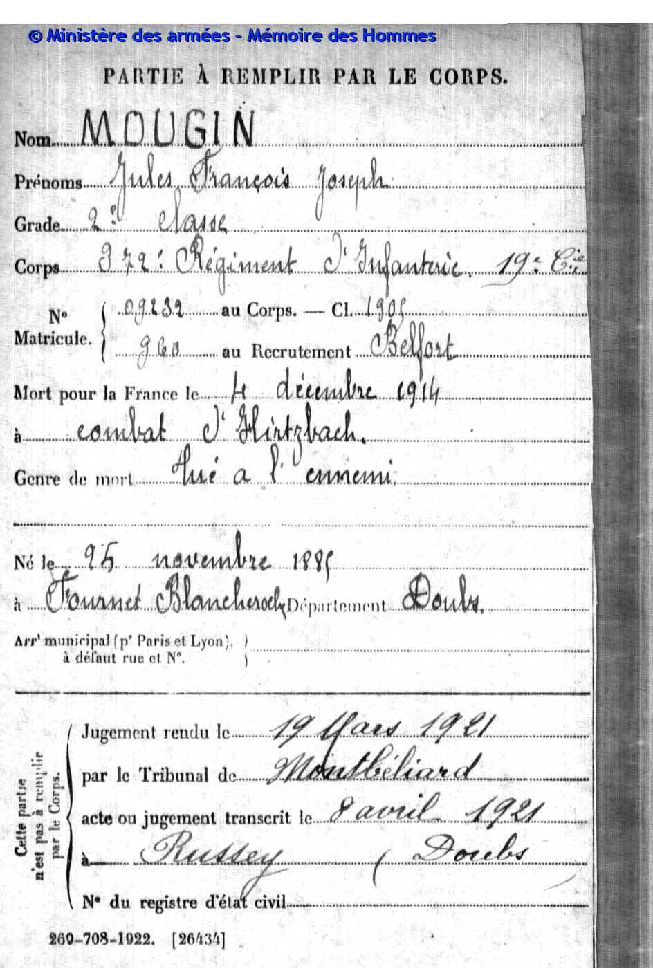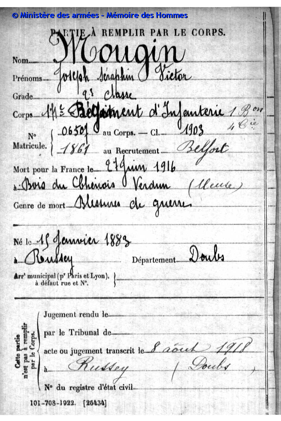 2ème classe MOUGIN Joseph Seraphin Victor 15.01.1883 - 27.06.1916 171ème Régiment d'Infanterie Verstarb durch Verwundung in Verdun (F) |
