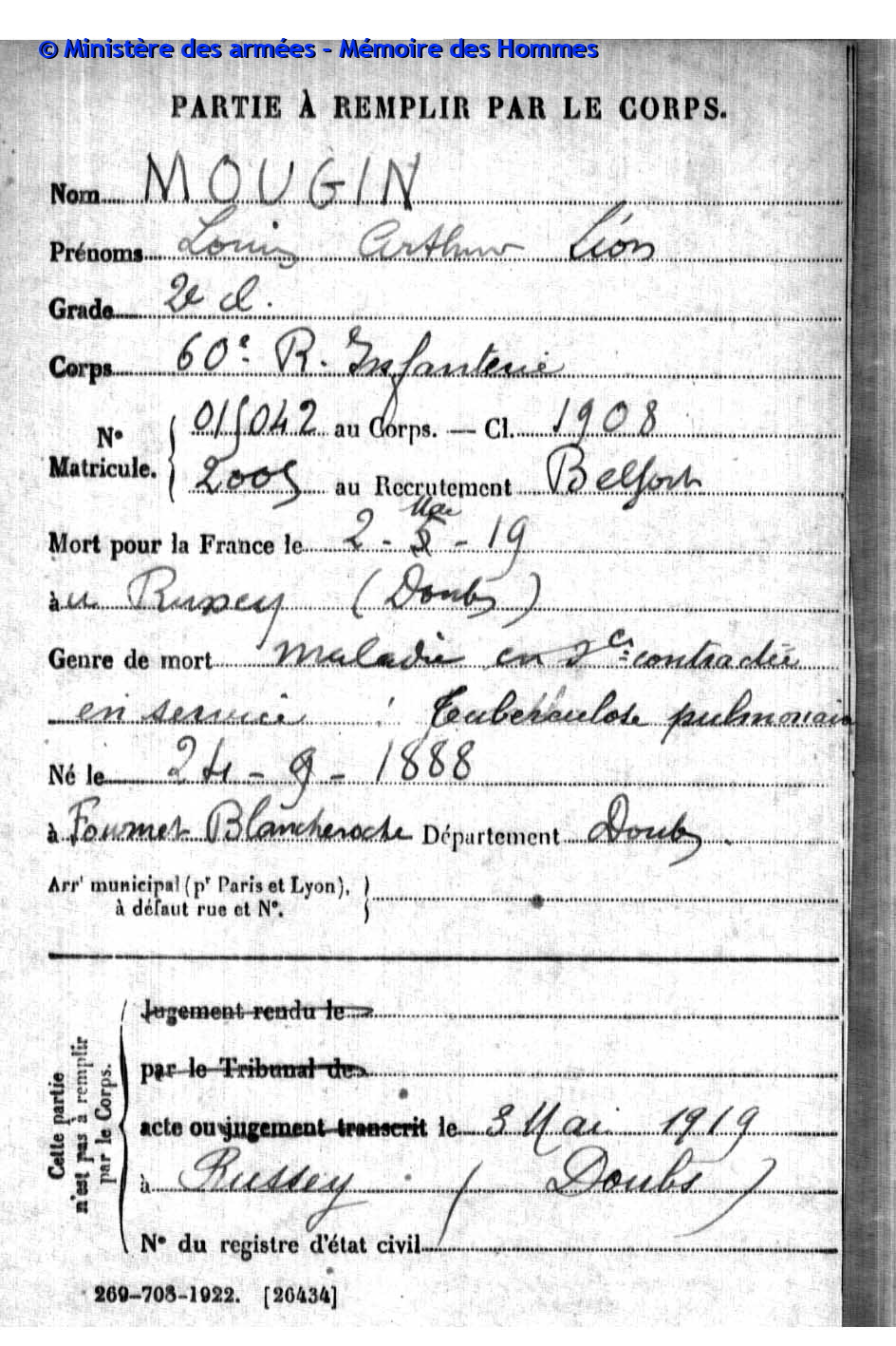 2ème classe MOUGIN Louis Arthur Léon 24.09.1888 - 02.05.1919 60ème Régiment d'Infanterie Verstarb durch Krankheit zu Hause in Fournet-Blancheroche (F) |