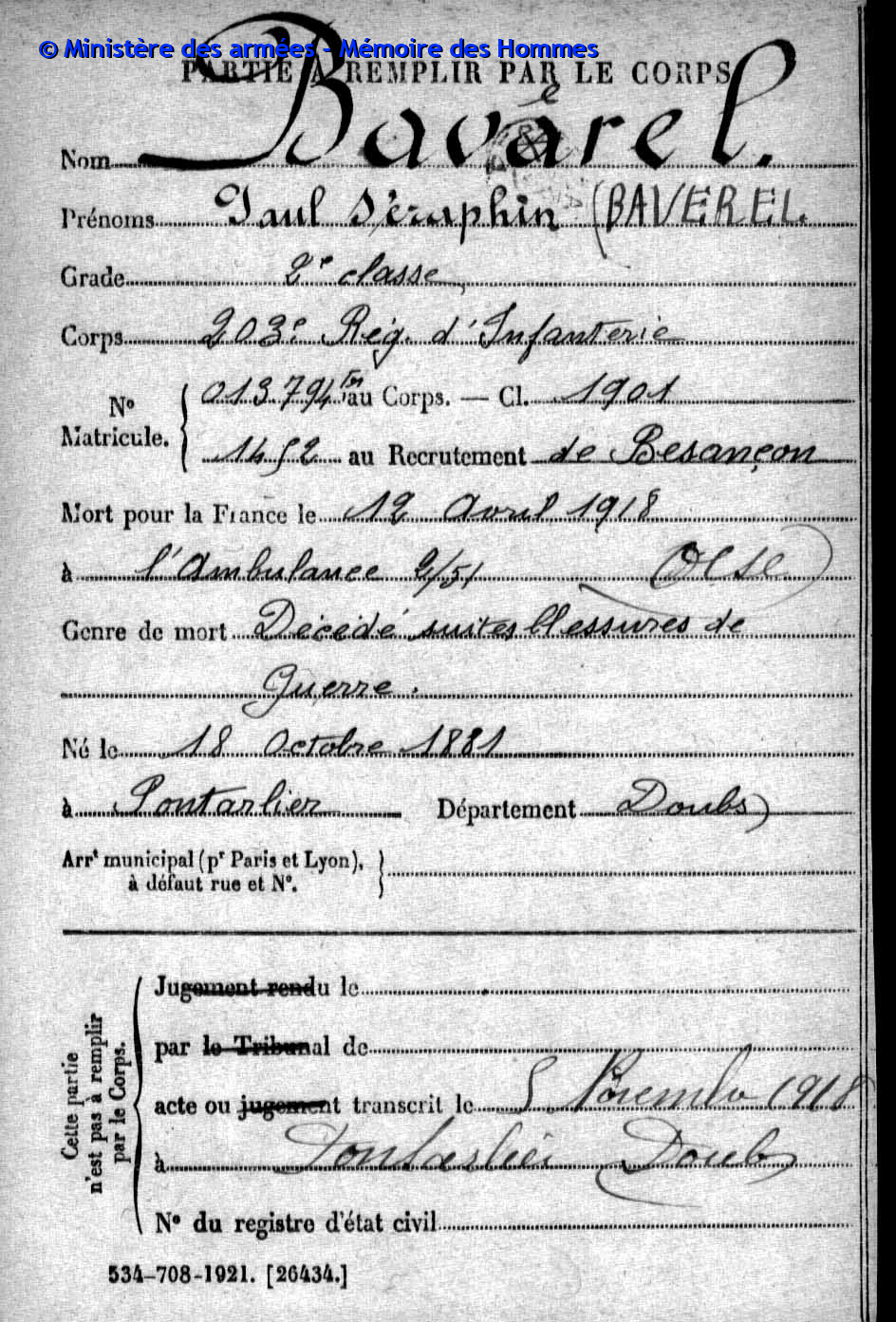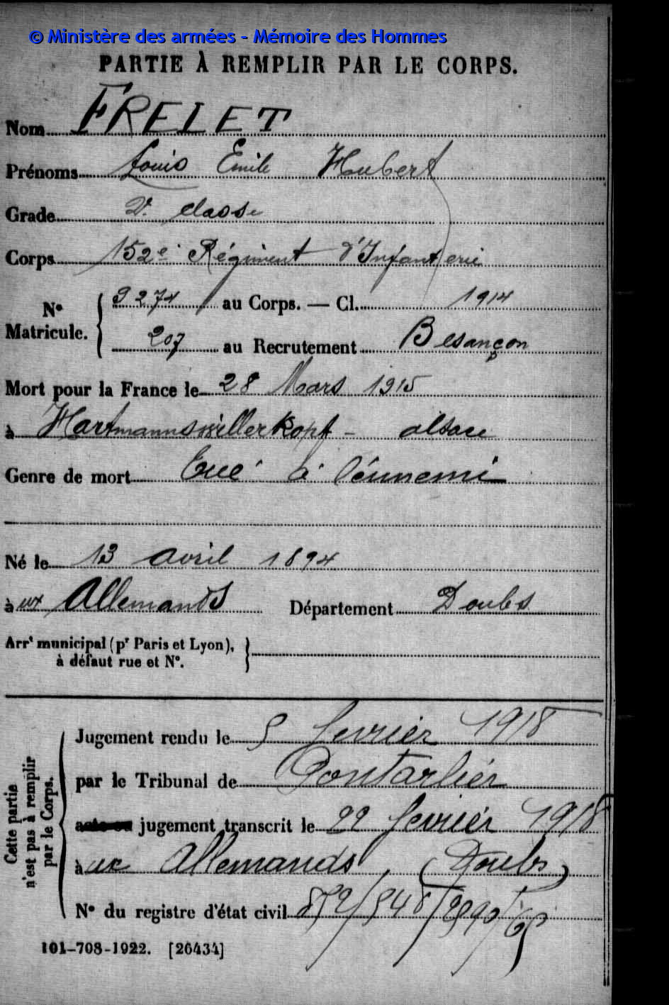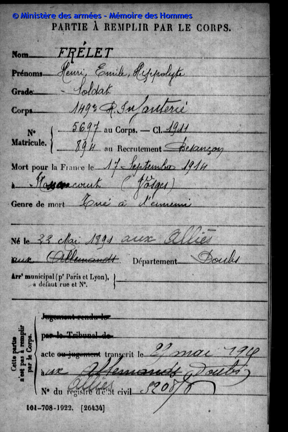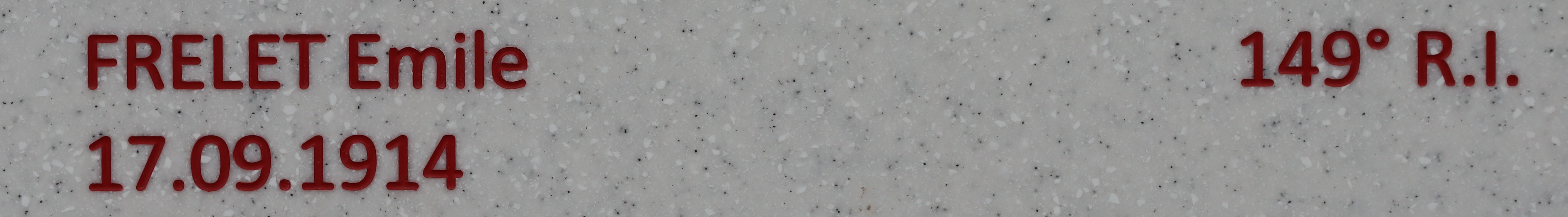 Canonnier FRELET Louis Ulysse 09.04.1883 - 08.11.1919 16ème Régiment d'Artillerie de Campagne (R.A.C.) Verstorben an Krankheit von Kriegsfolgen zu Hause in Les Alliés (F) |