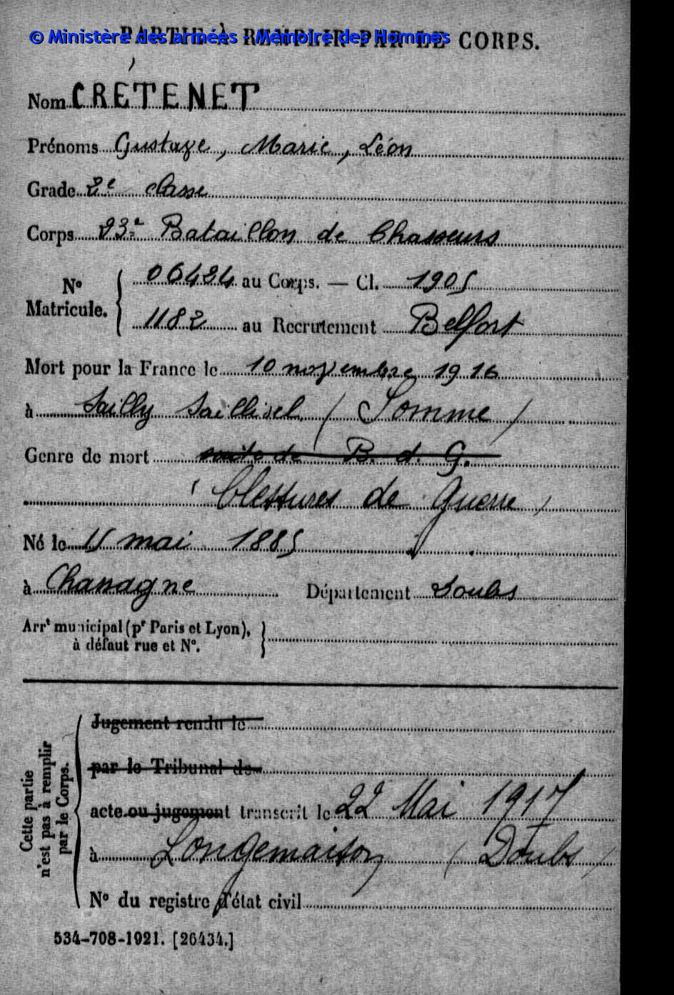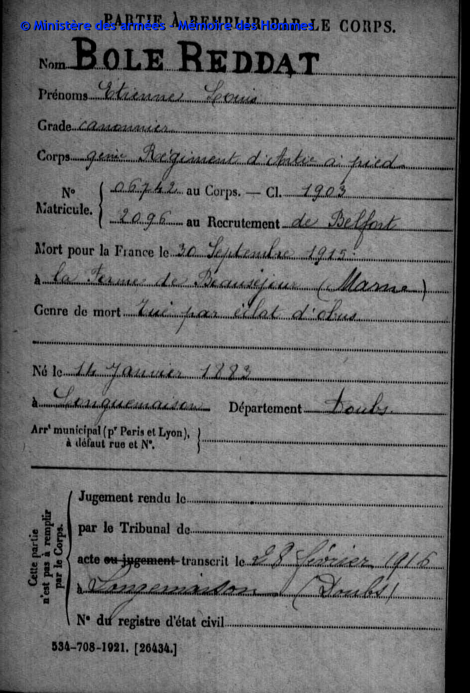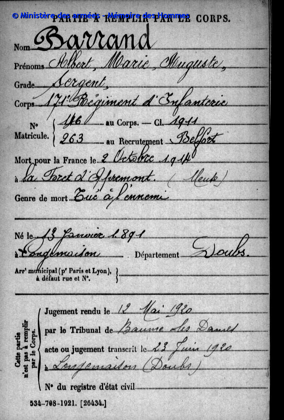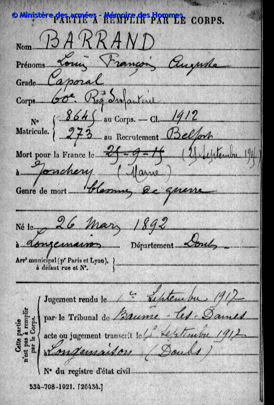 | Caporal BARRAND Louis François Auguste 26.03.1892 - 25.09.1915 60ème Régiment d'Infanterie Verstarb an seinen Wunden in Jonchery - Marne (F) |