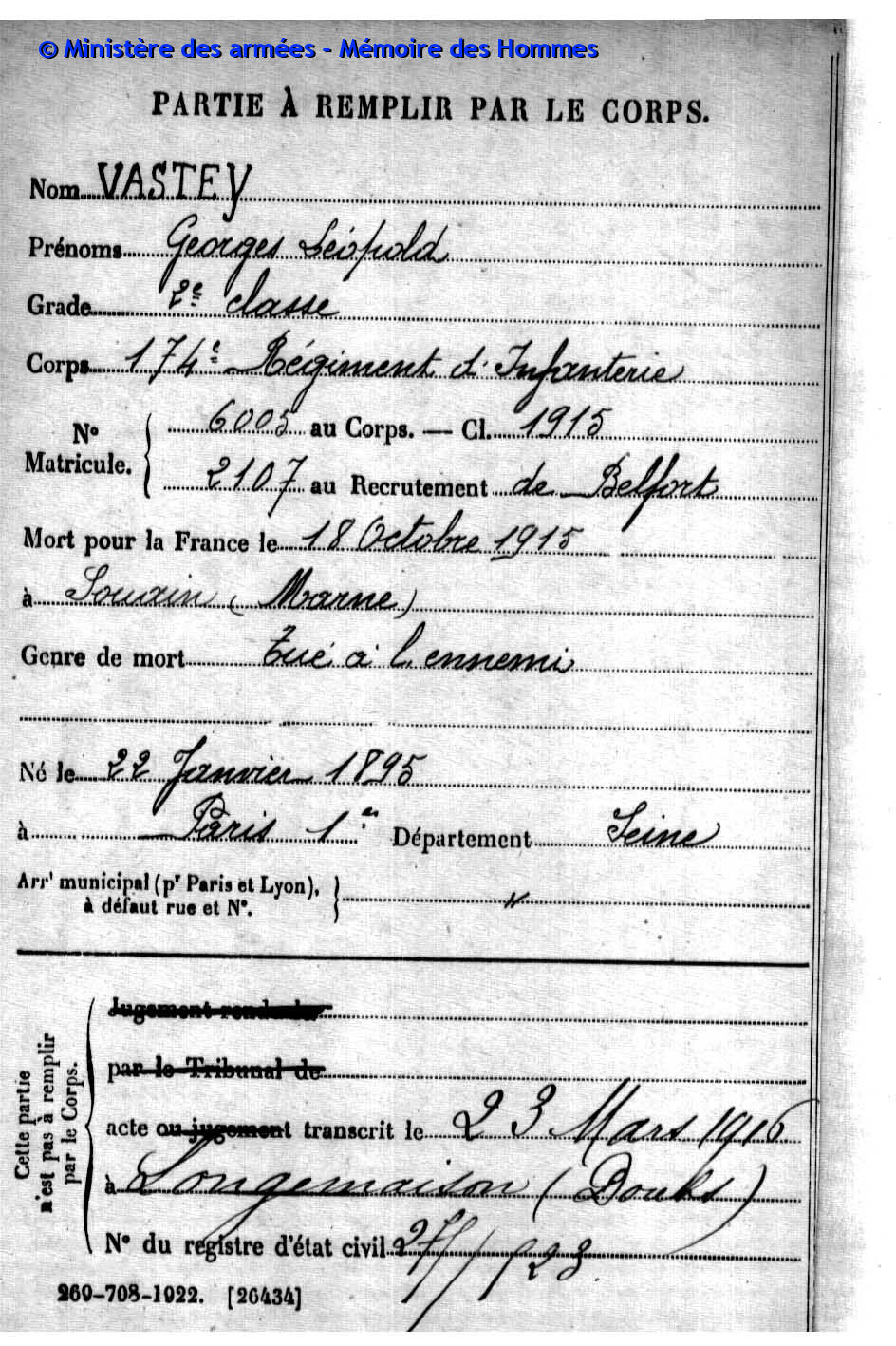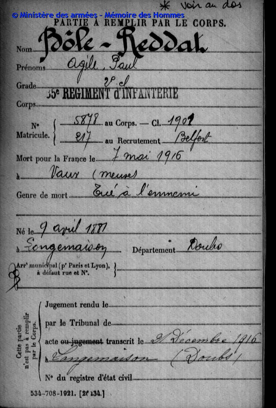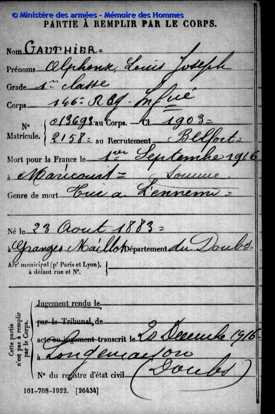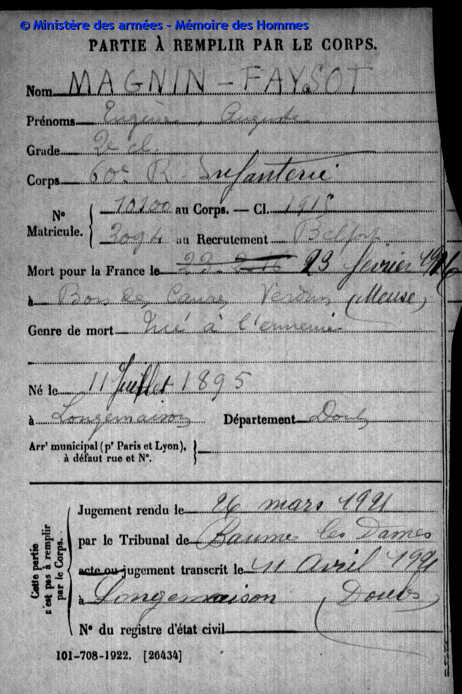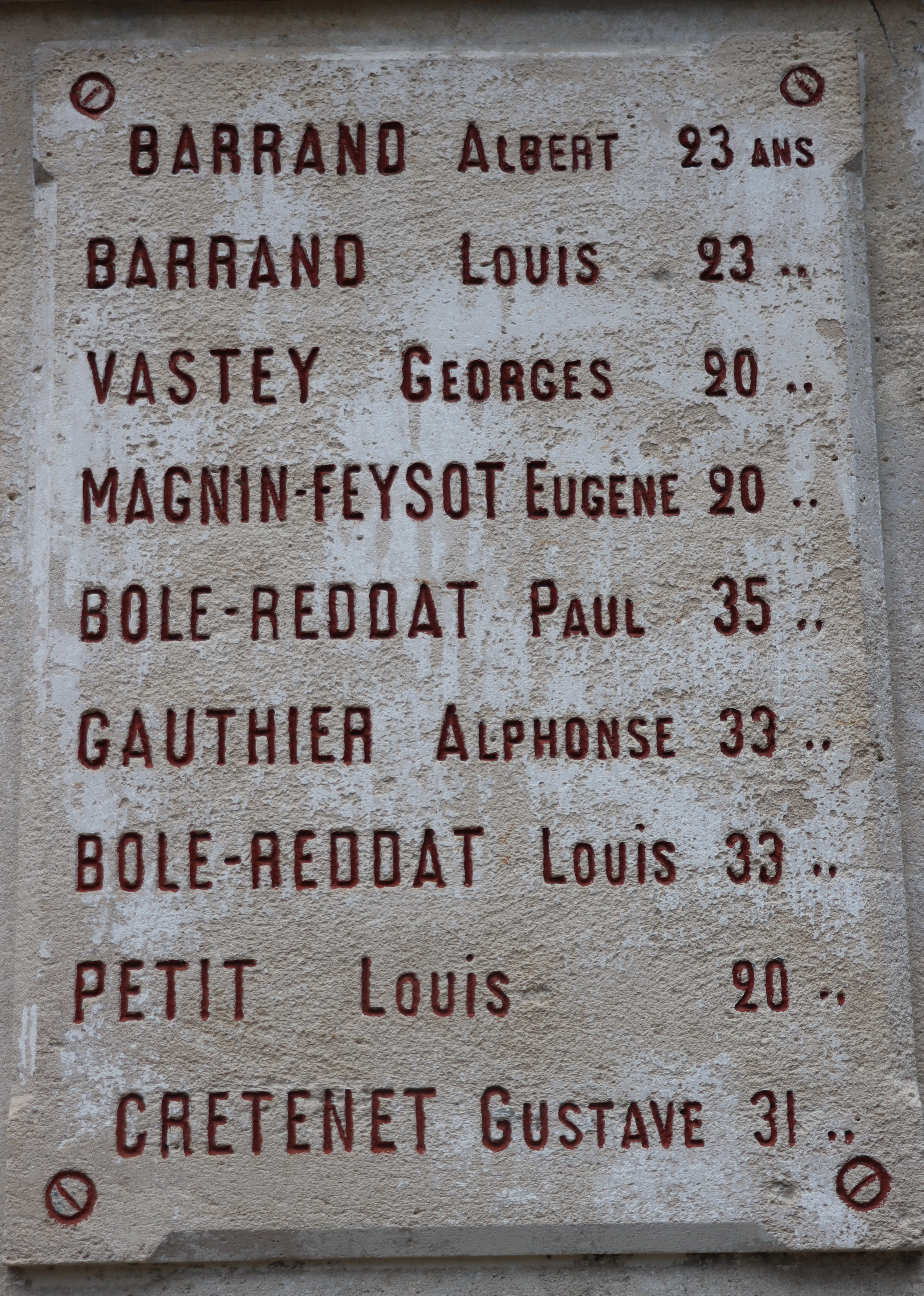 Auf dem Kriegerdenkmal der 160 Einwohner Gemeinde auf einer Fläche von 9,91 Km2 im Departement Doubs (F) sind alle 12 erwähnten Kriegsopfer mit Fabian Coulot verwandt.