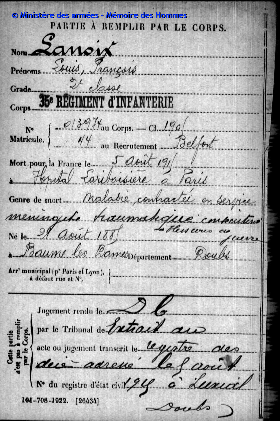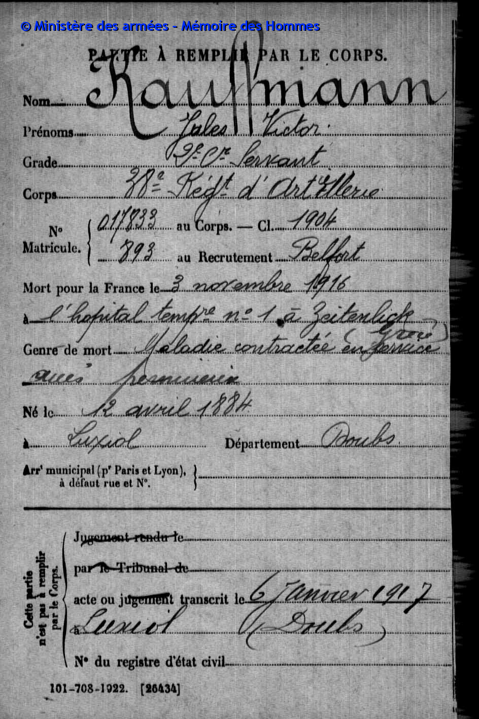 Verstarb durch Krankheit im Hôpital temporaire