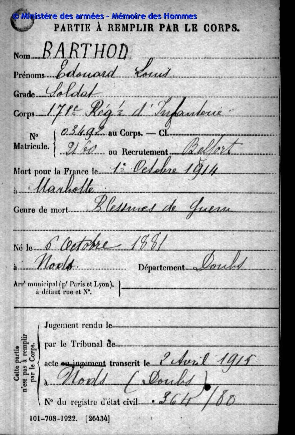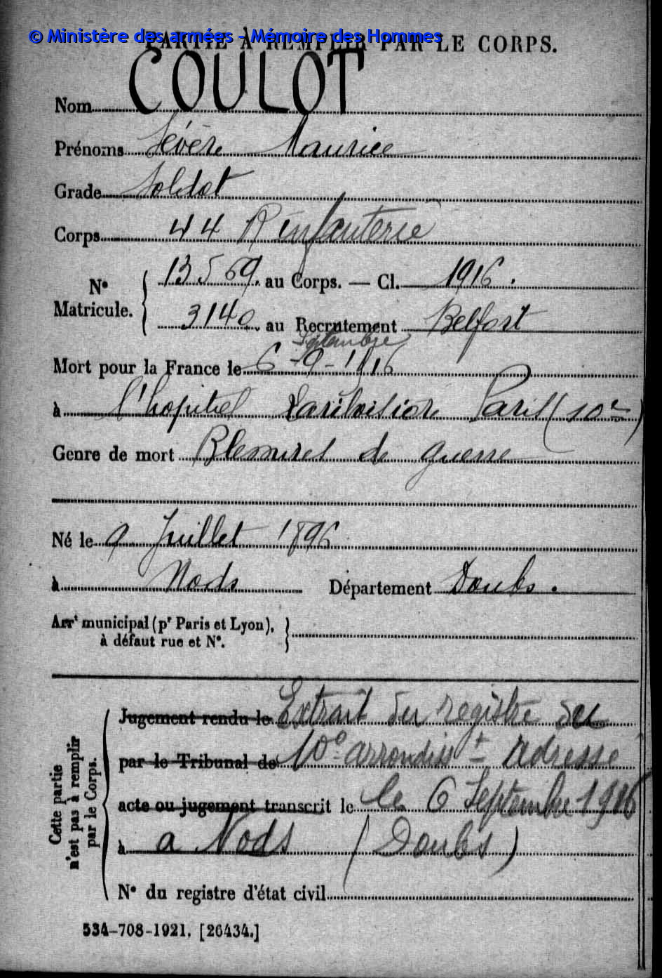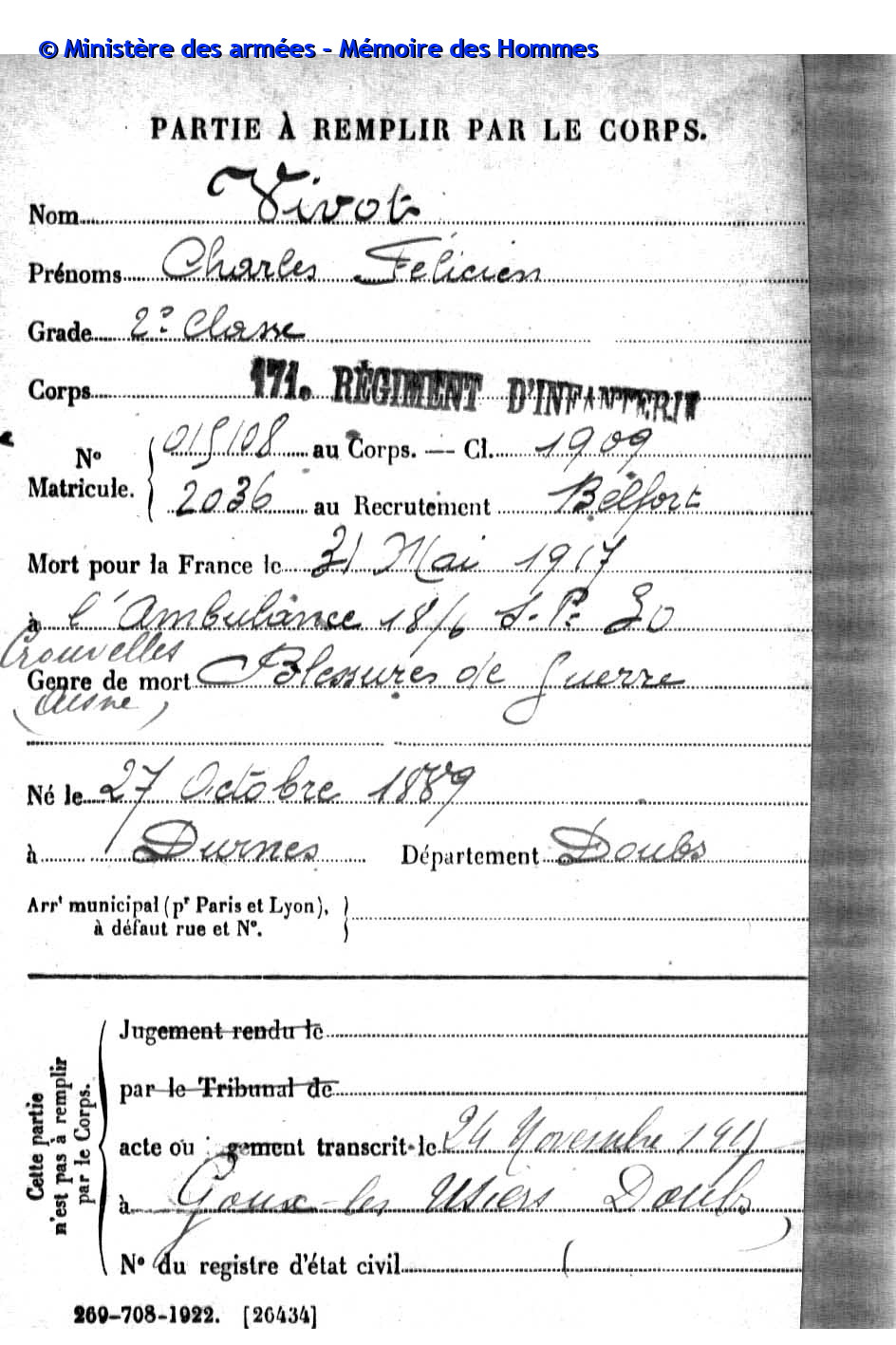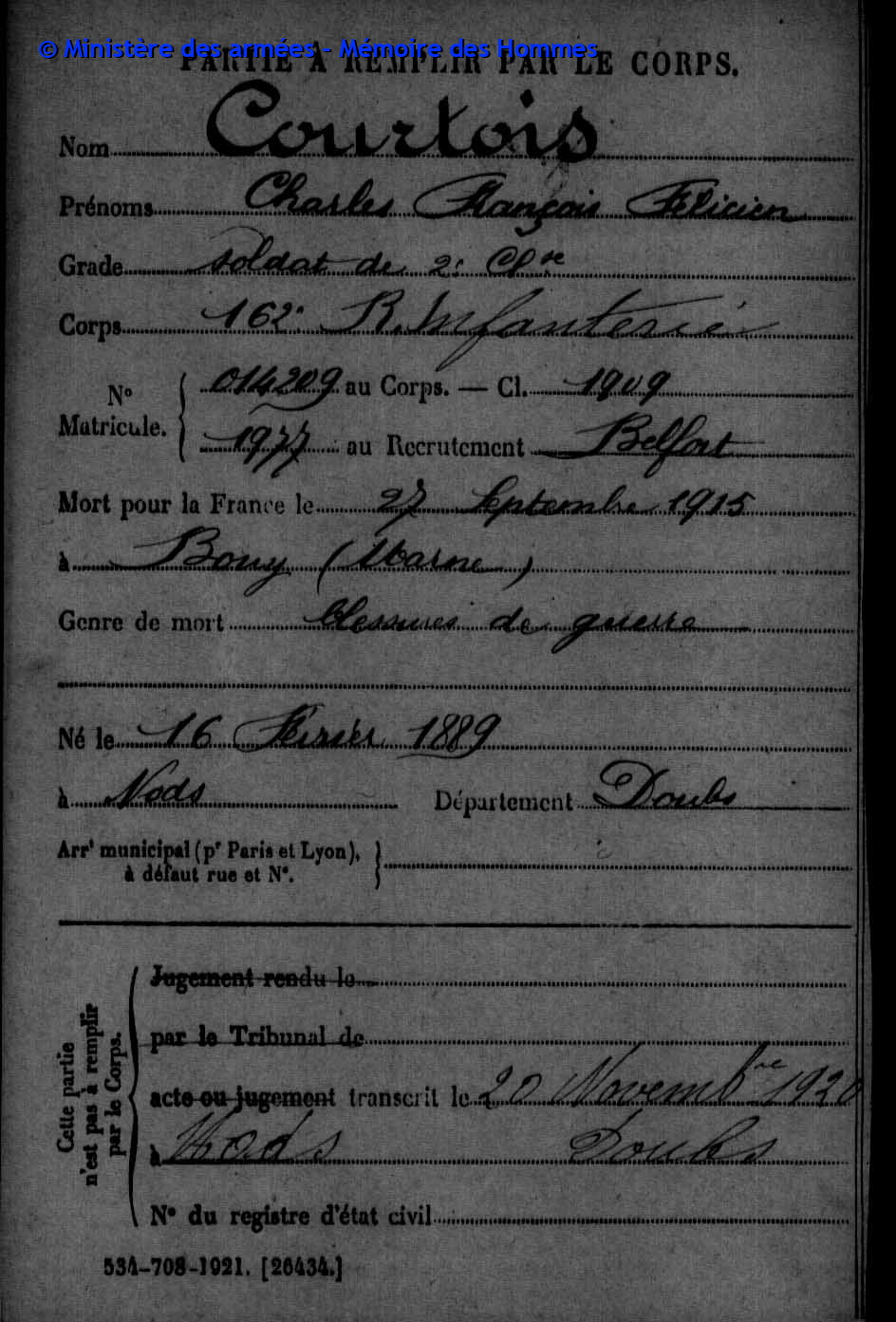 | Soldat COURTOIS Jean Marie Alfred 30.07.1894 - 17.06.1919 171ème Régiment d'Infanterie Verstarb durch Krankheit an Spätfolgen zu Hause in Nods (F) |