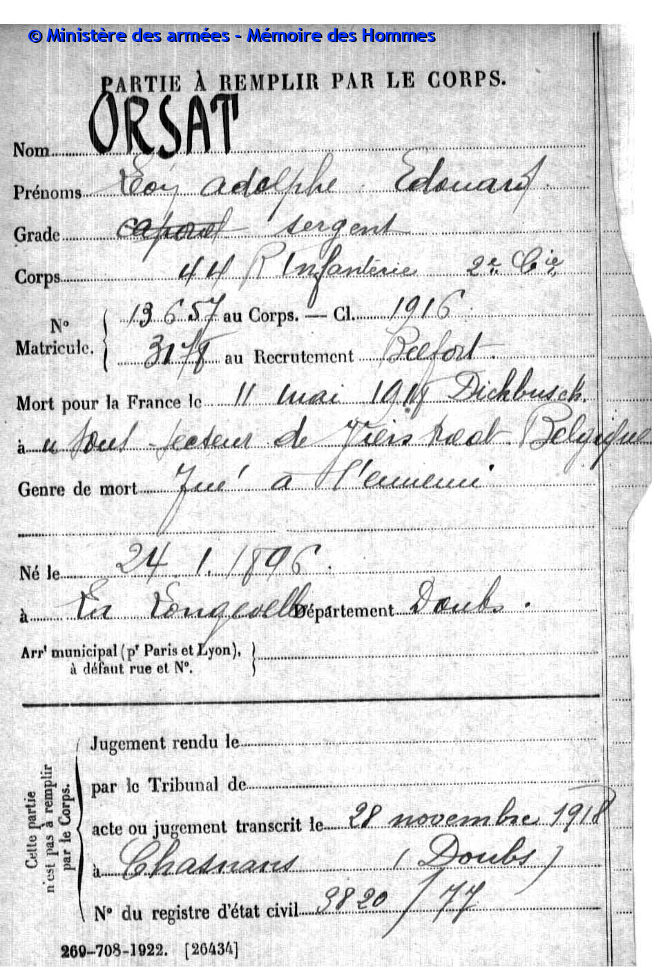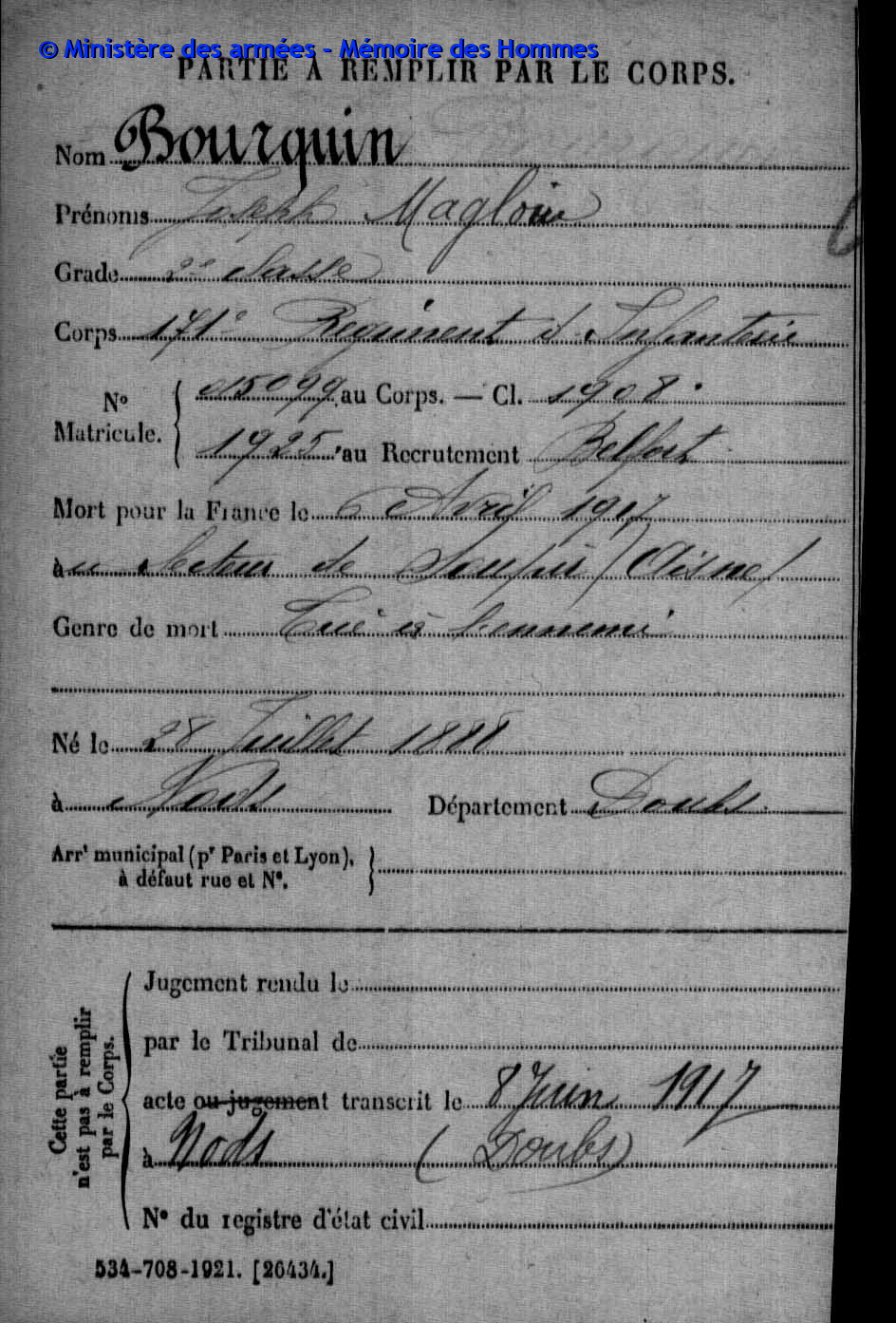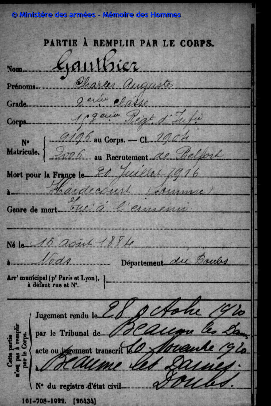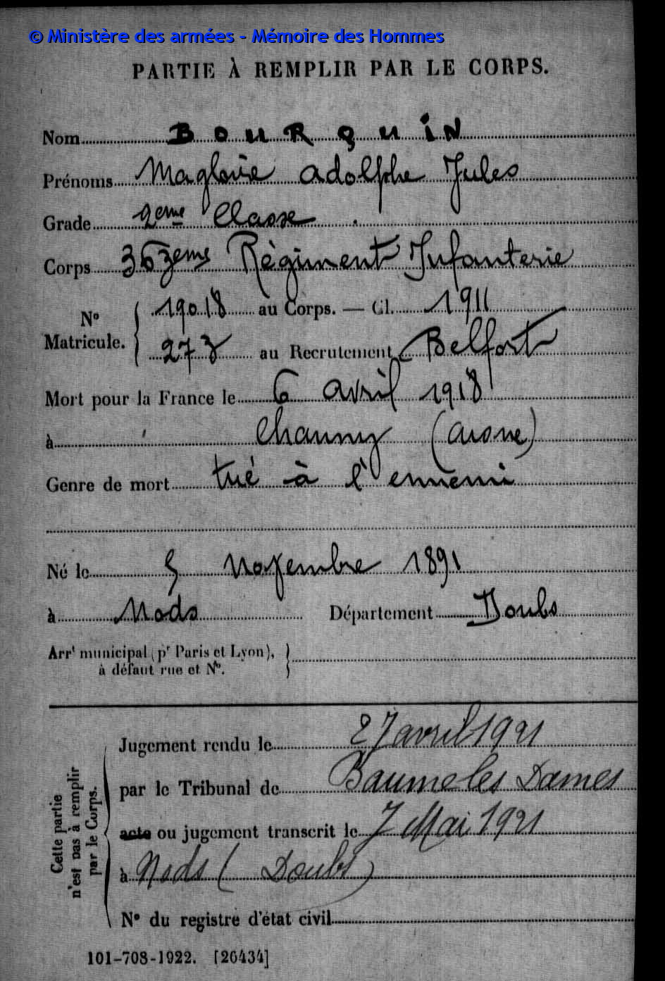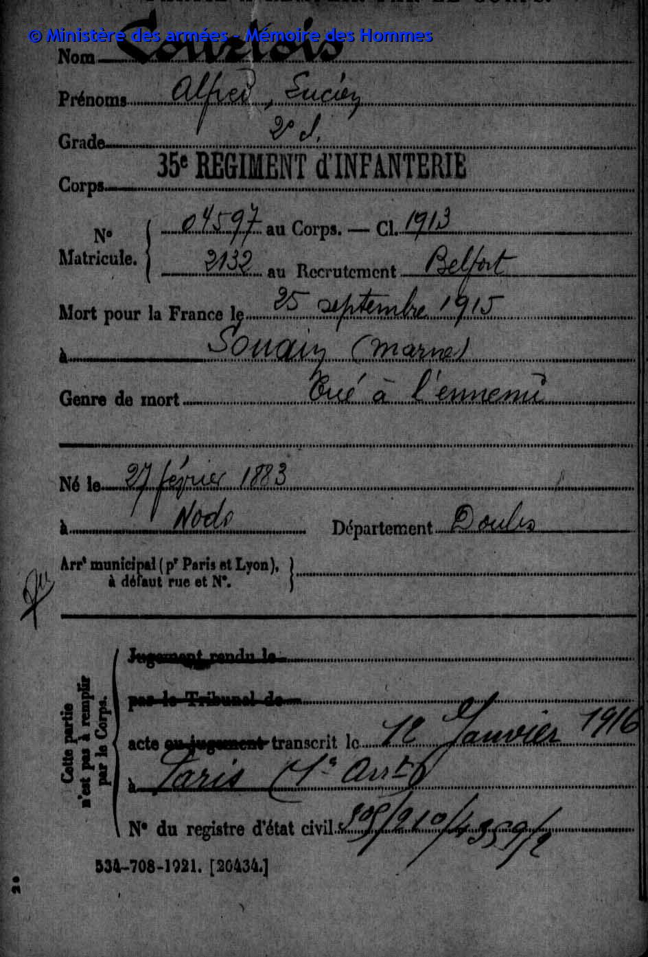 | Soldat COURTOIS Jean Marie Alfred 30.07.1894 - 17.06.1919 171ème Régiment d'Infanterie Verstarb durch Krankheit an Spätfolgen zu Hause in Nods (F) |