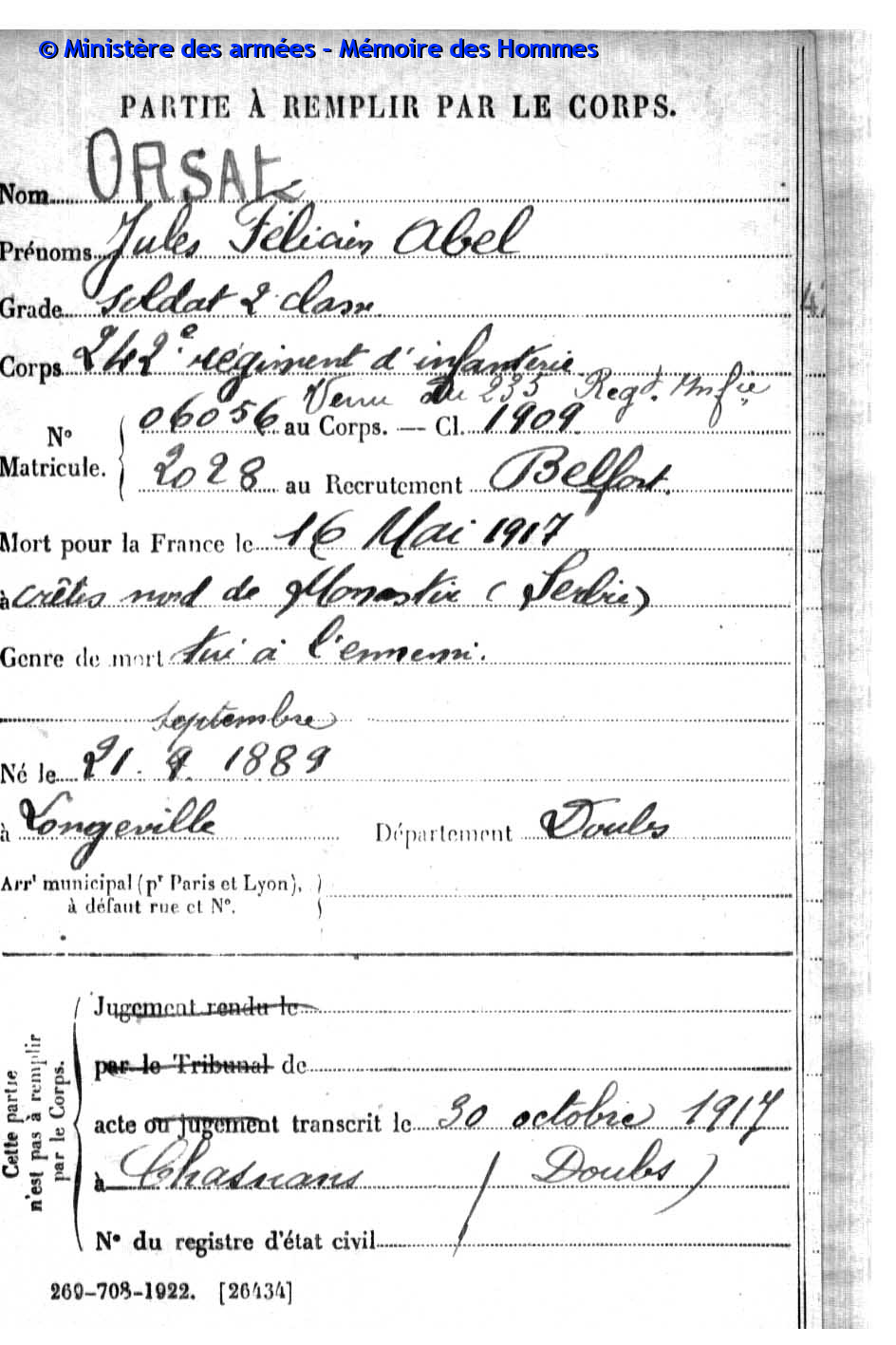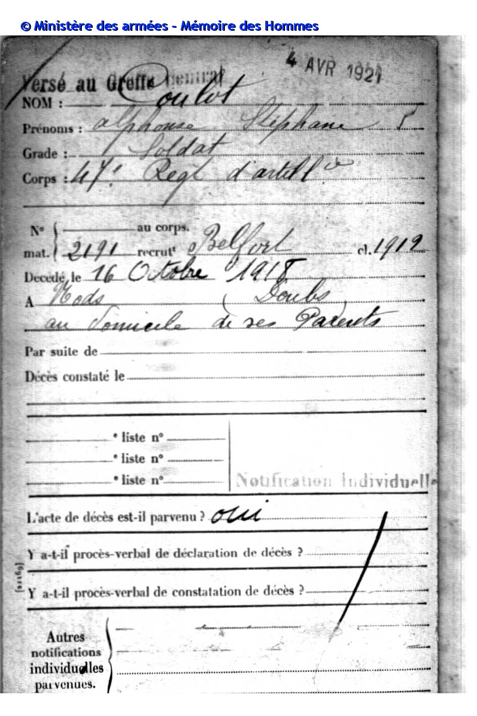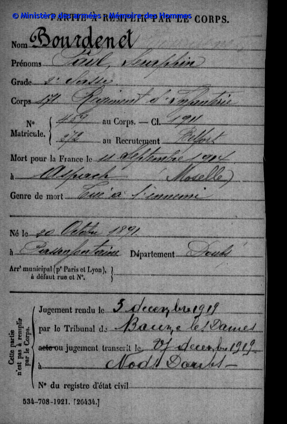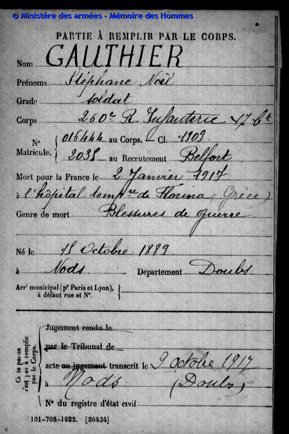 | Soldat COURTOIS Jean Marie Alfred 30.07.1894 - 17.06.1919 171ème Régiment d'Infanterie Verstarb durch Krankheit an Spätfolgen zu Hause in Nods (F) |