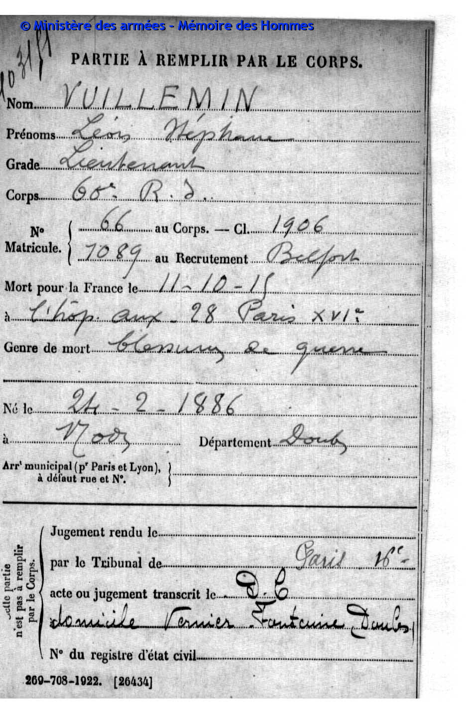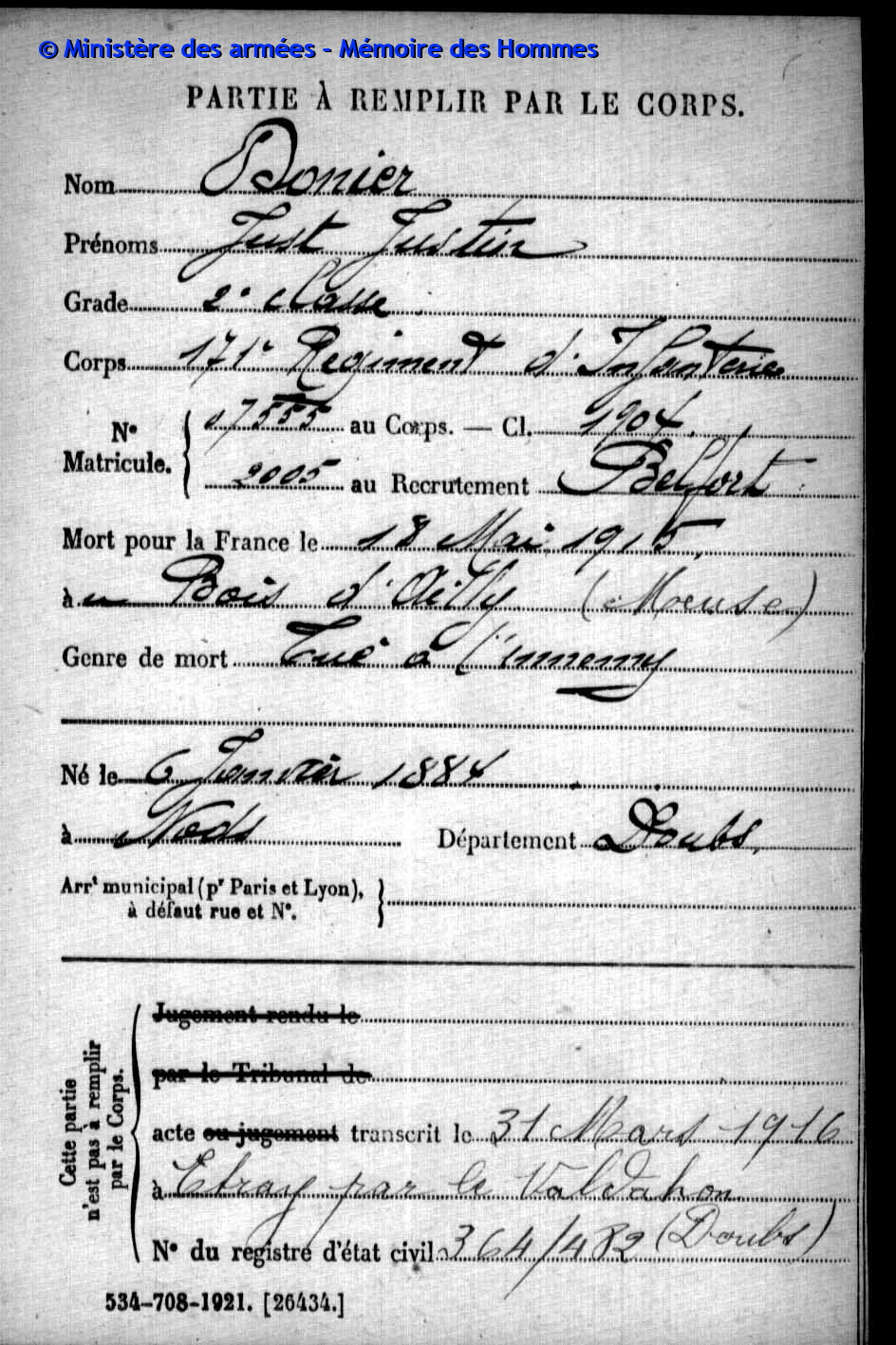 | Caporal DONIER Marius Charles 03.02.1889 - 14.10.1916 171ème Régiment d'Infanterie Im Militärdient verunfallt in Charvoux (F) |
