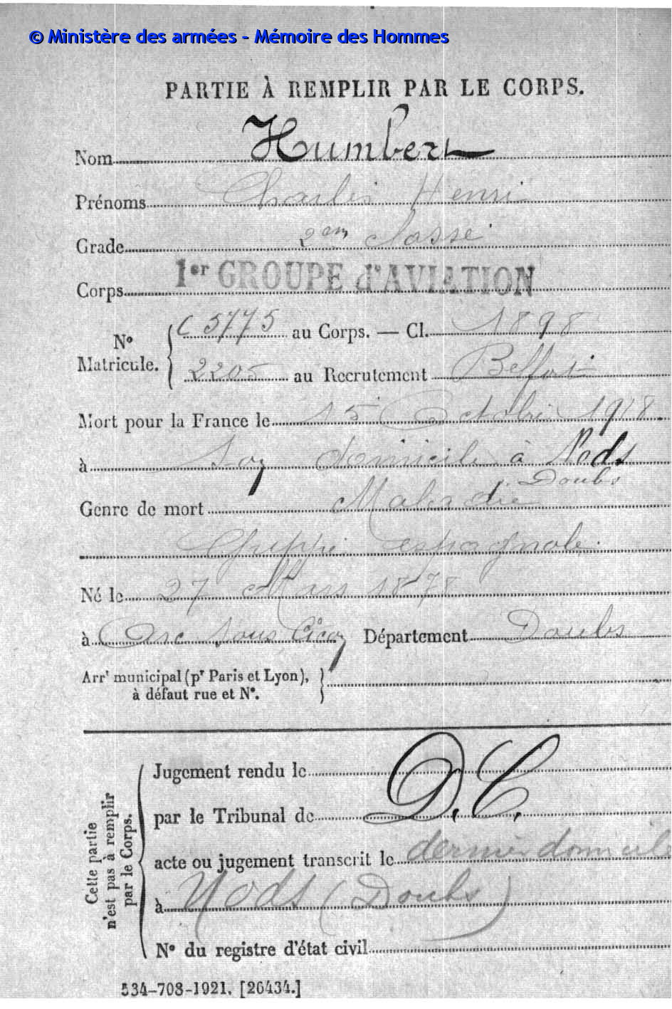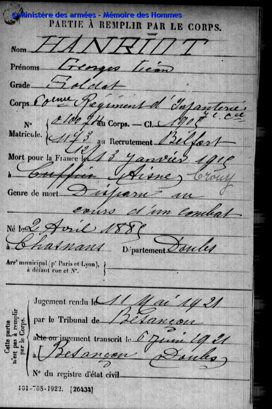 | Soldat HANRIOT Georges Léon 02.04.1885 - 13.01.1915 60ème Régiment d'Infanterie Gilt als vermisst im Raum Cuffies (F) |