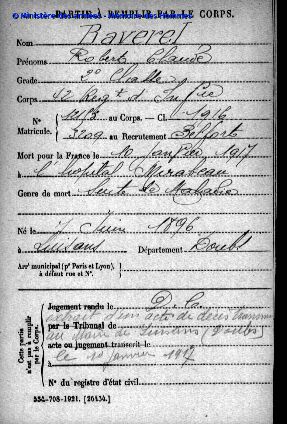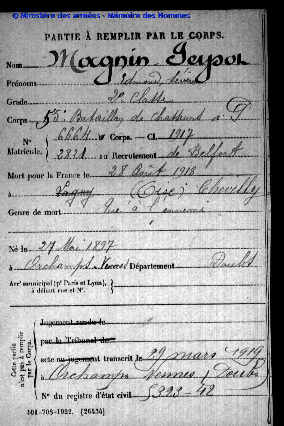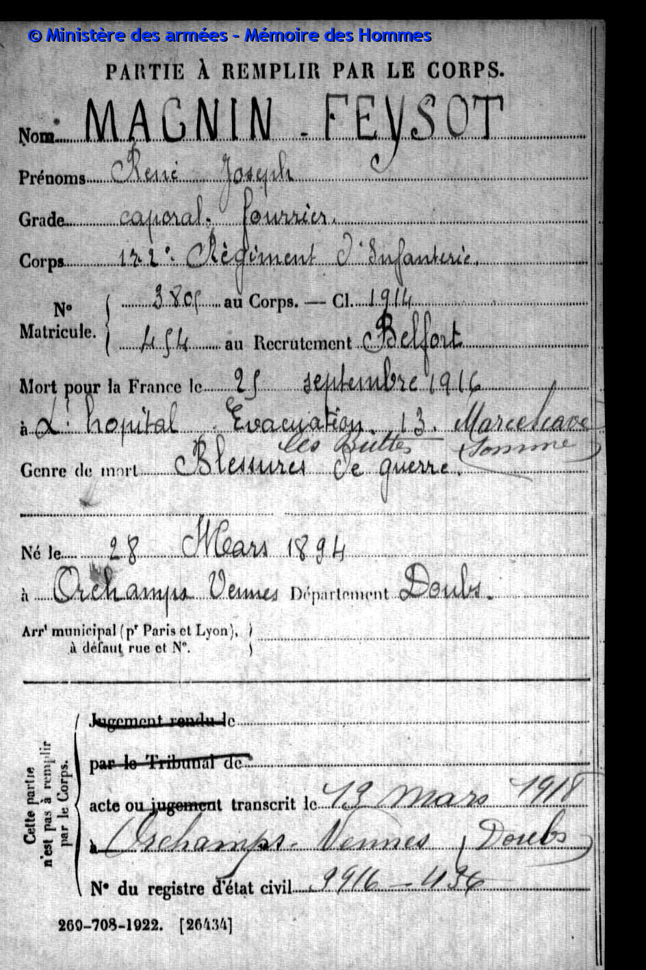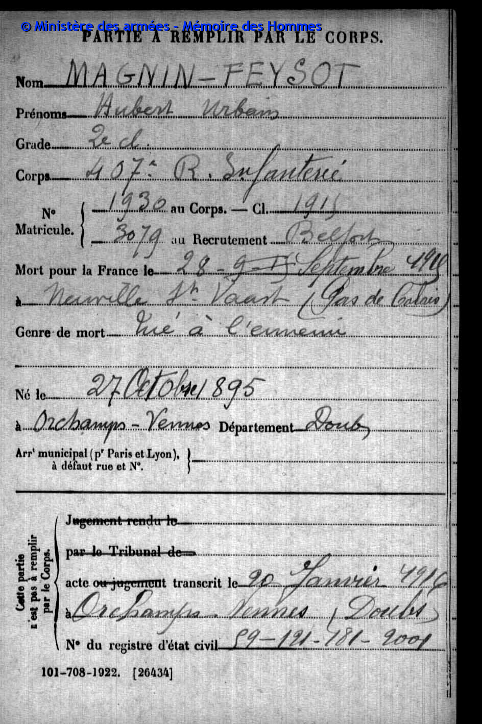 2ème classe MAGNIN-FEYSOT Hubert Urbain 27.10.1895 - 28.09.1915 407ème Régiment d'Infanterie Gefallen in Neuville-Saint-Vaast (F) |