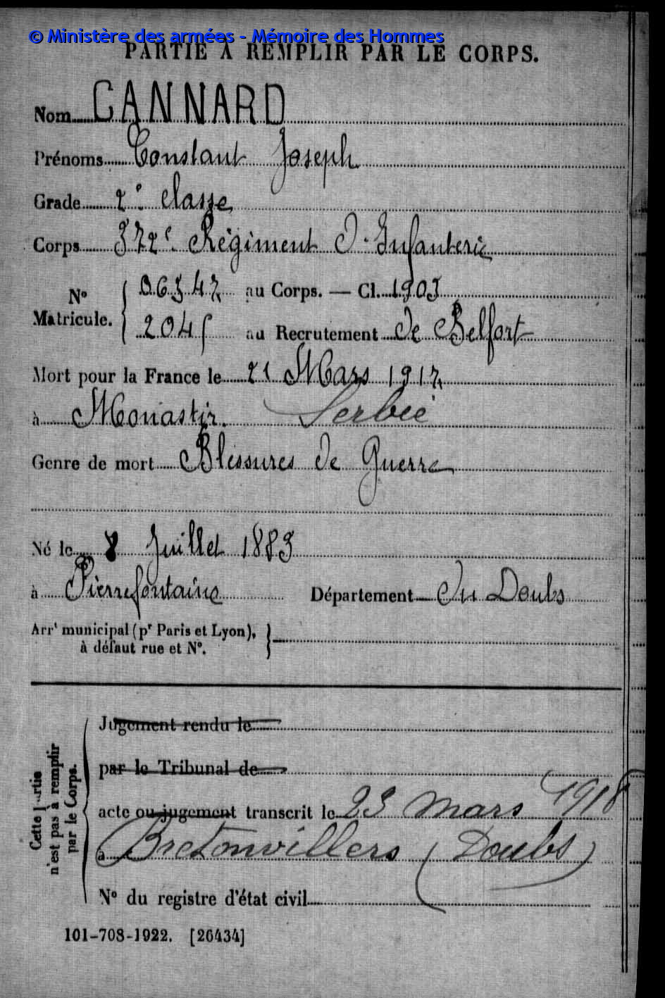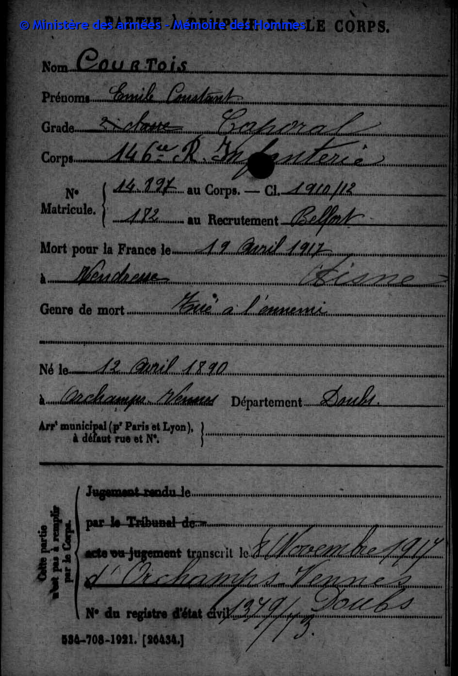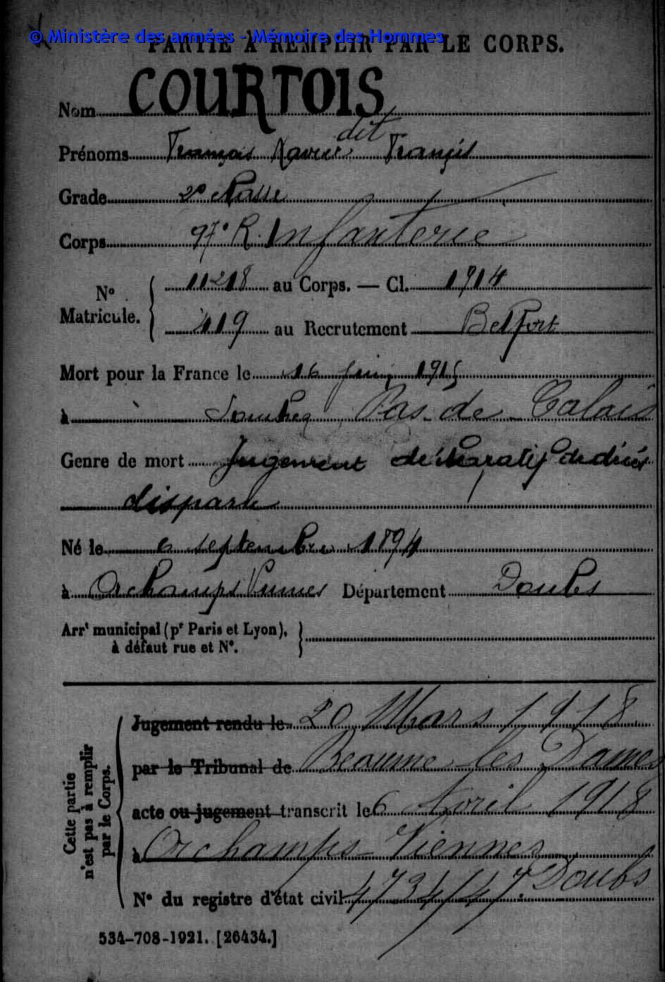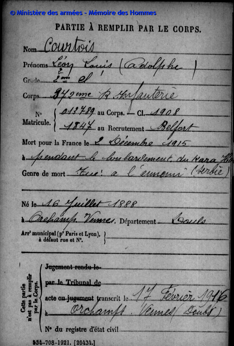 | Soldat COURTOIS Léon Louis Adolphe 16.07.1888 - 02.12.1915 372ème Régiment d'Infanterie Gefallen in Kara Hodzali (Serbien) |