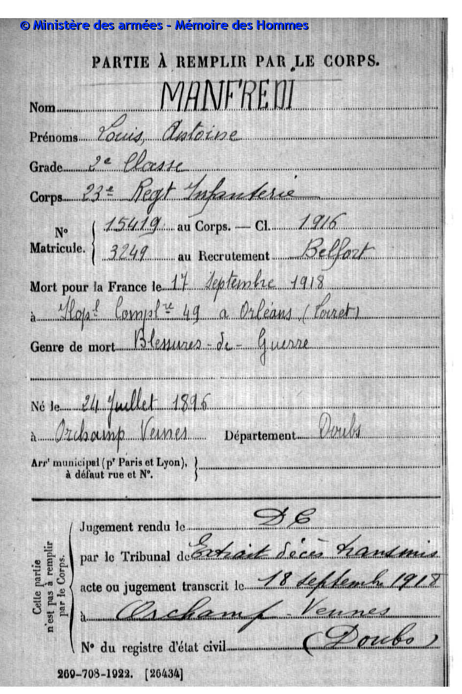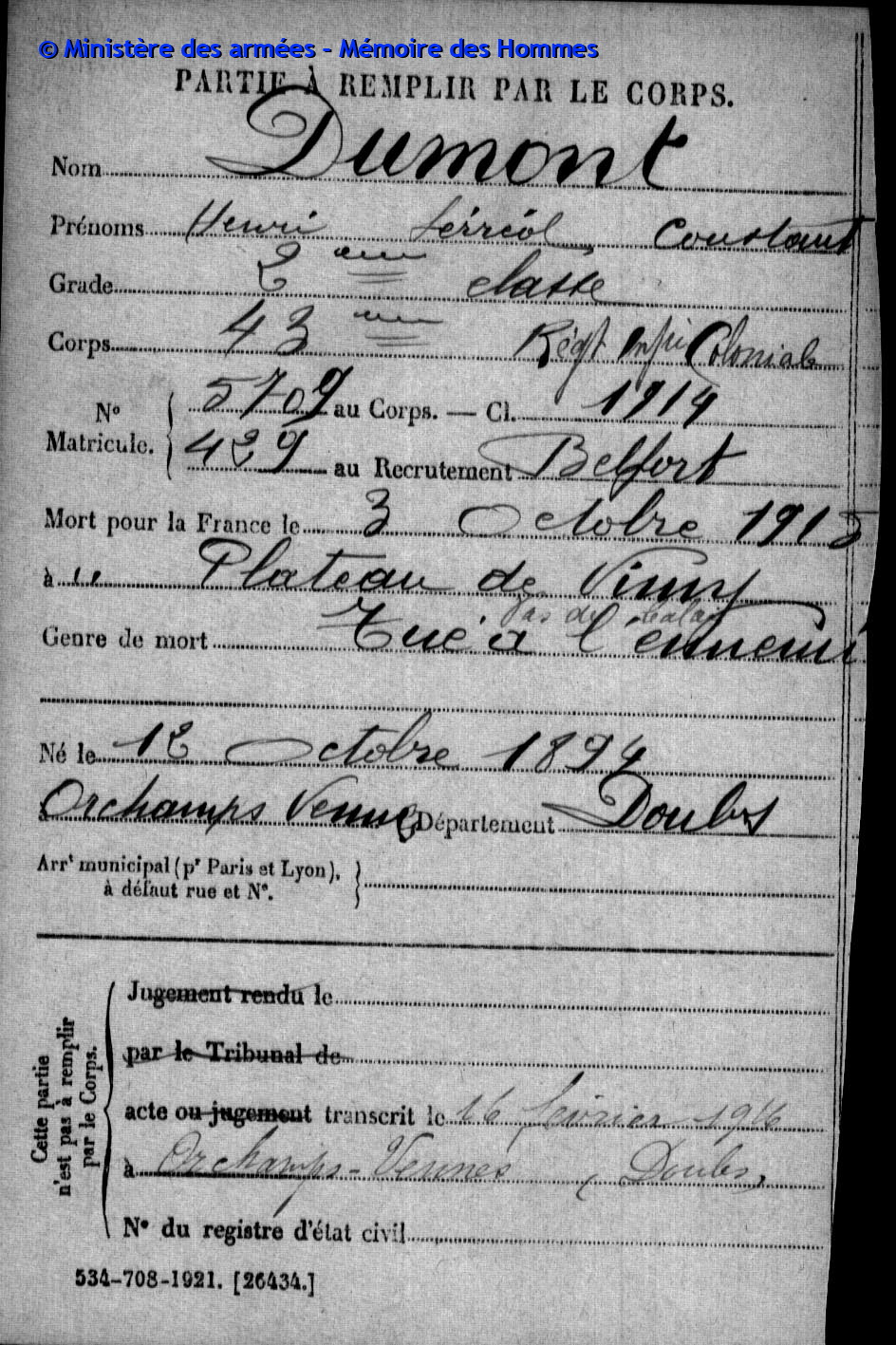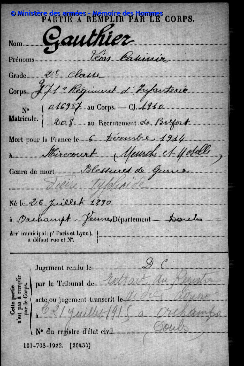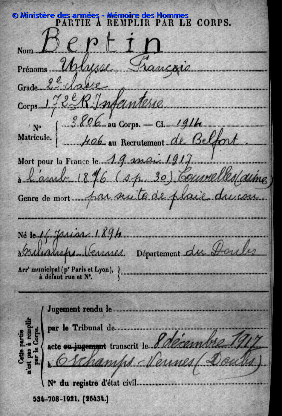 | Soldat COURTOIS Léon Louis Adolphe 16.07.1888 - 02.12.1915 372ème Régiment d'Infanterie Gefallen in Kara Hodzali (Serbien) |