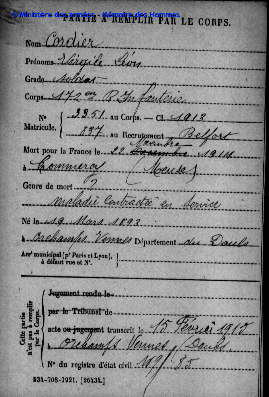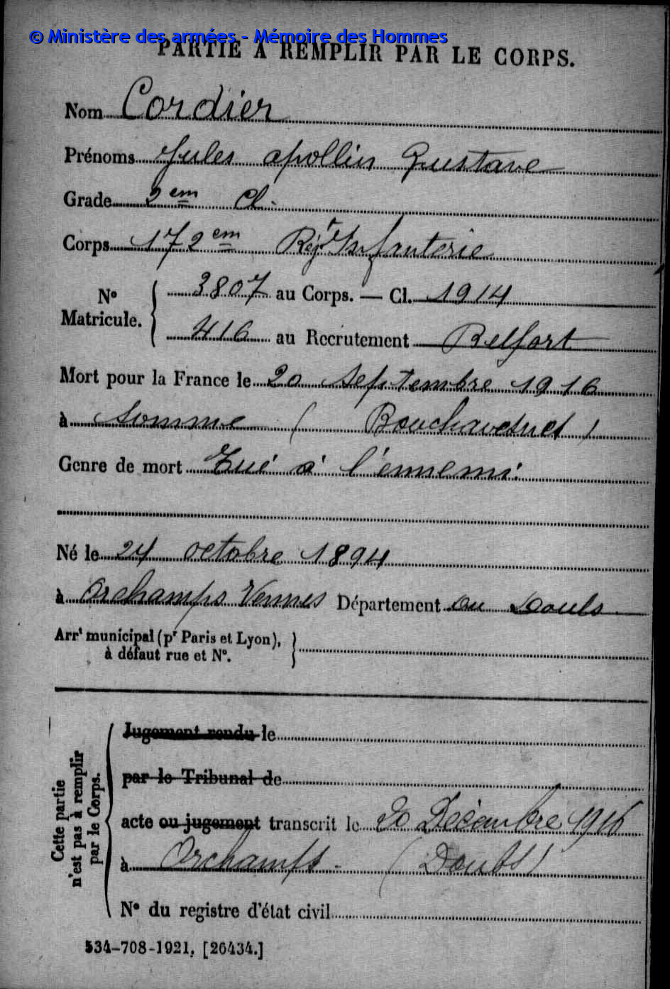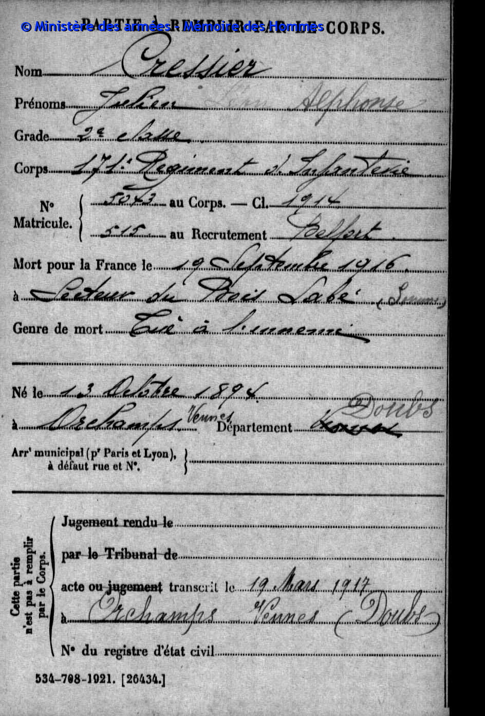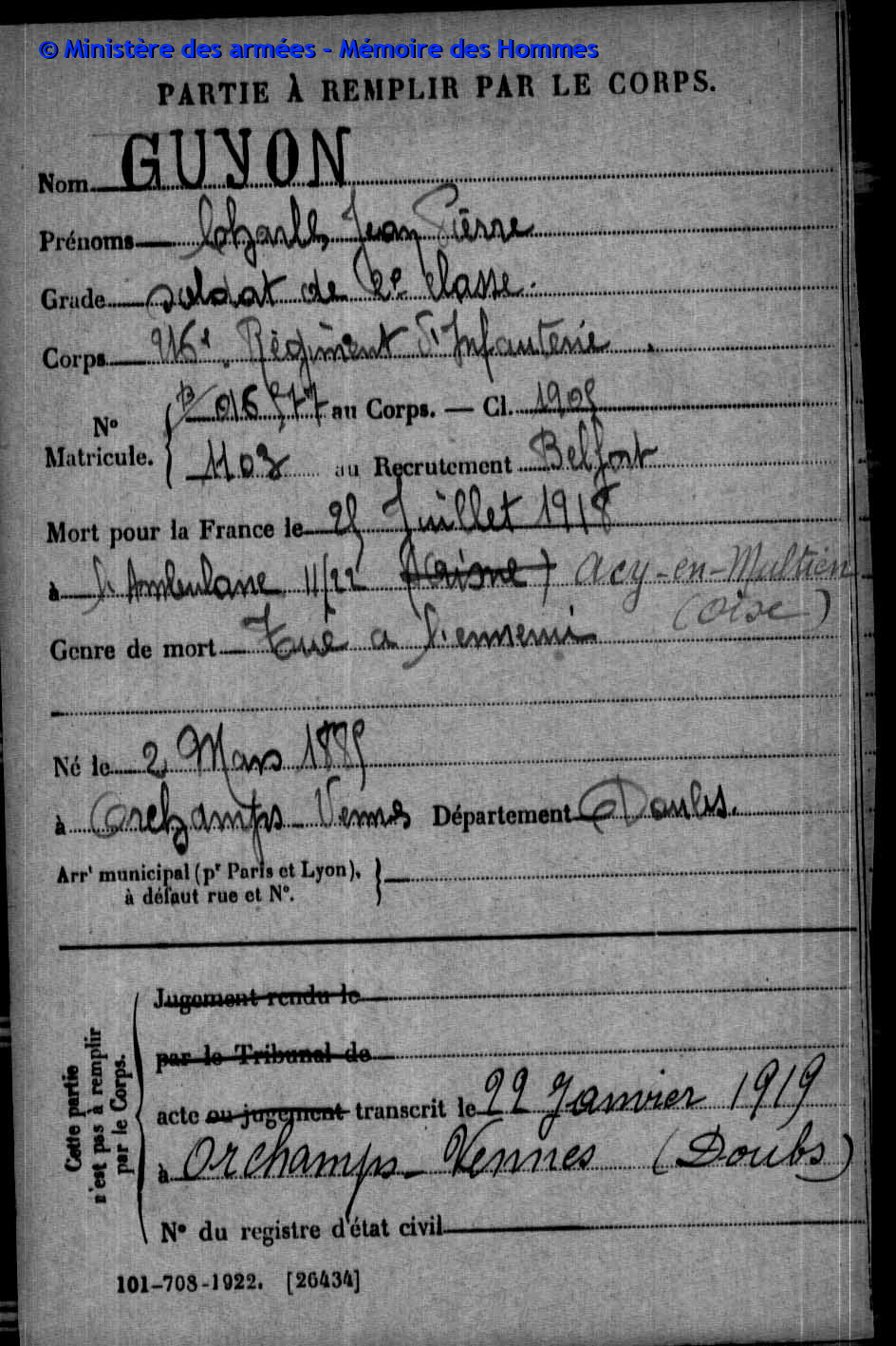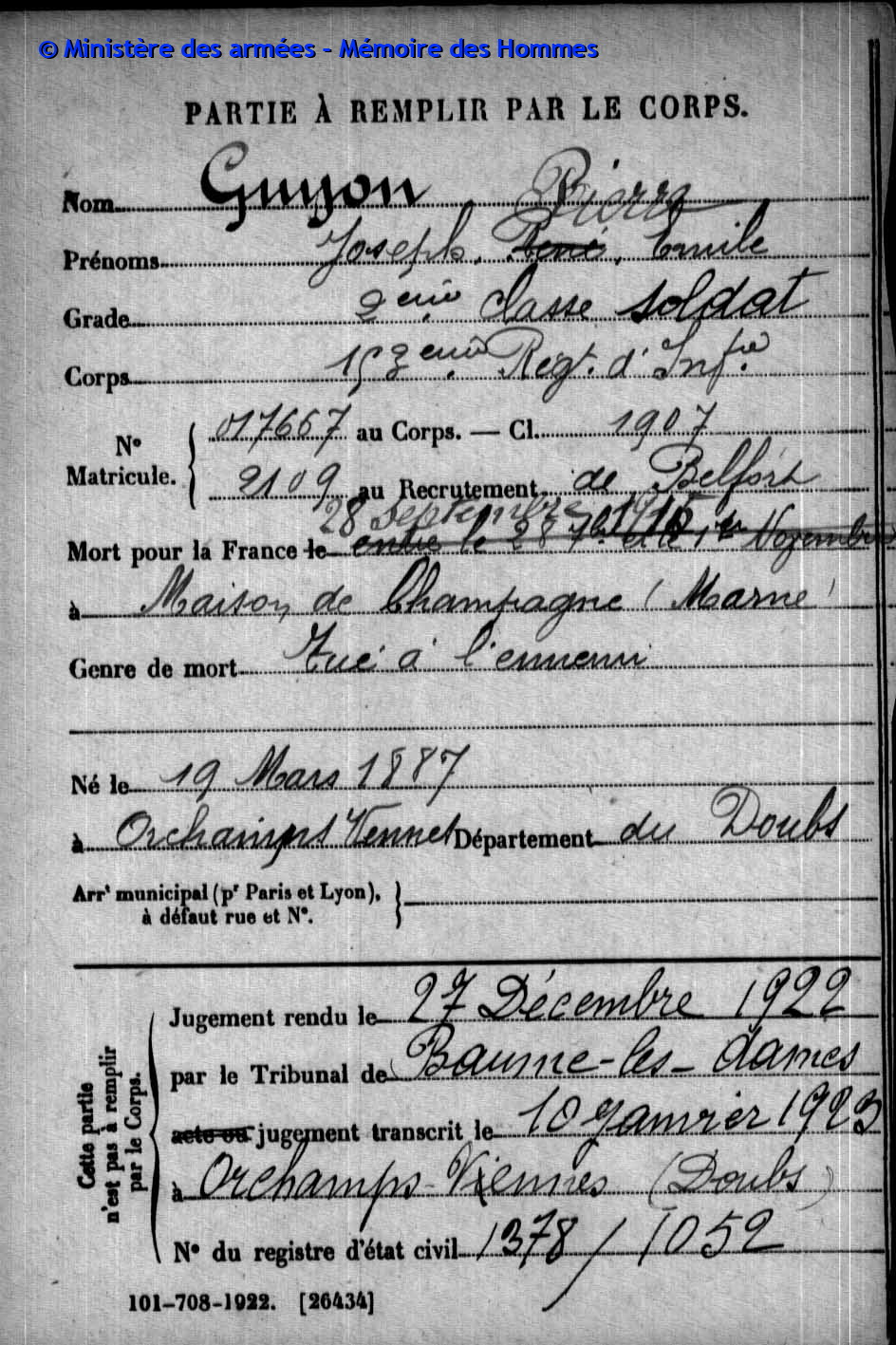 | Soldat GUYON Joseph Pierre Emile 19.03.1887 - 28.09.1915 153ème Régiment d'Infanterie Gefallen in Maison de Champagne in Le Mesnil-lès-Hurlus (F) |