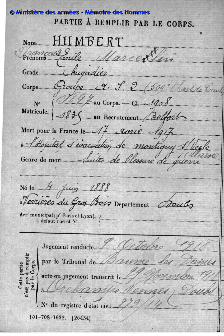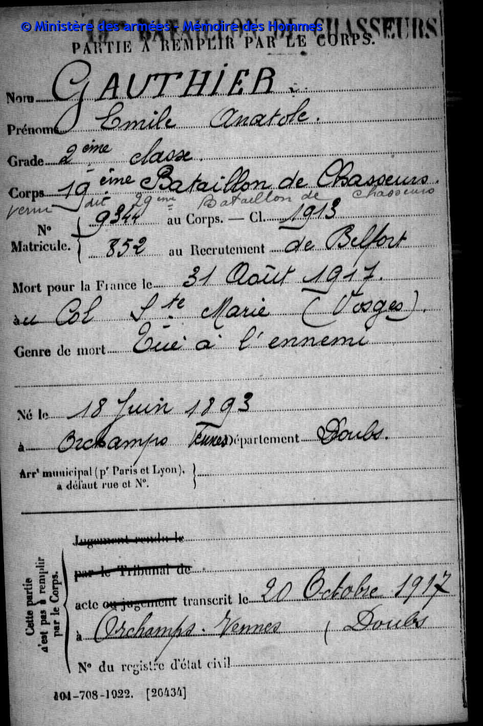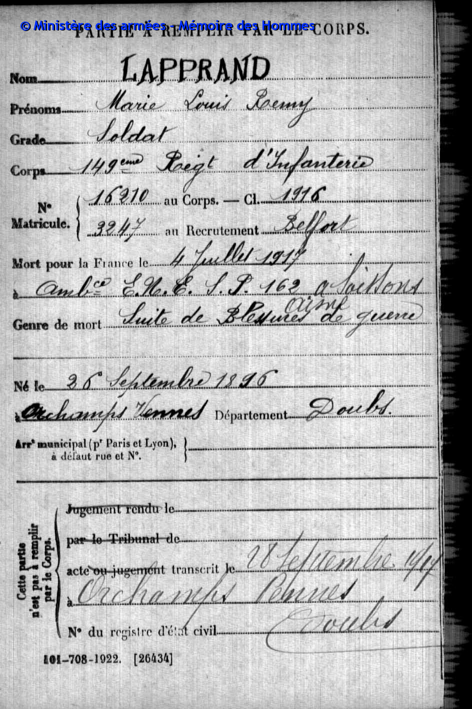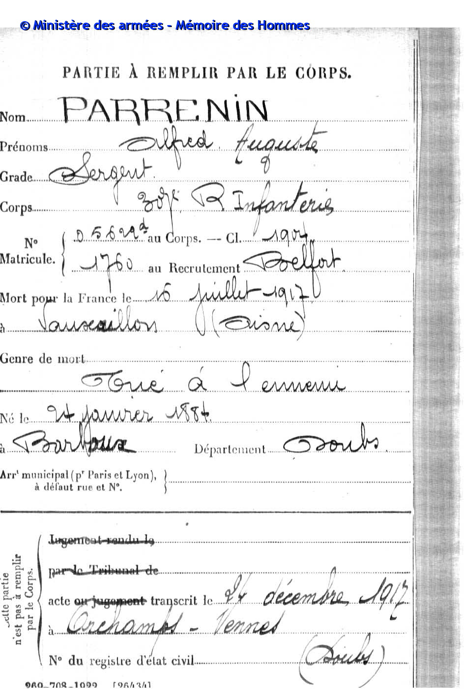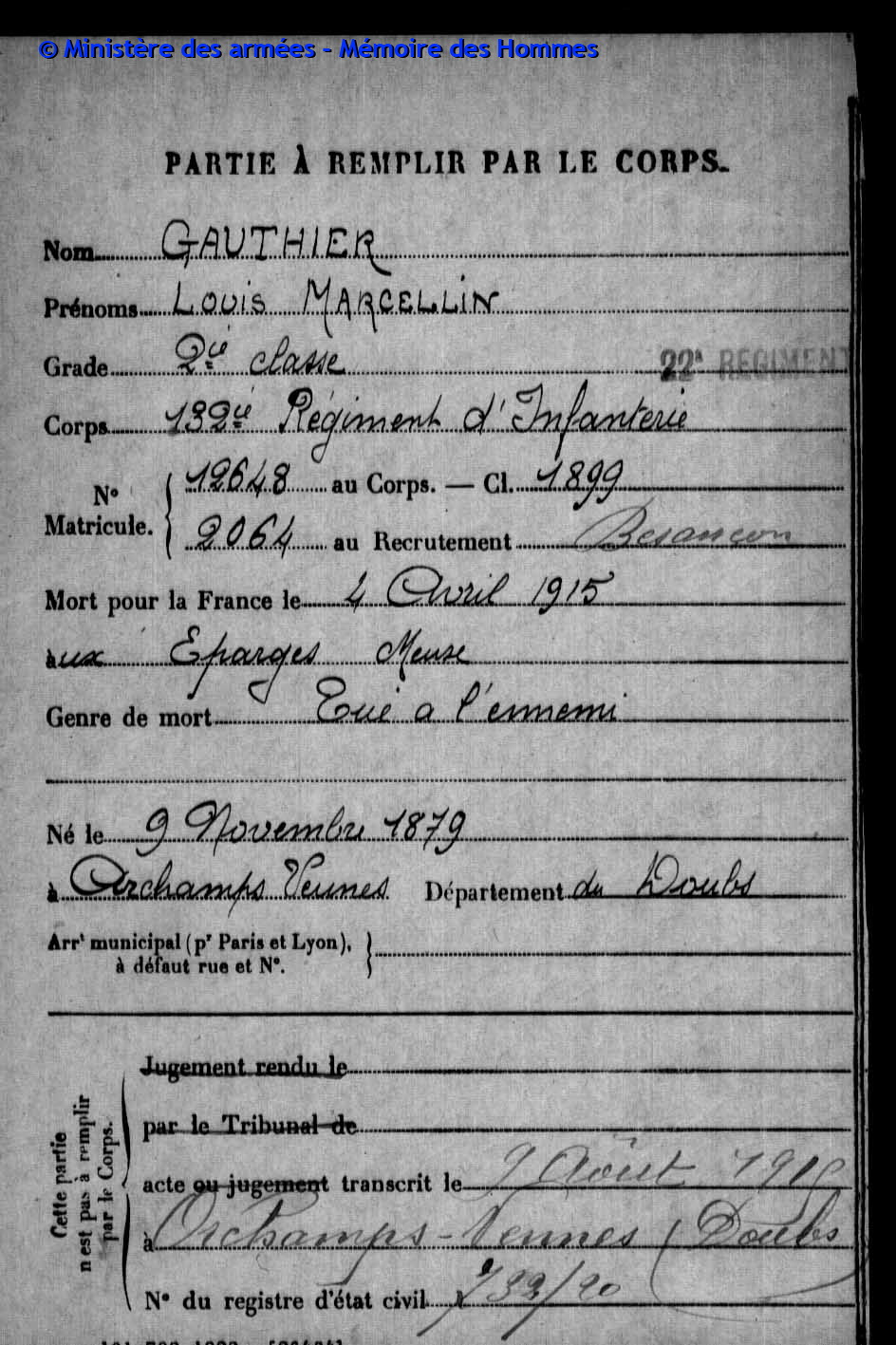 | Soldat GUYON Joseph Pierre Emile 19.03.1887 - 28.09.1915 153ème Régiment d'Infanterie Gefallen in Maison de Champagne in Le Mesnil-lès-Hurlus (F) |