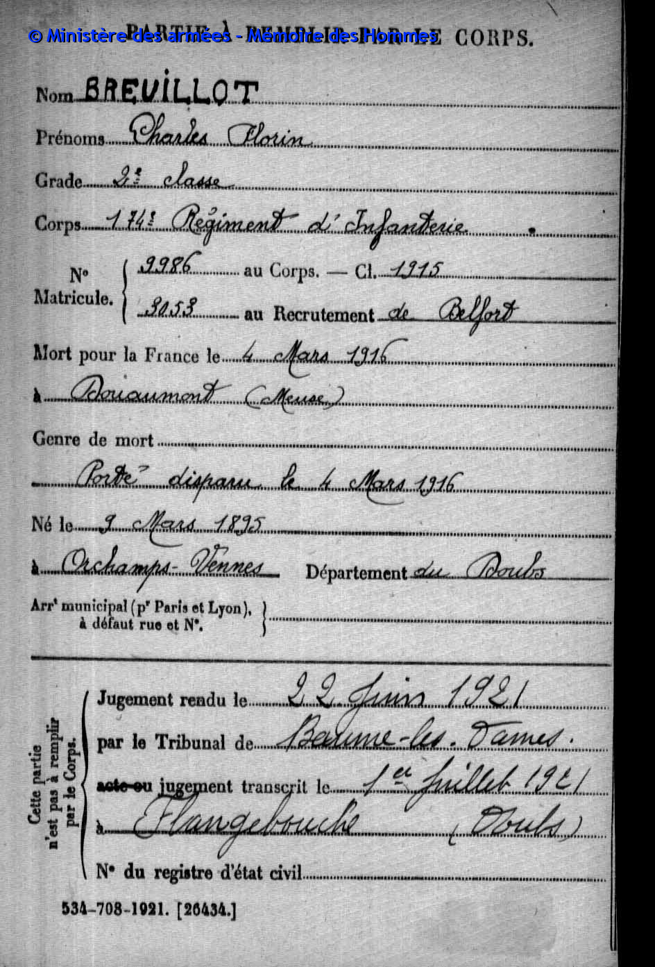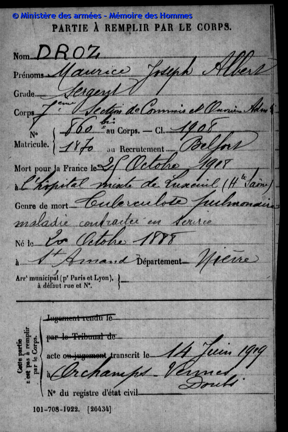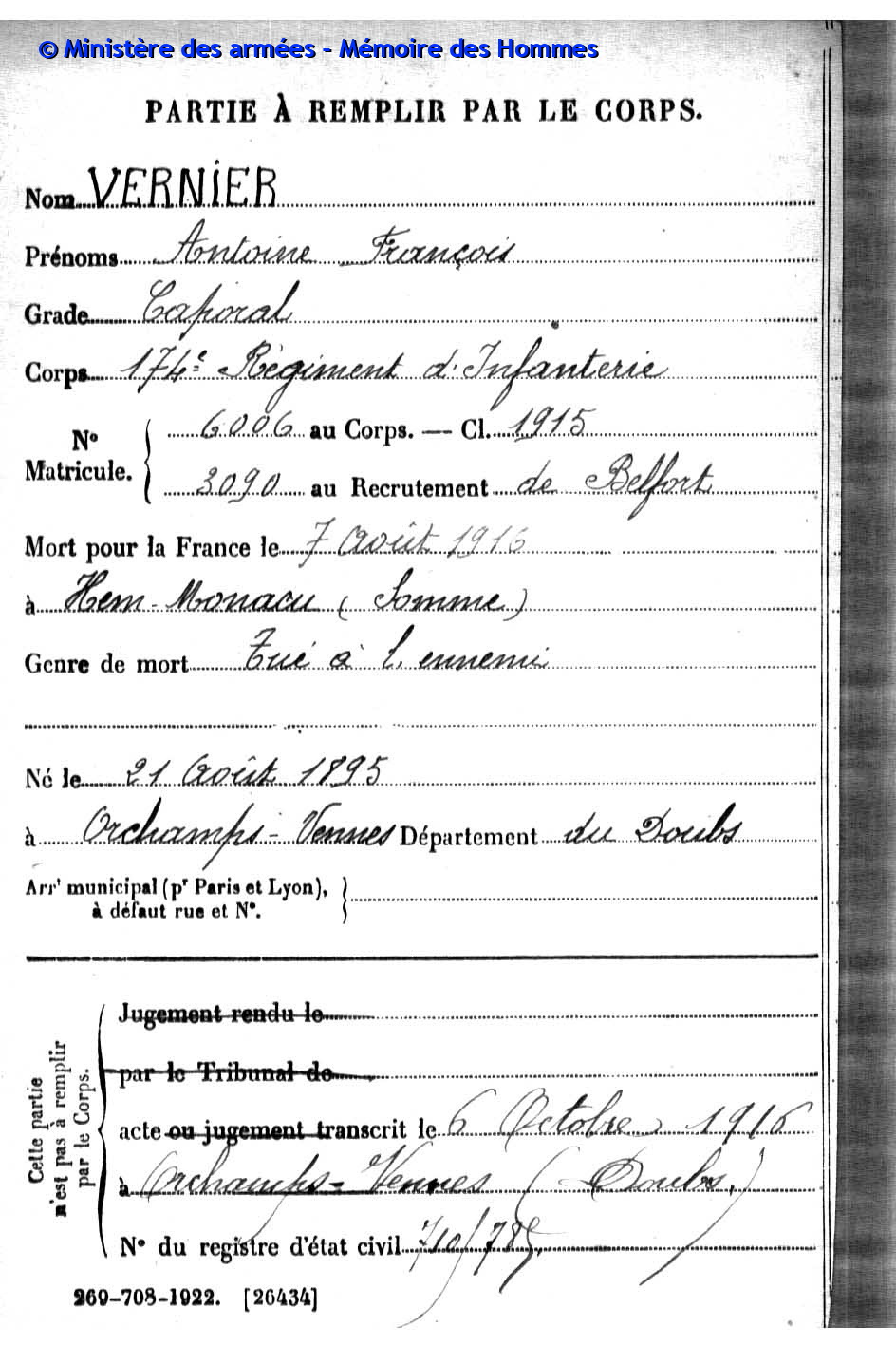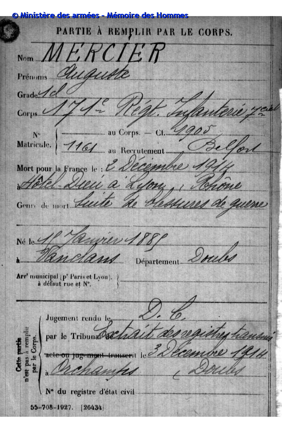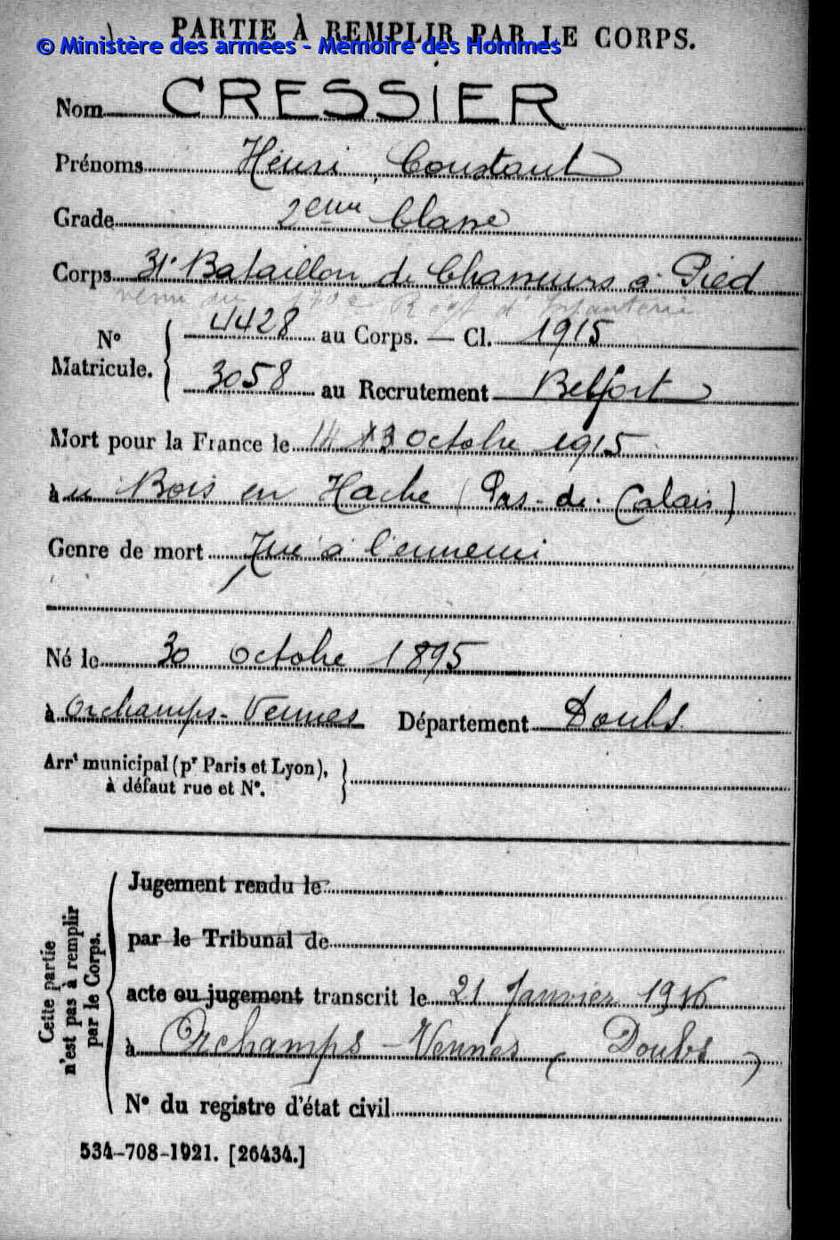 | Soldat GUYON Joseph Pierre Emile 19.03.1887 - 28.09.1915 153ème Régiment d'Infanterie Gefallen in Maison de Champagne in Le Mesnil-lès-Hurlus (F) |