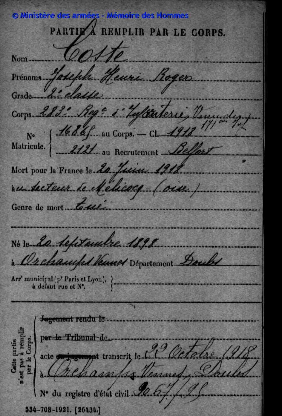 | Soldat COSTE Joseph Henri Roger 283ème Régiment d'Infanterie Gefallen in Mélicocq (F) Nécropole nationale in Remy (F) Block D, Grab 145 |